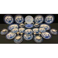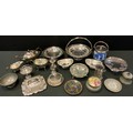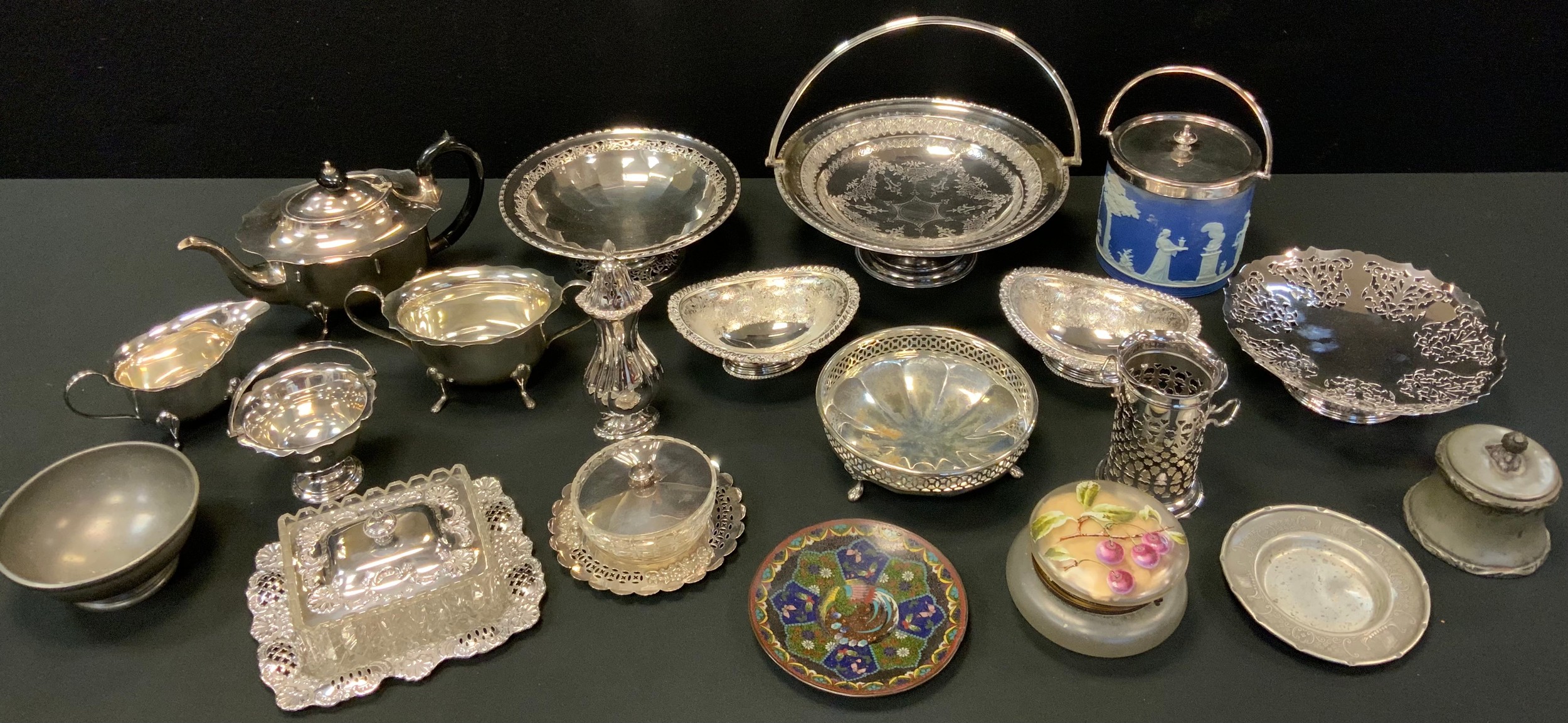 A silver plated three piece tea set; Victorian swing handle fruit basket, Wedgwood jasperware jar and cover; cloisonne plate etc