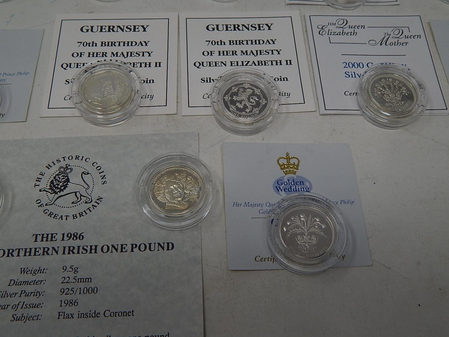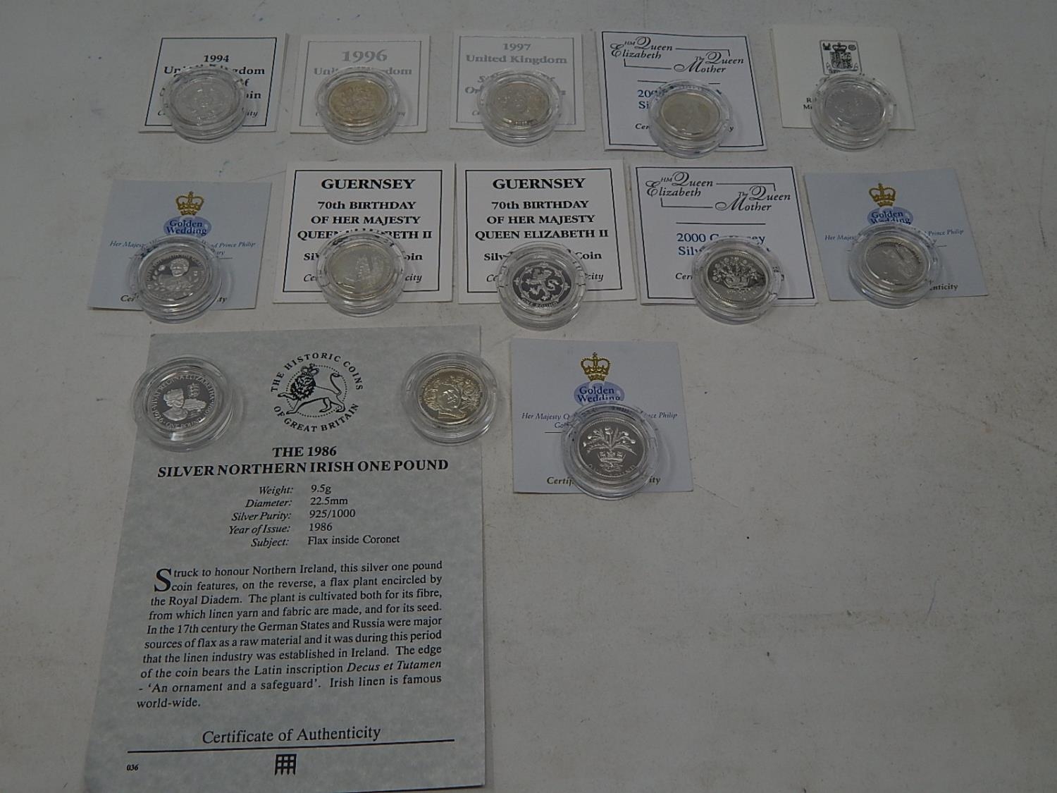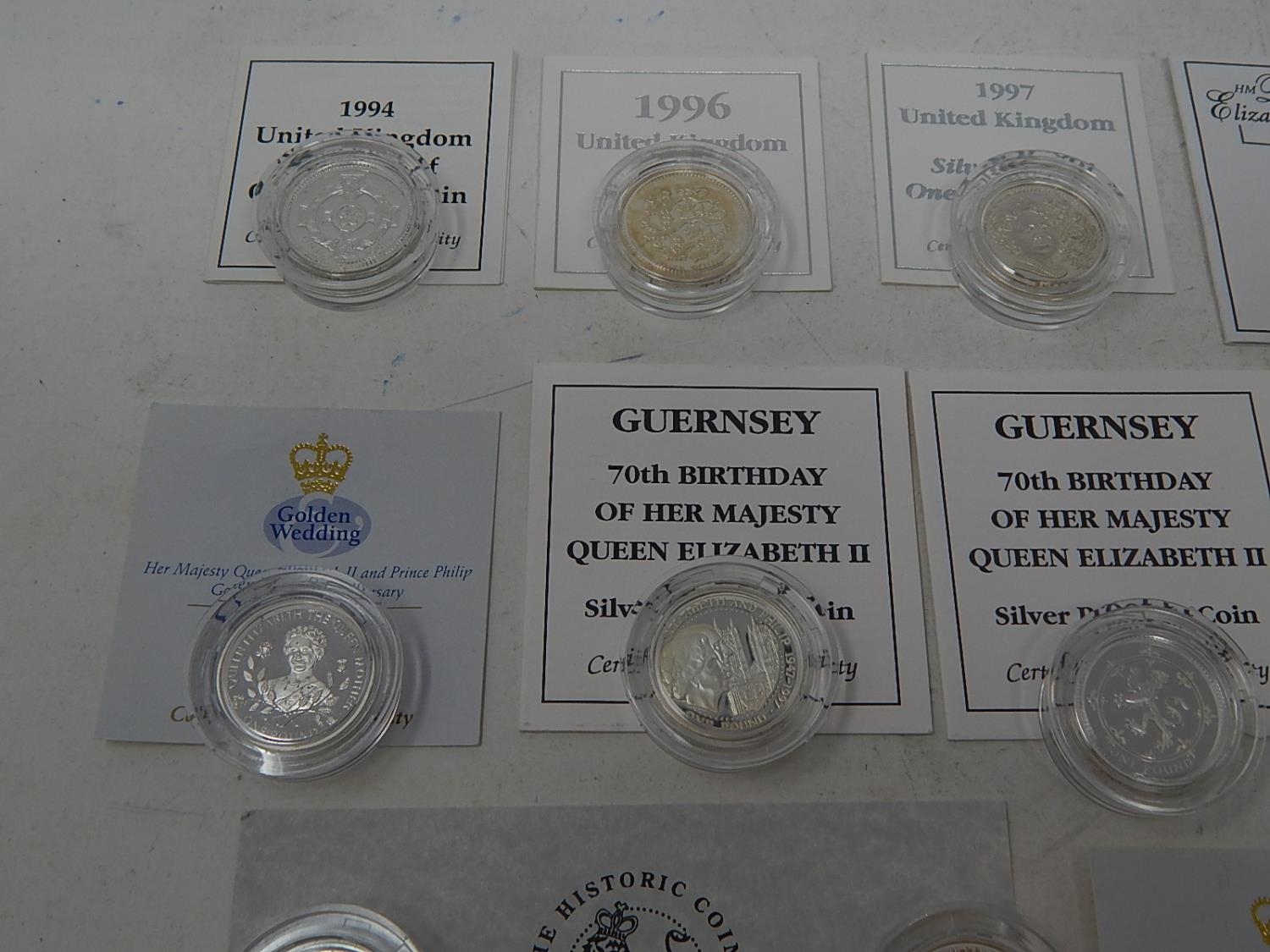 Collection of 13 x Silver Proof One Pound coins in capsules and COAs all about Mint State