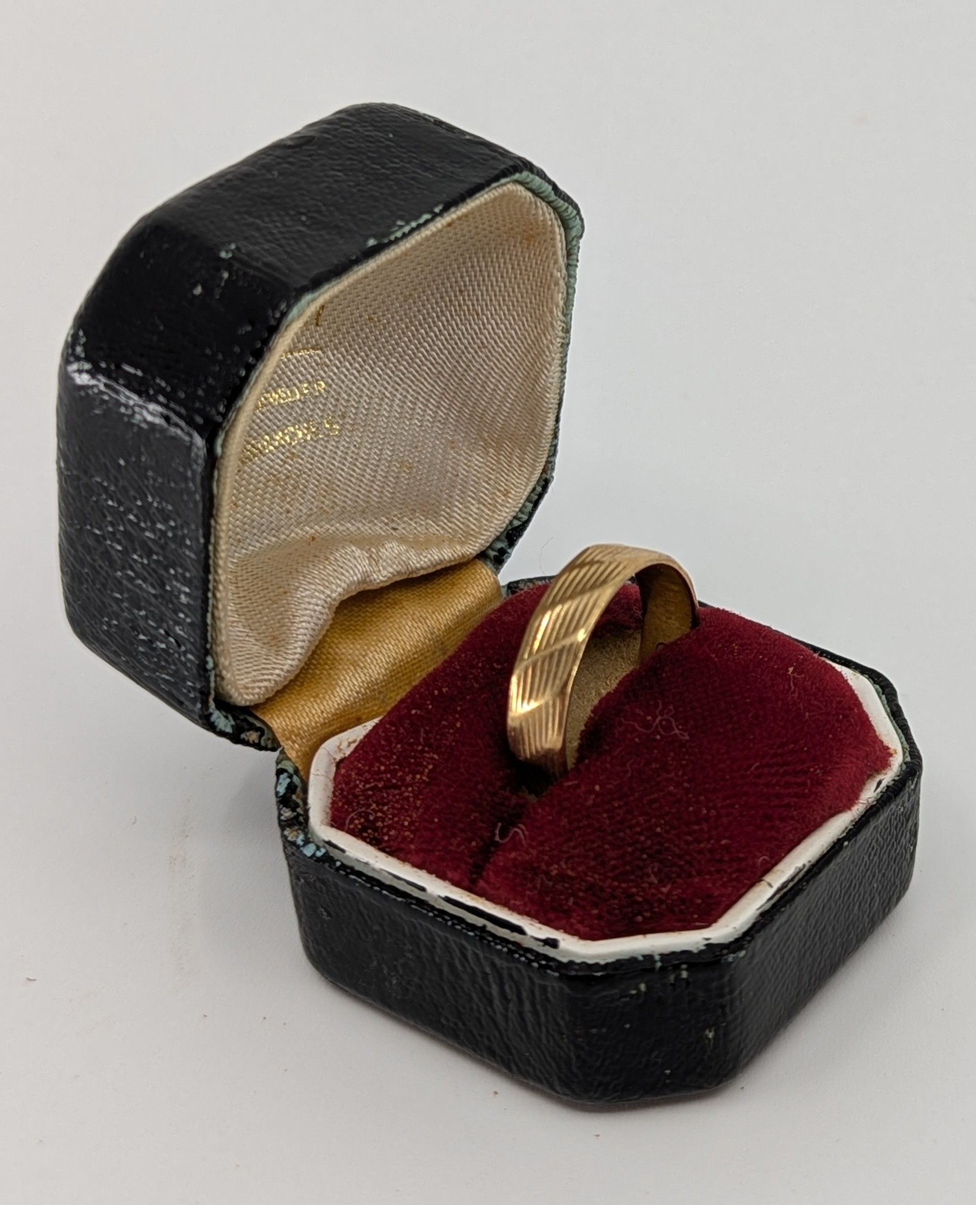 approx. 4.5mm wide, hallmarked "375" for 9ct gold, engraved inside the band "2219", approx. 2.2g, boxed