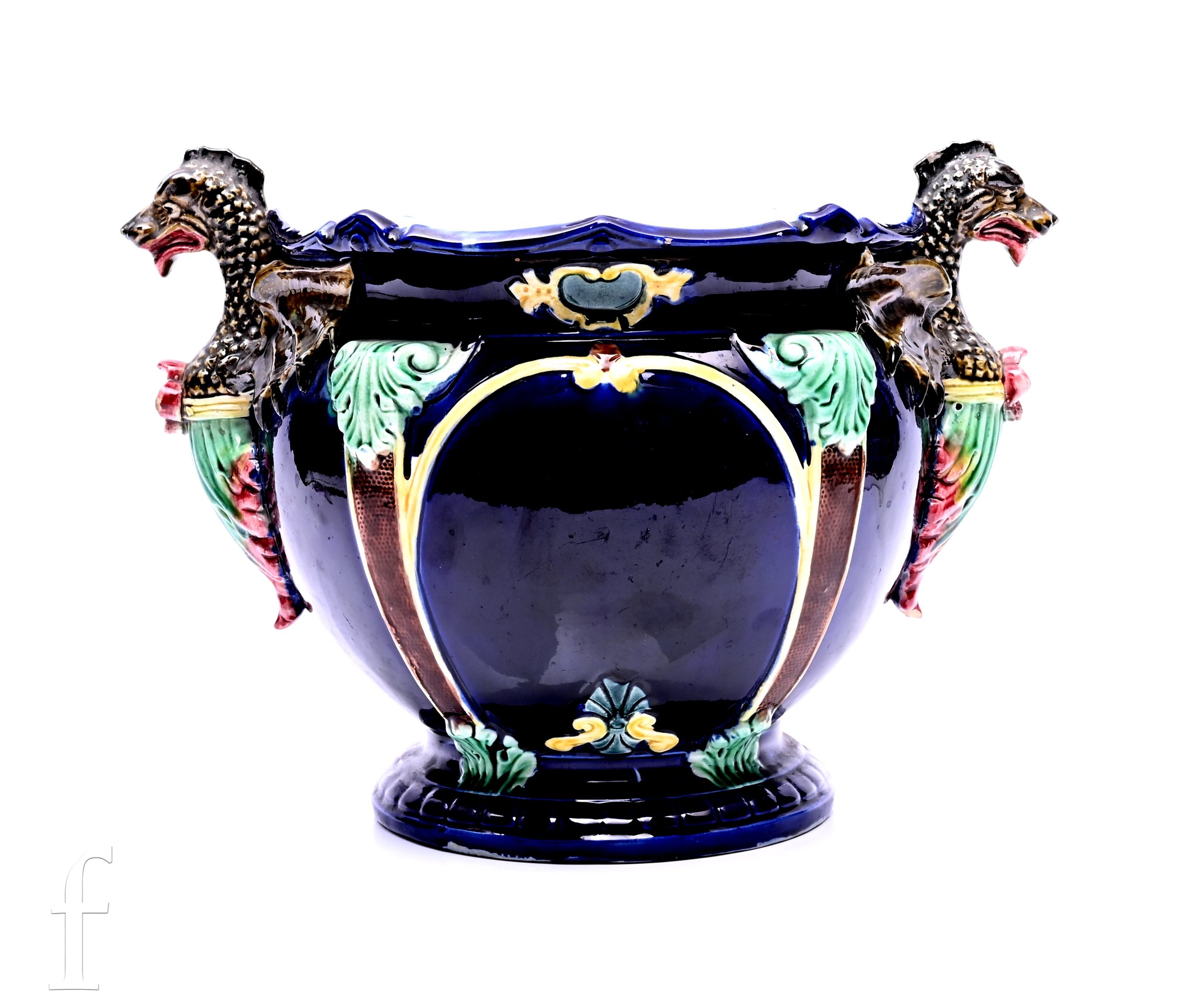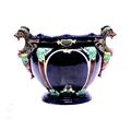 In the Manner of Thomas Forester, a Victorian majolica jardiniere, circa 1890, with applied dragon handles, foliate capital columns and vacant arcaded panels over blue ground, height 26cm.
