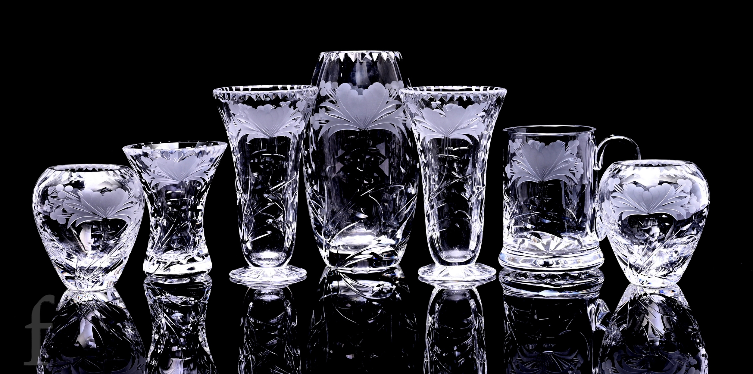 A collection of 20th Century Royal Brierley clear cut crystal to include assorted vases and a tankard, all decorated in the Fuchsia pattern with stylised flowers and foliage. (9)