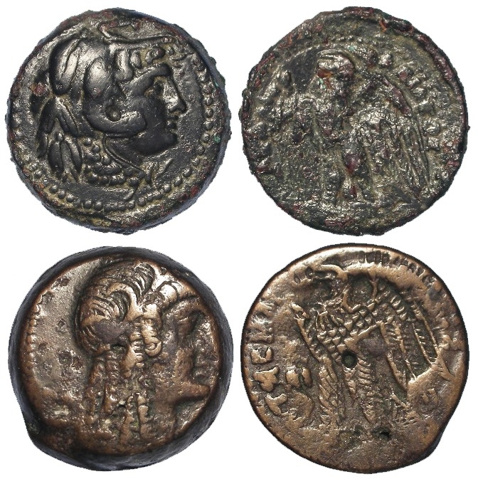 Ancient Greek: Ptolemaic Egypt (2) bronze: Ptolemy V Epiphanes AE25, 16.21g. Hd. of Isis r. / Eagle std. l., monogram to l. NVF, slightly off-centre; along with an unidentified AE25, 12.3g. Hd. of Alexander wearing elephant skin headdress. / Eagle std. l. AVF/nF.