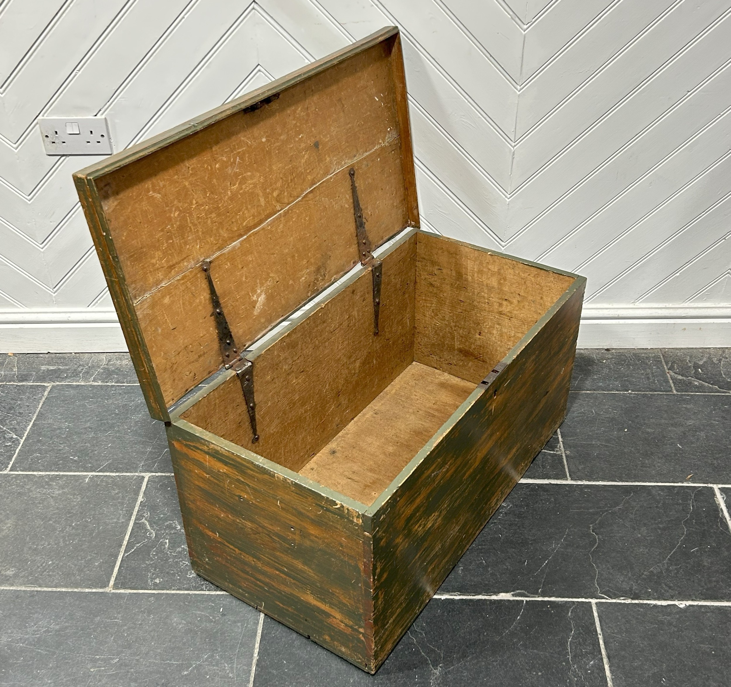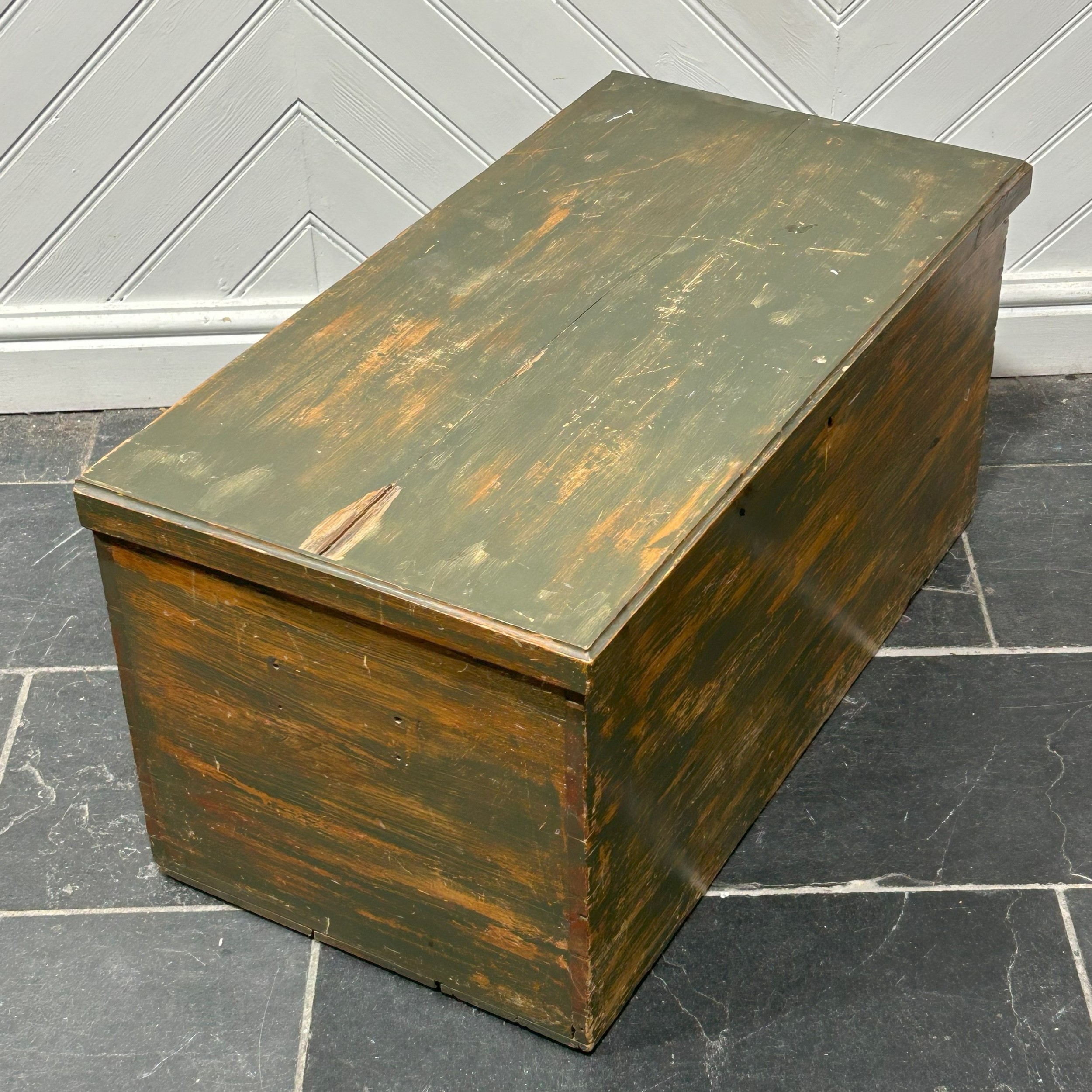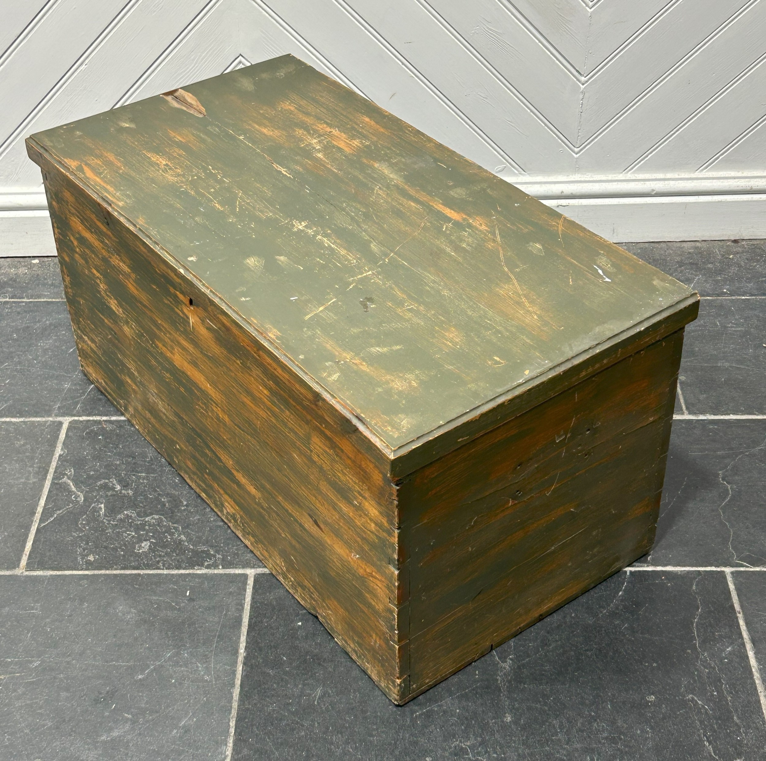A late 19th/early 20th century green-stained pine Trunk, W 83 cm x H 40 cm x D 43 cm.
