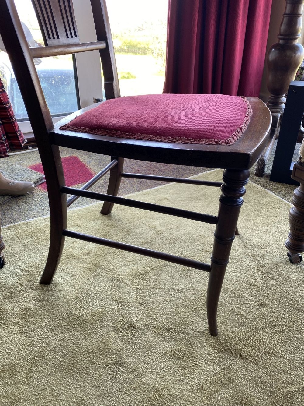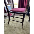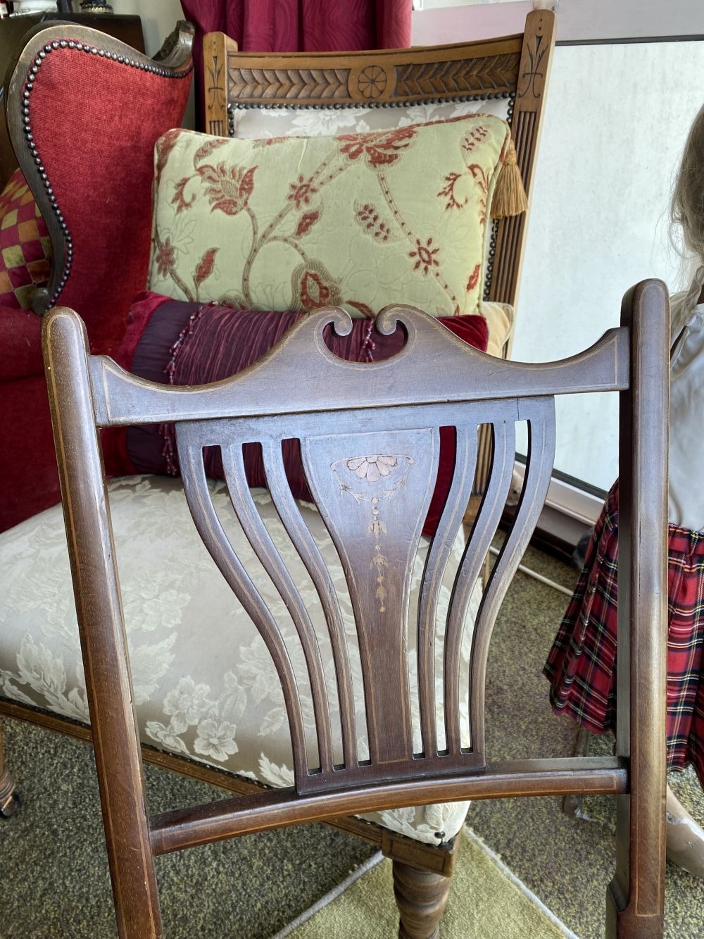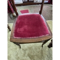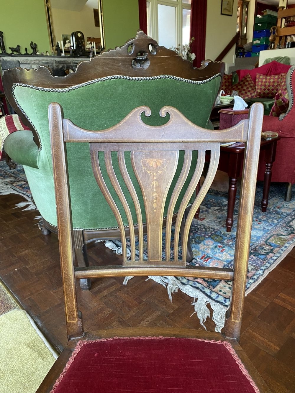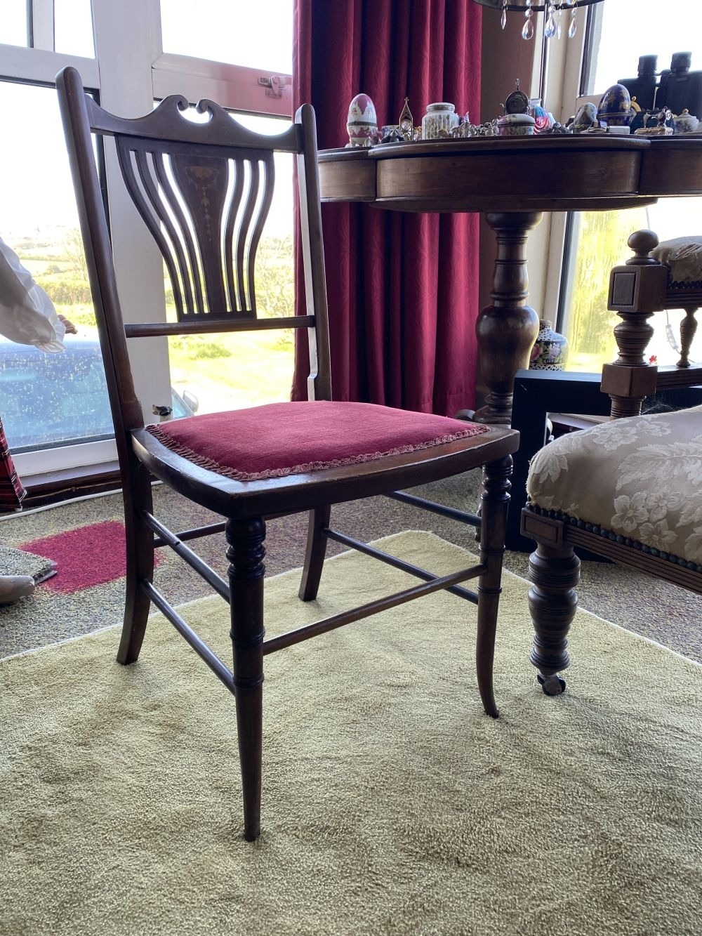 AN ANTIQUE EDWARDIAN STYLE INLAID HALL/SIDE CHAIR, with foliate & fleur de lis inlay to back splat, red upholstered seat, raised on turned leg to front and downswept leg to back joined by cross stretchers. Dimensions: 76.5cm high x 38.5cm wide x 39.5cm deep approx.