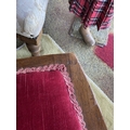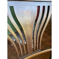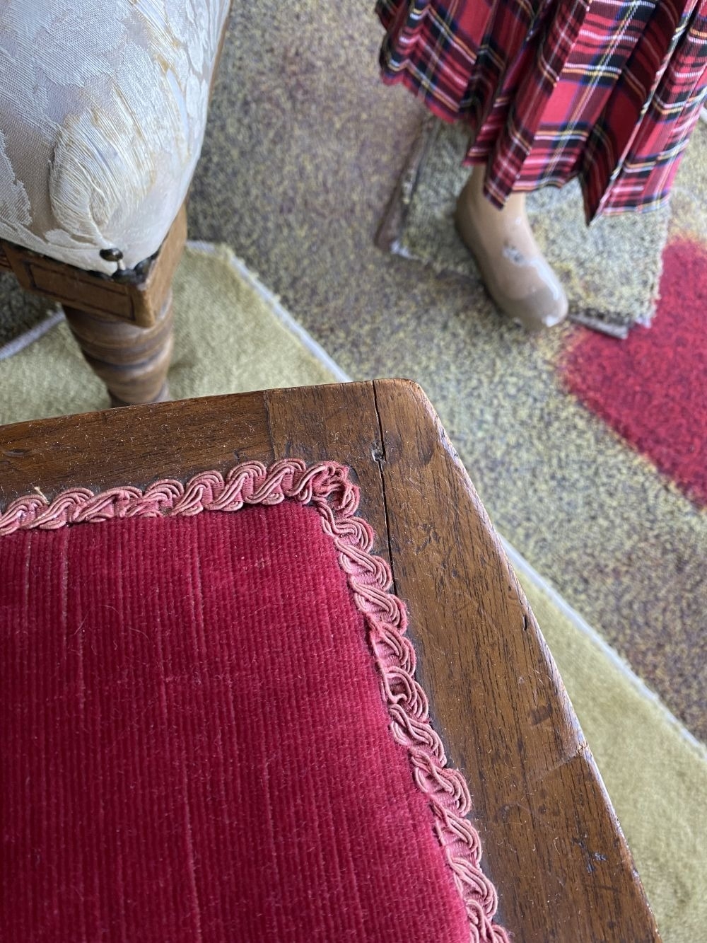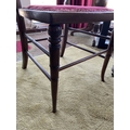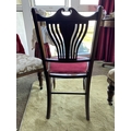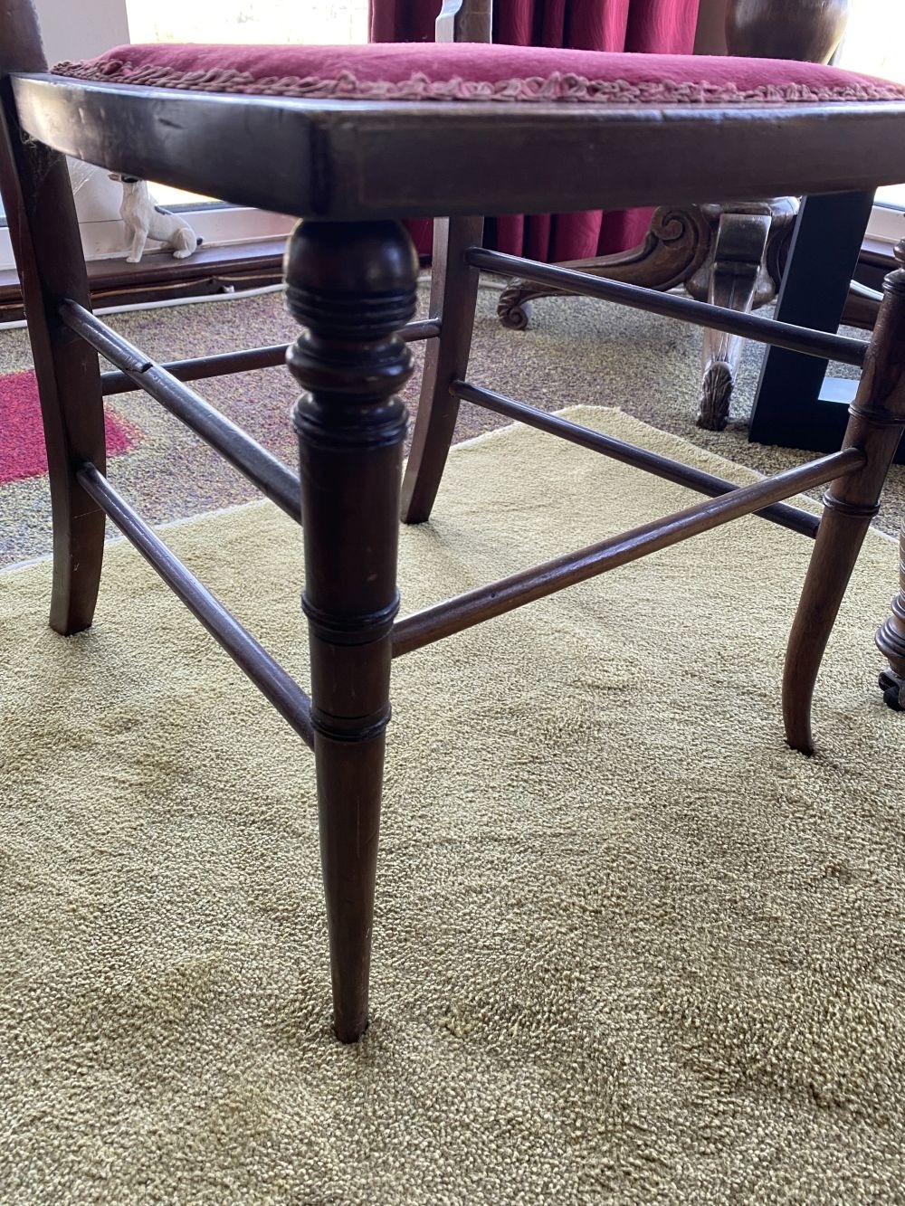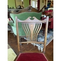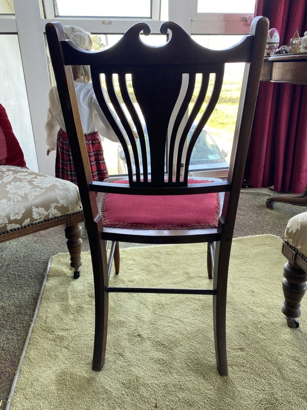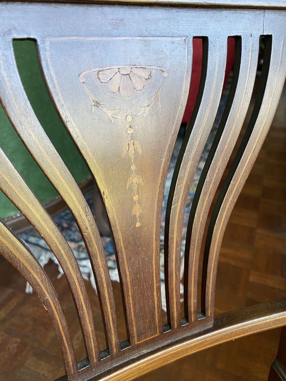 AN ANTIQUE EDWARDIAN STYLE INLAID HALL/SIDE CHAIR, with foliate & fleur de lis inlay to back splat, red upholstered seat, raised on turned leg to front and downswept leg to back joined by cross stretchers. Dimensions: 76.5cm high x 38.5cm wide x 39.5cm deep approx.