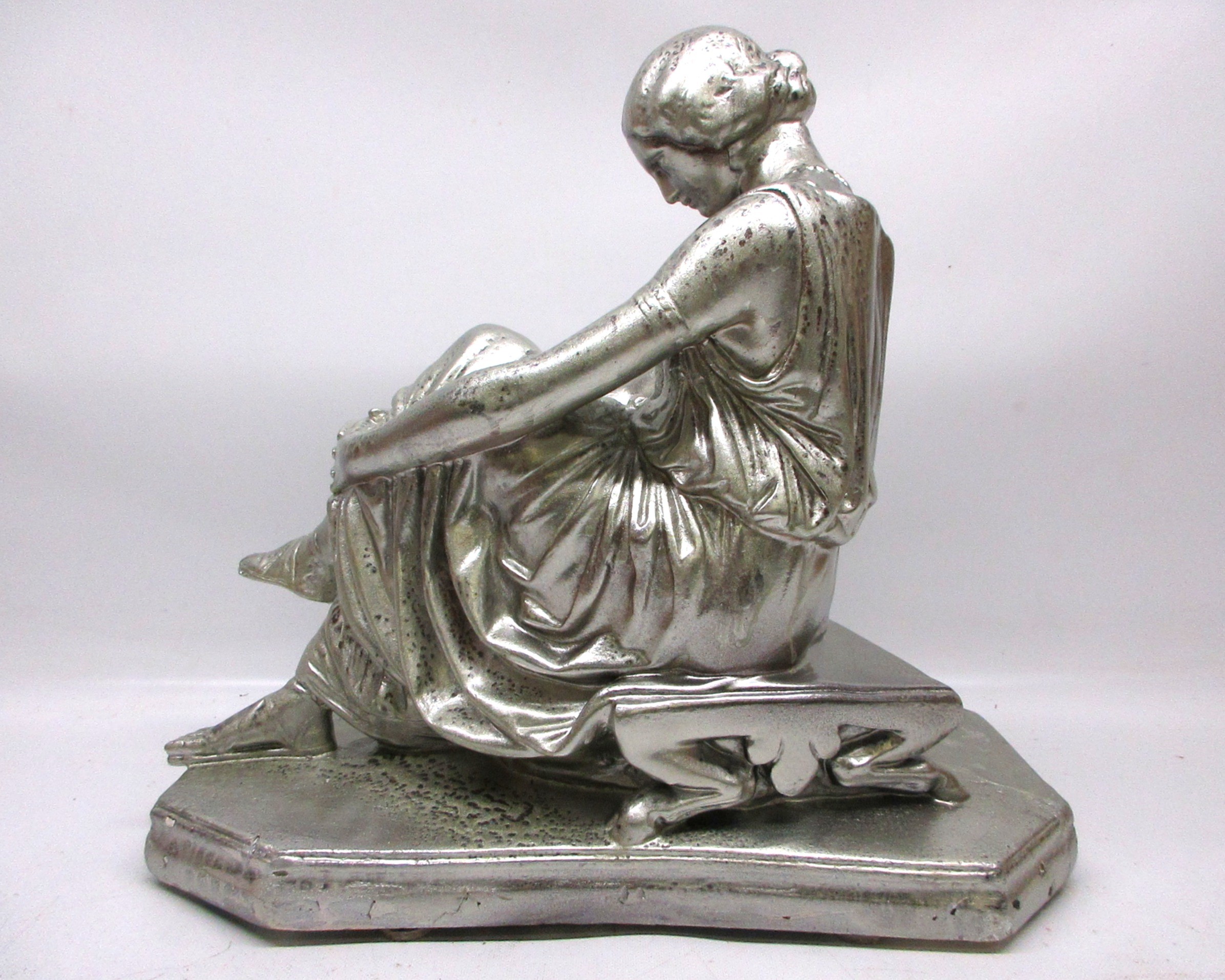 Neoclassical-style silvered composite sculpture of 'Sappho' after James (Jean-Jacques) Pradier (French, 1790-1862) depicting a female seated barefoot in archetypal drapery, with writing scroll & plinth base; approx. W44cm x D21.5cm x H41cm; Sappho was a poet (Lesbos, b.630-620BCE), celebrated for her influence on ancient Greek literature & culture, (1)