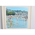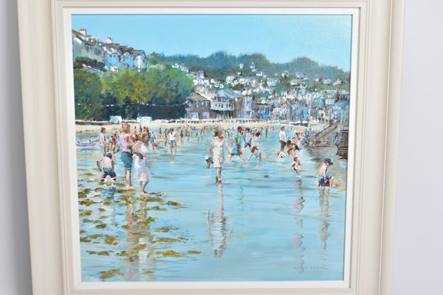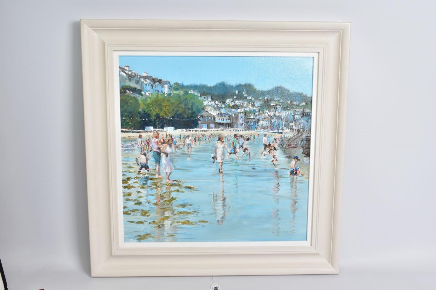 HILARY BURNETT COOPER (BRITISH CONTEMPORARY) 'BEACH RECREATIONS, LOOE', signed bottom right, oil on board, approximate sizes: image 48cm x 48cm, frame 65cm x 65cm (condition: image and frame in good condition) (A)