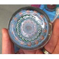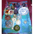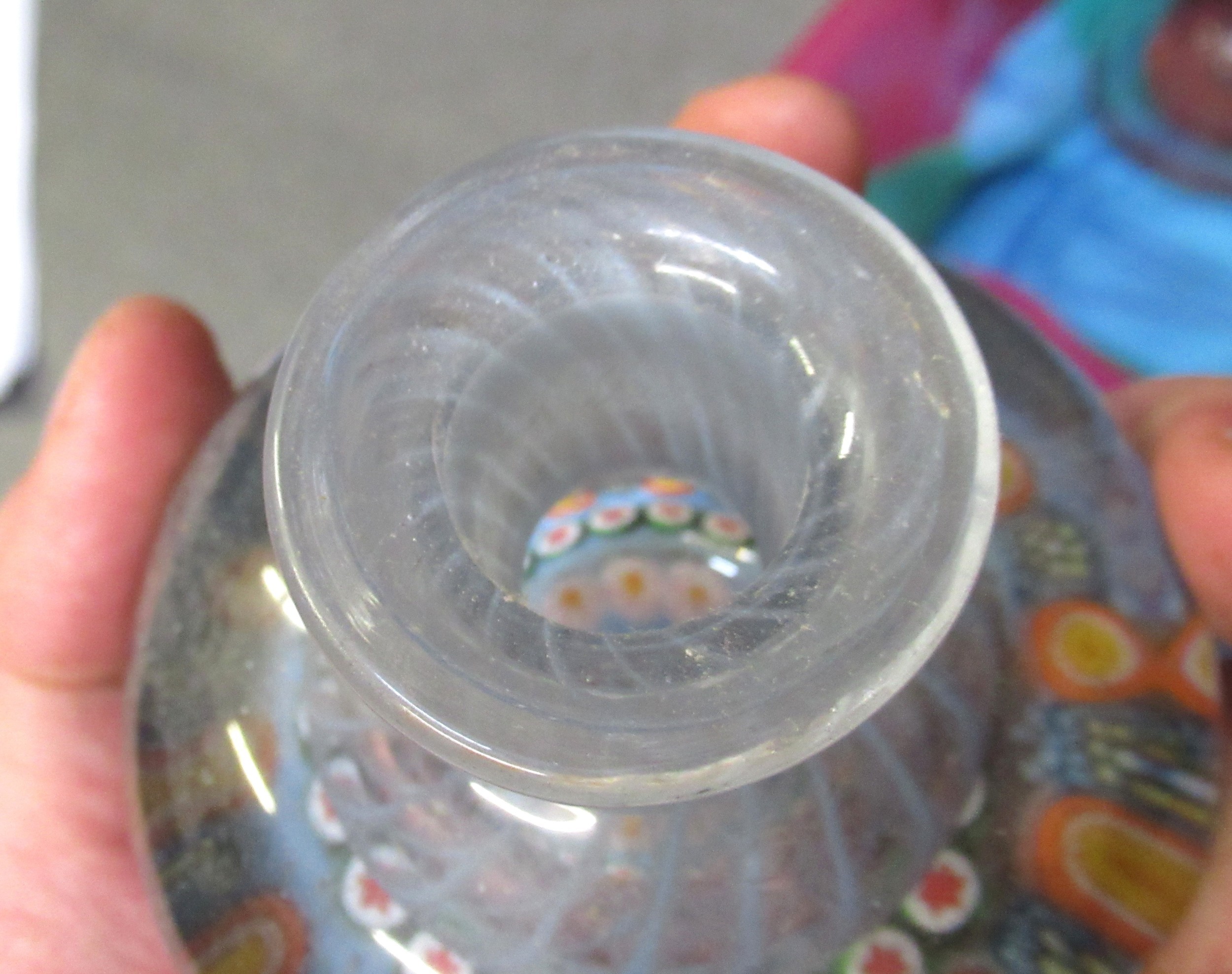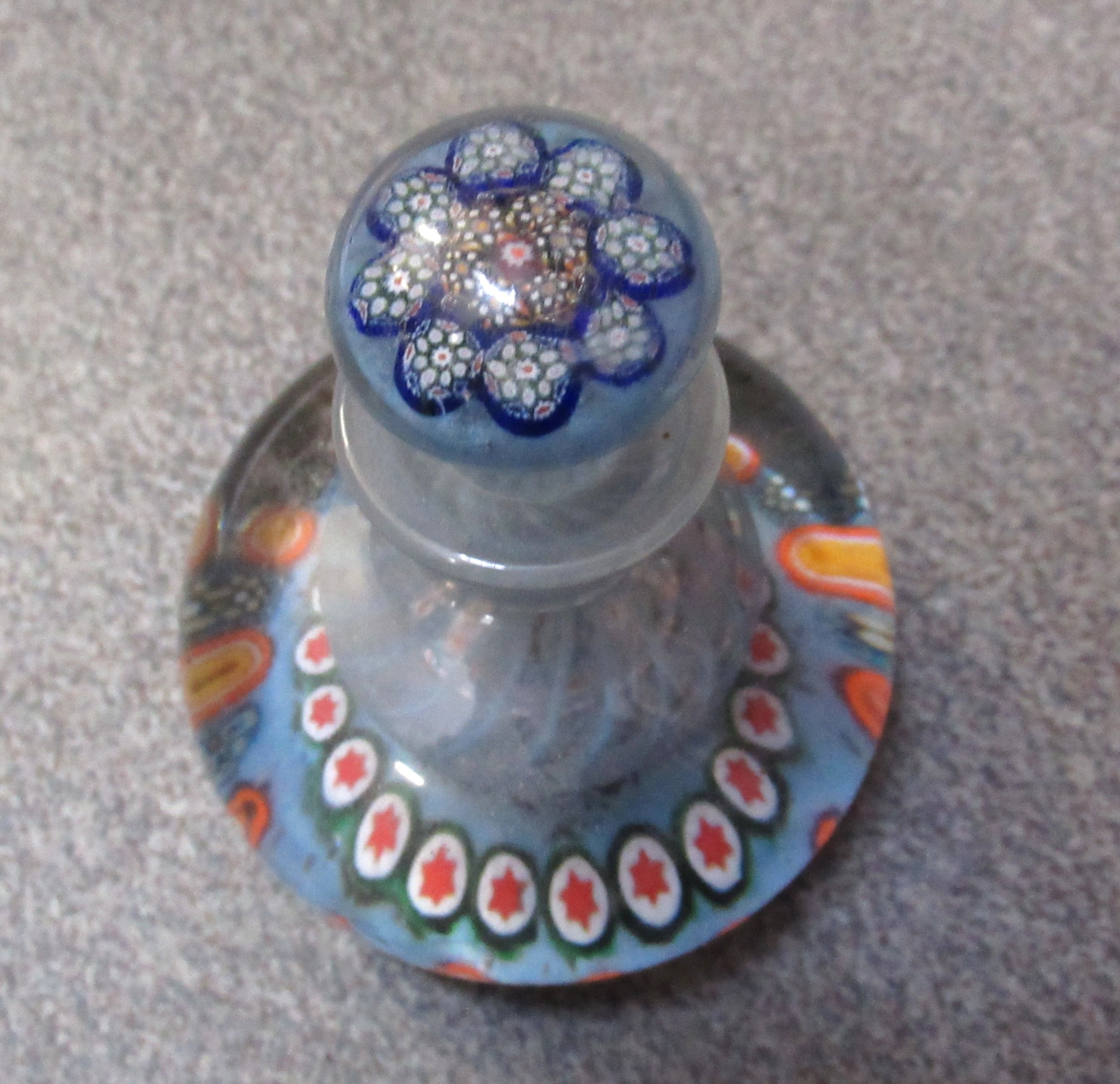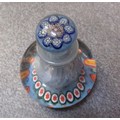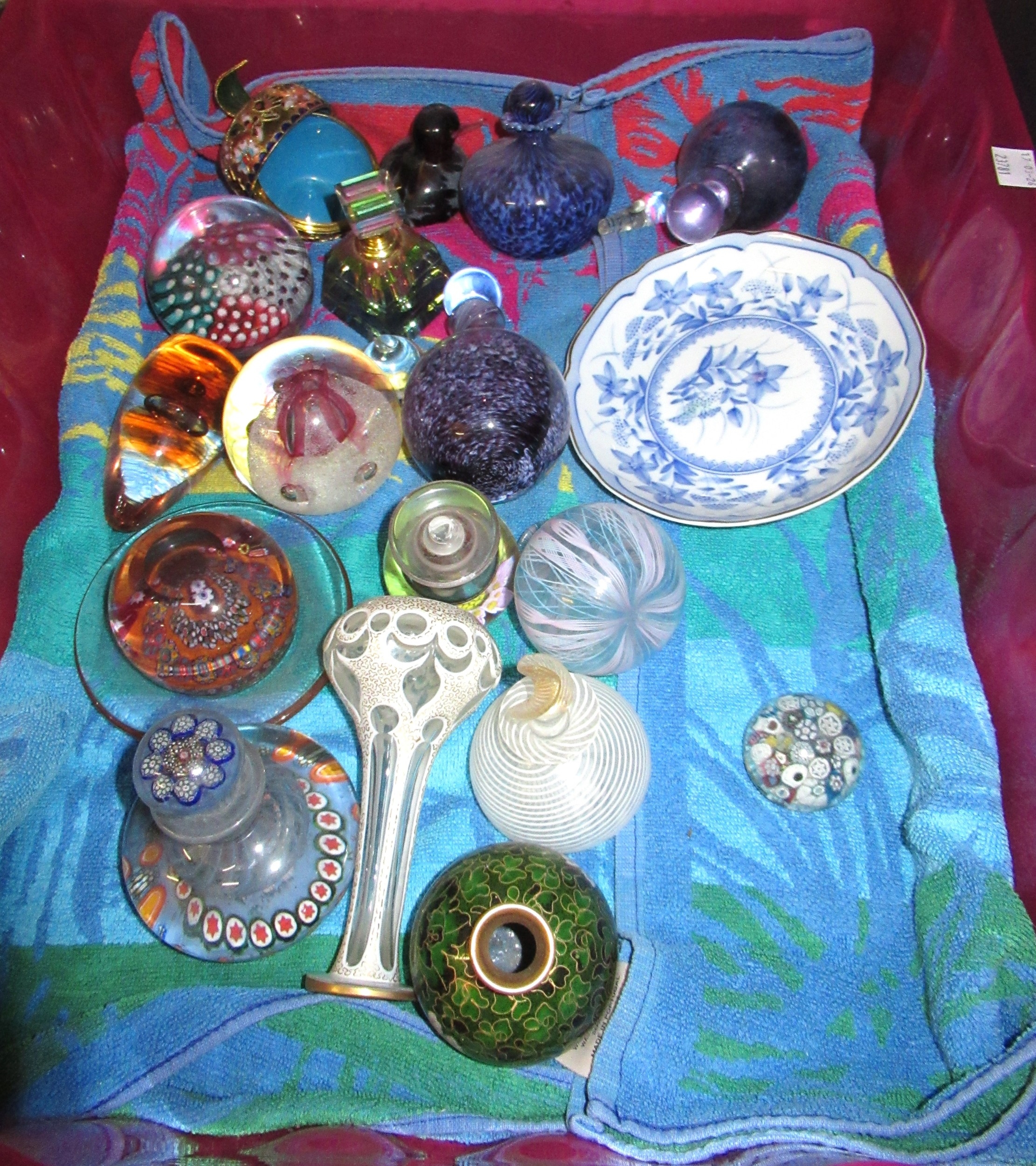 Small collection of paperweights and two Millefiori glass perfume bottles (one at fault), six other items of art glass, together with a small Bohemian decanter