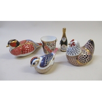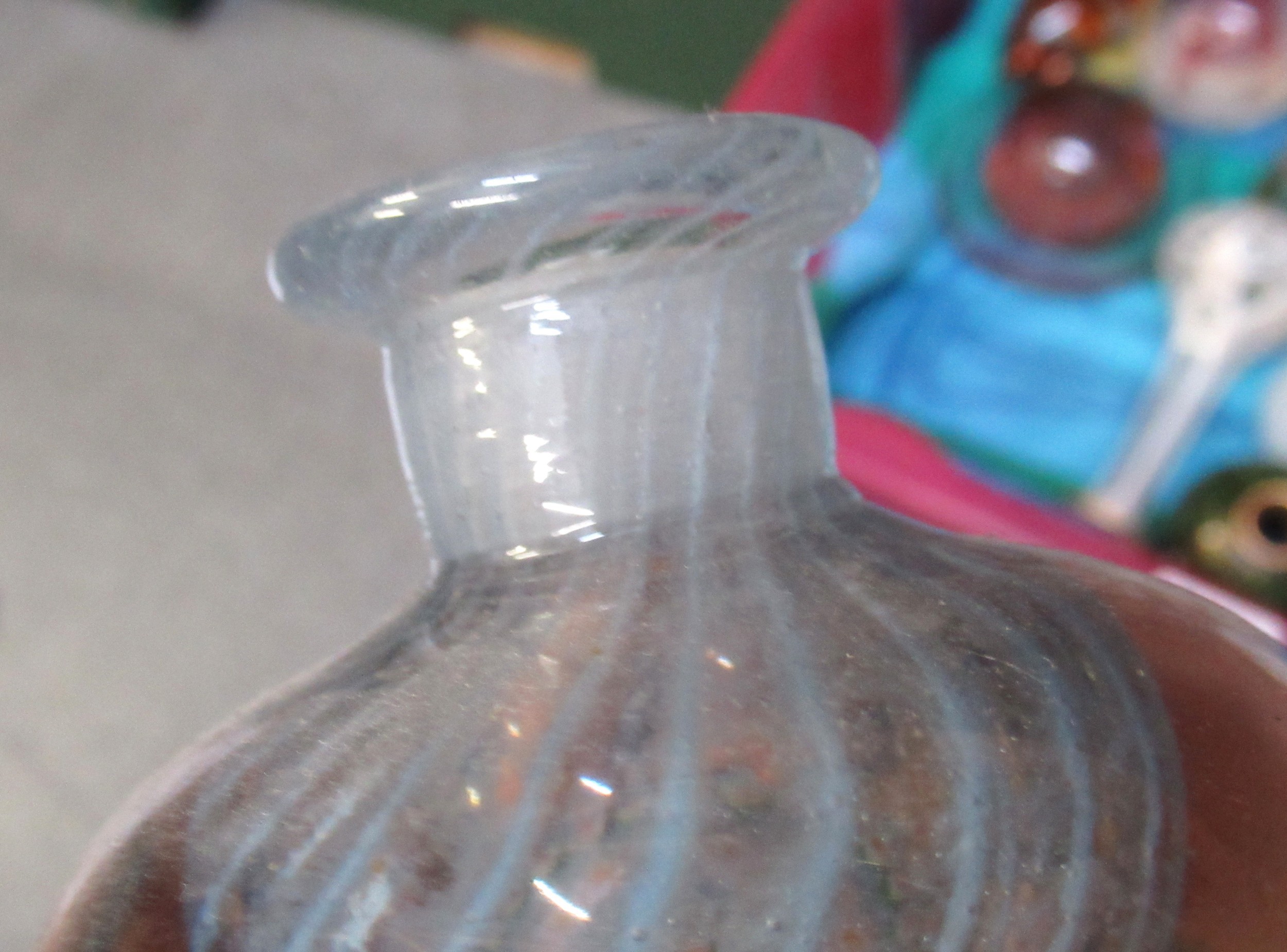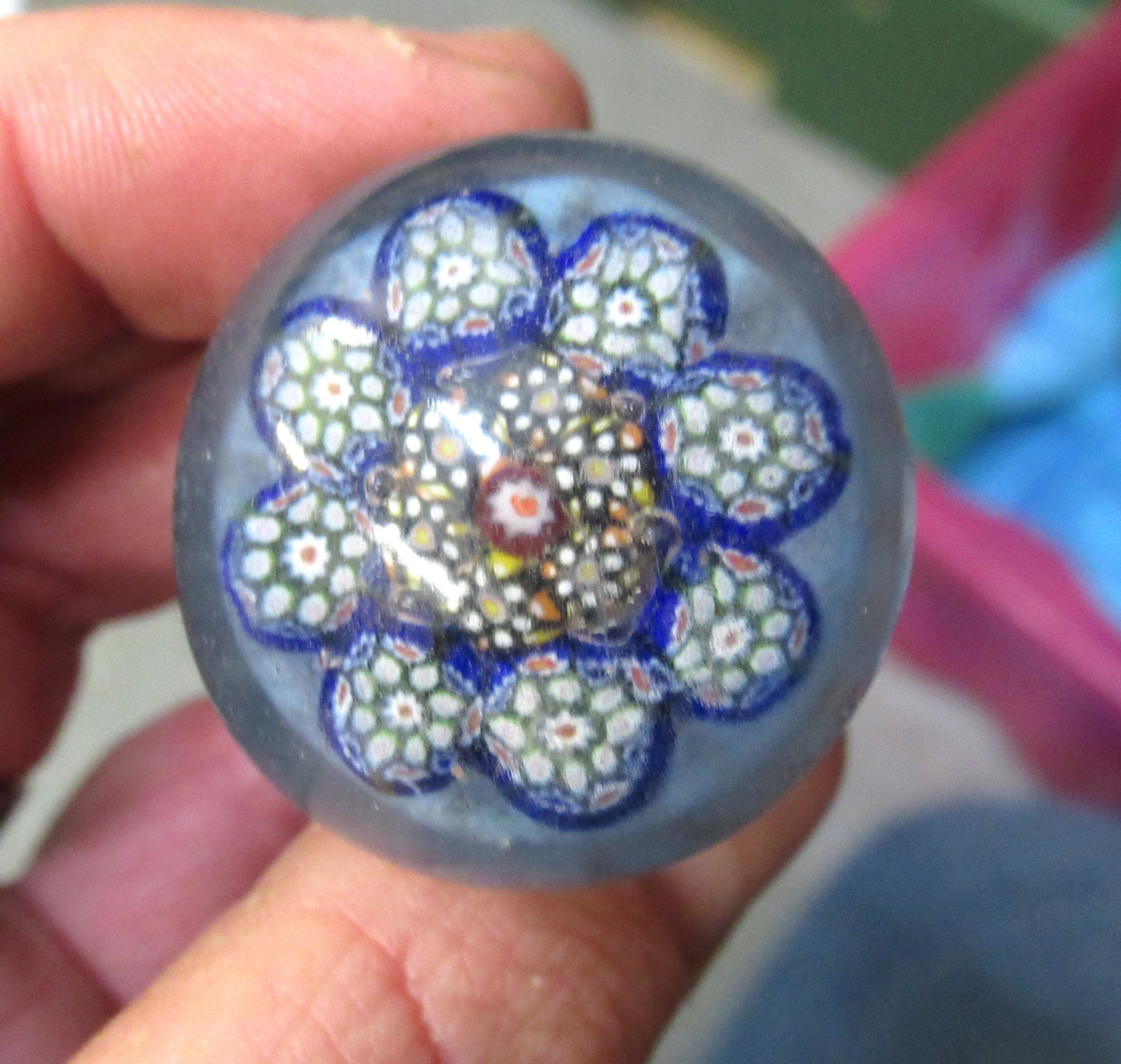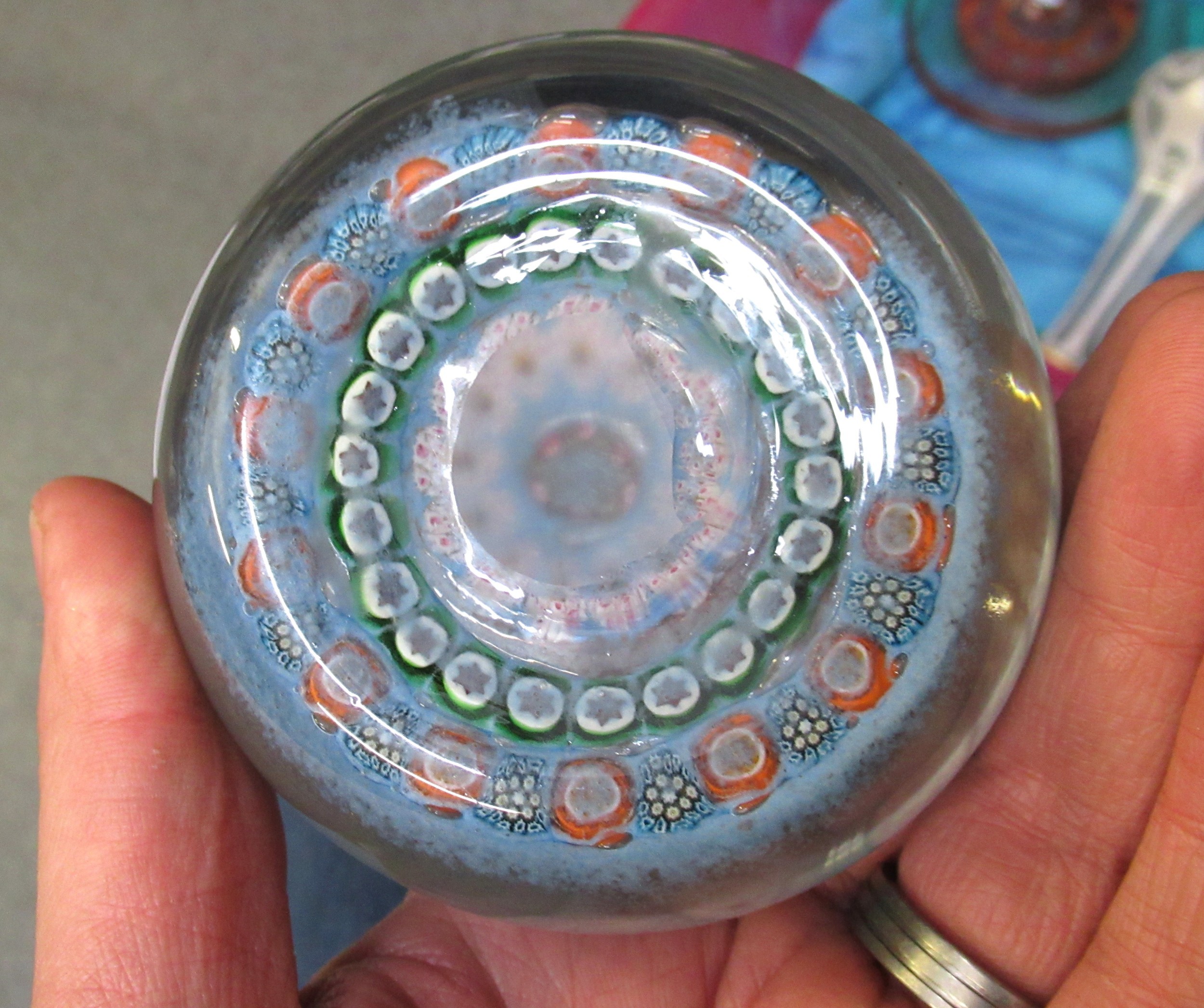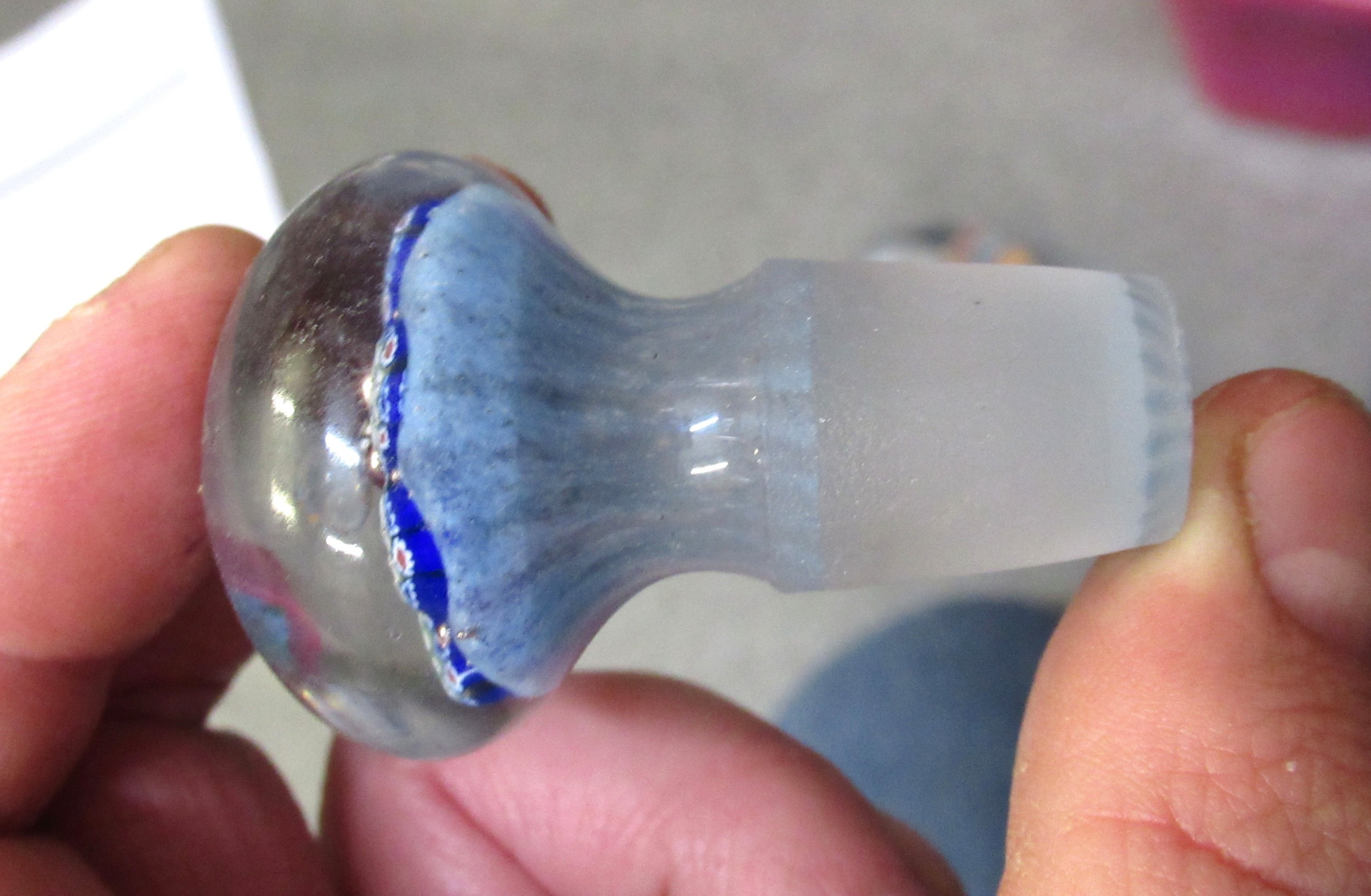 Small collection of paperweights and two Millefiori glass perfume bottles (one at fault), six other items of art glass, together with a small Bohemian decanter