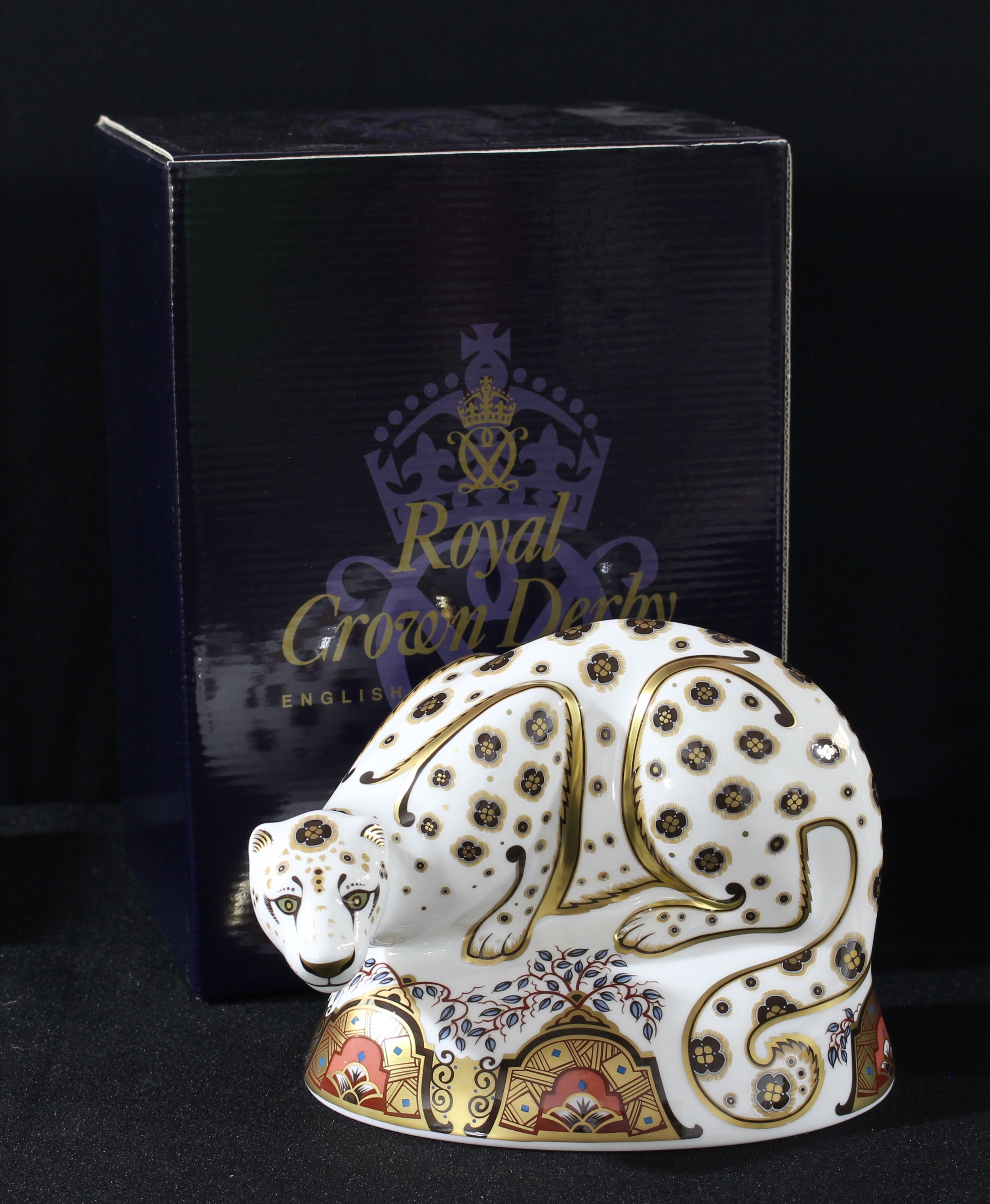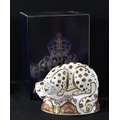 A Royal Crown Derby paperweight, Snow Leopard, gold stopper, 17cm wide, printed mark, signed in gold, boxed