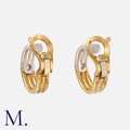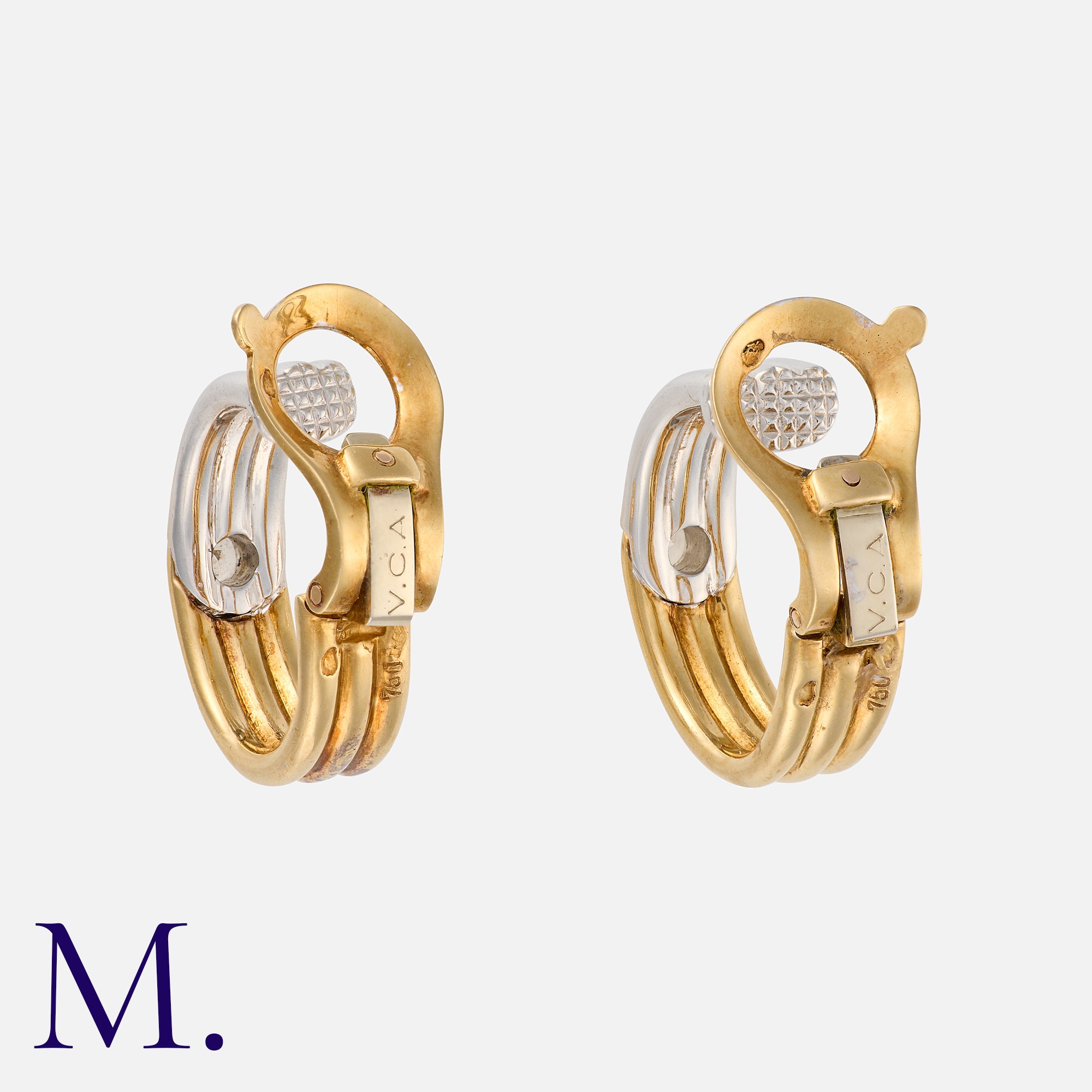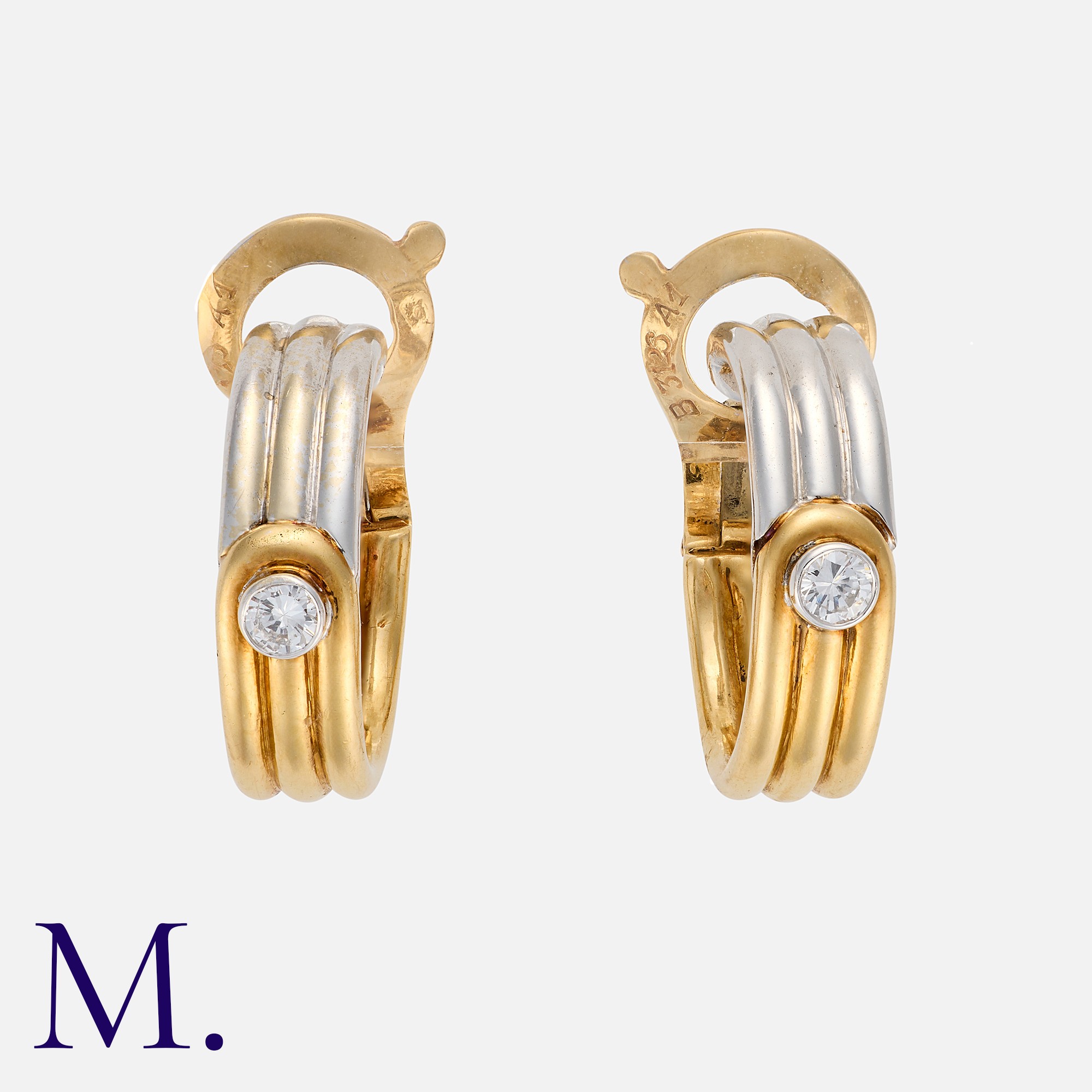 VAN CLEEF & ARPELS. A Pair of Diamond Hoop Earrings in 18K yellow and white gold, with ribbed white and gold hoops, each accented by a single diamond weighing approx. 0.10ct. Signed VCA and serial numbered. French marks for 18ct gold.