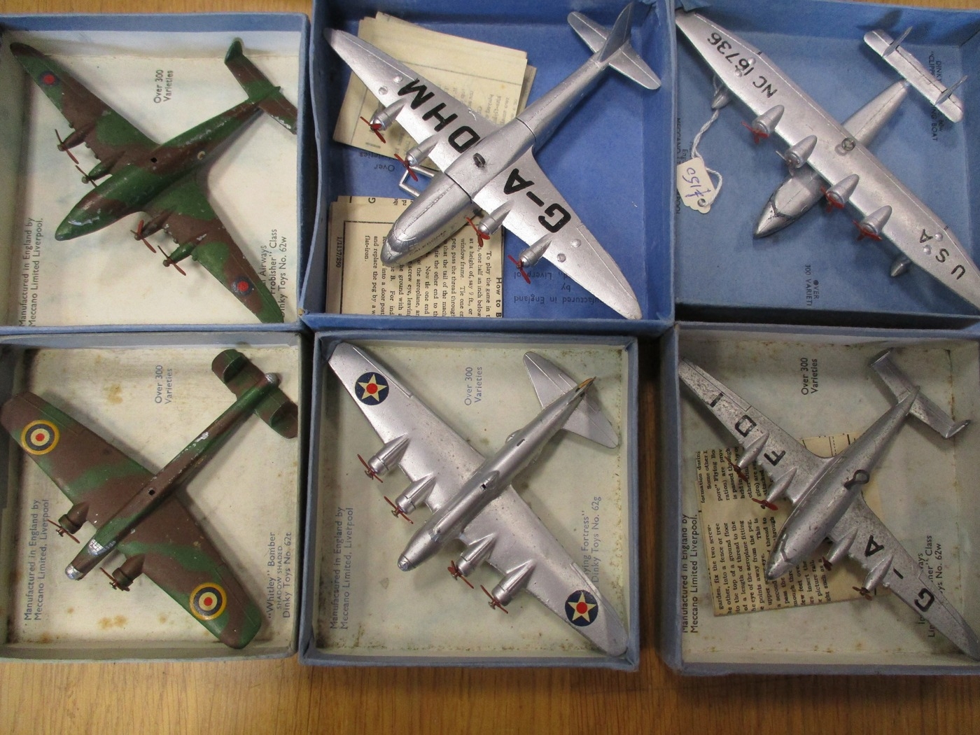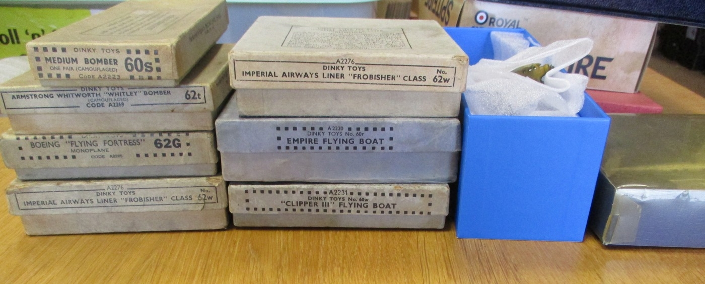 Dinky. Collection including boxed planes with Empire Flying Boat No 60r, "Clipper III" Flying Boat No 60W, Boeing ''Flying Fortress'' No 62G, Armstrong Whitworth ''Whitley'' Bomber No 62t, Imperial Airways Liner ''Frobisher'' No 62W (2), etc, generally good plus to excellent. Qty 18 planes. (B)