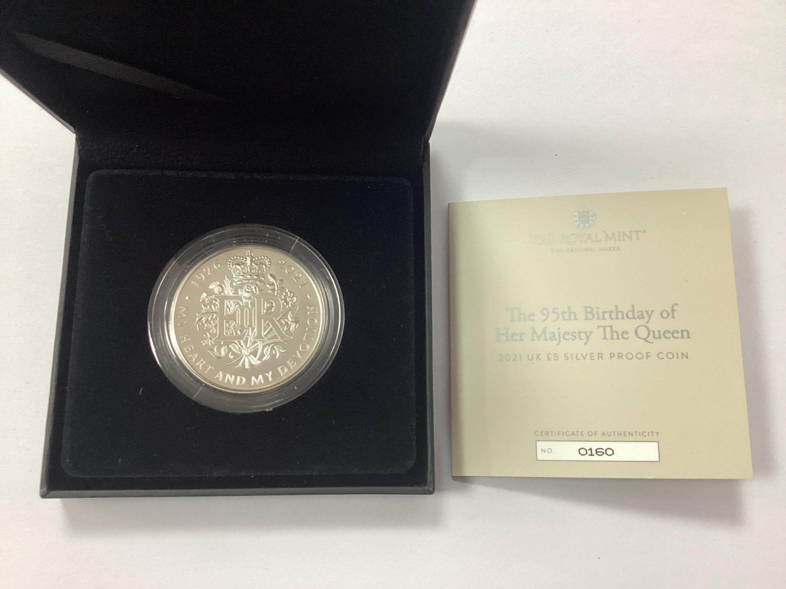 Royal Mint 2021 Silver Proof UK £5 coin, to commemorate the 95th Birthday of Her Majesty The Queen, cased with a certificate of authenticity.