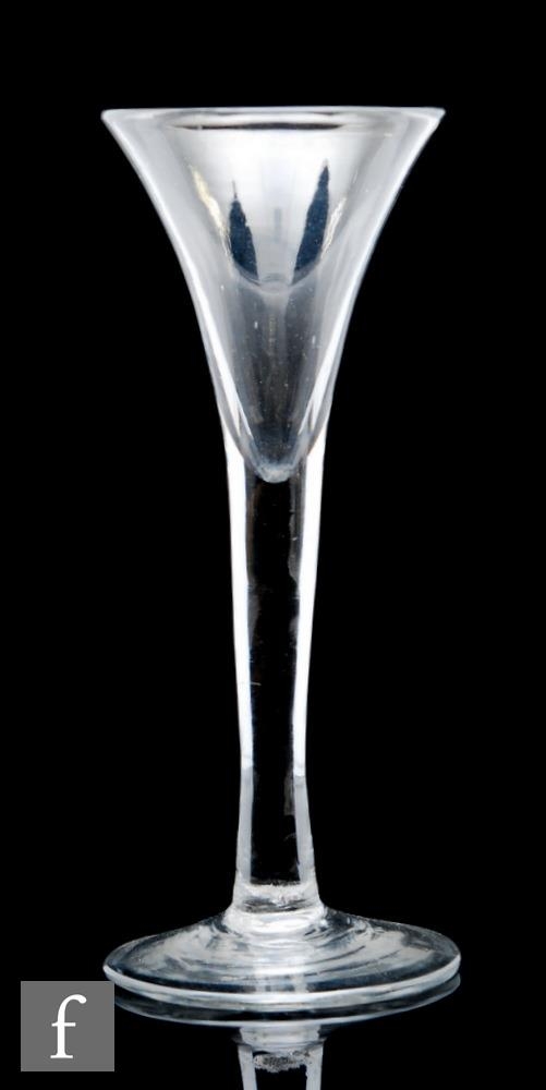 An 18th Century drinking glass circa 1740, the drawn trumpet bowl above a solid plain stem, raised to a conical foot, height 17cm, together with another drinking glass of thistle form above a solid plain stem, height 16cm, restored. (2)