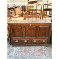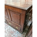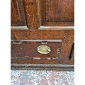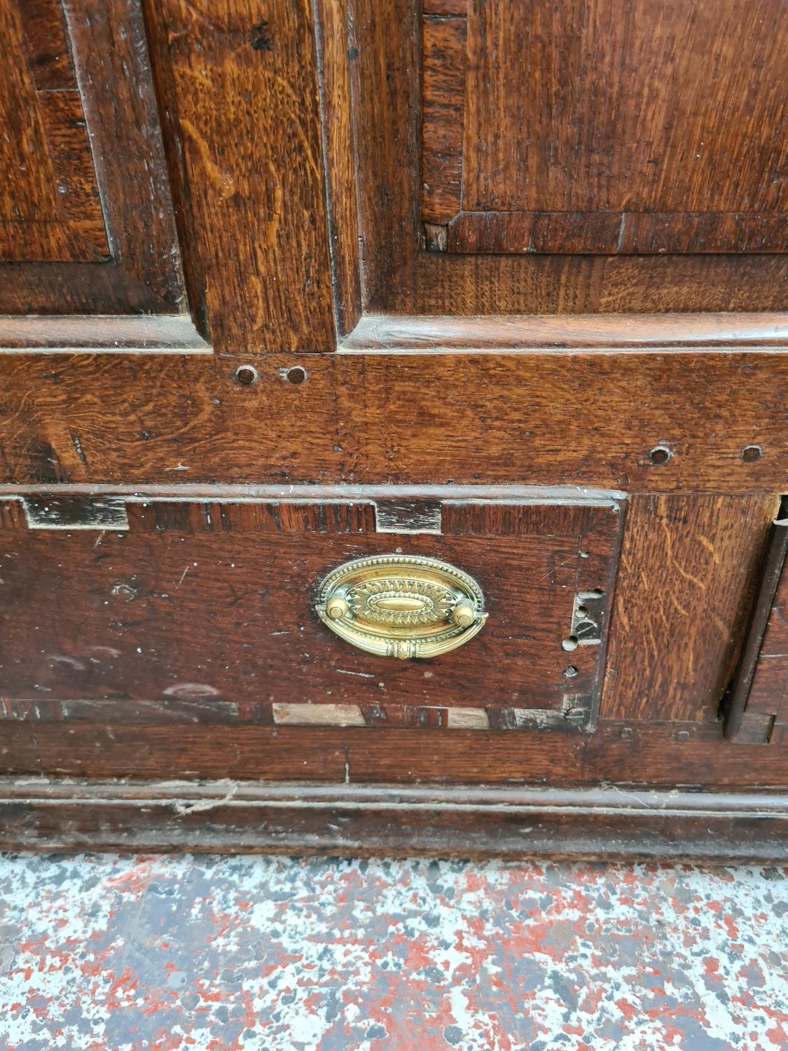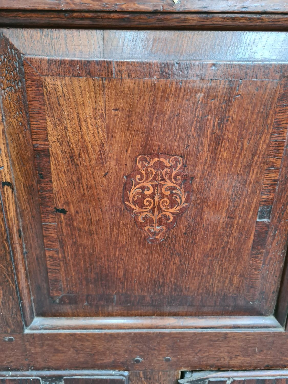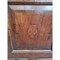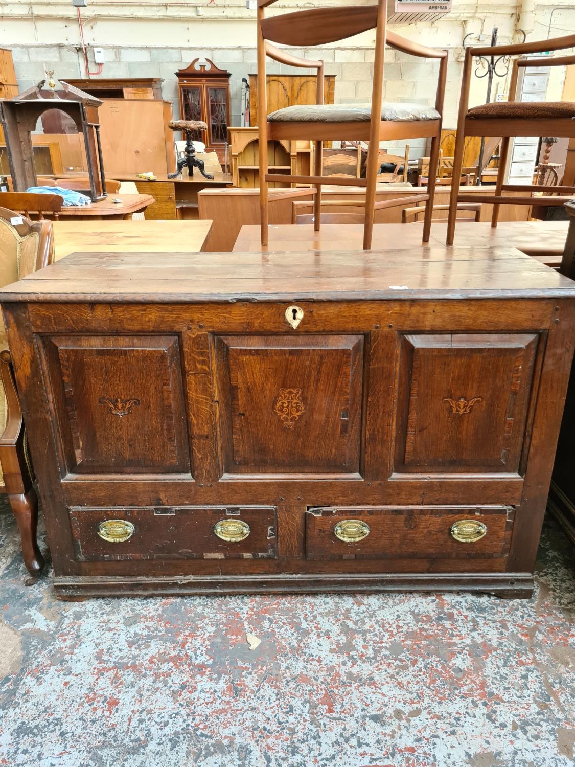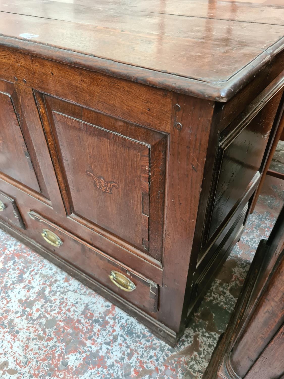 A Georgian inlaid oak mule chest with two lower drawers, brass regency handles and bone estucheon