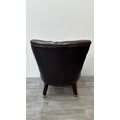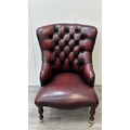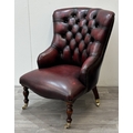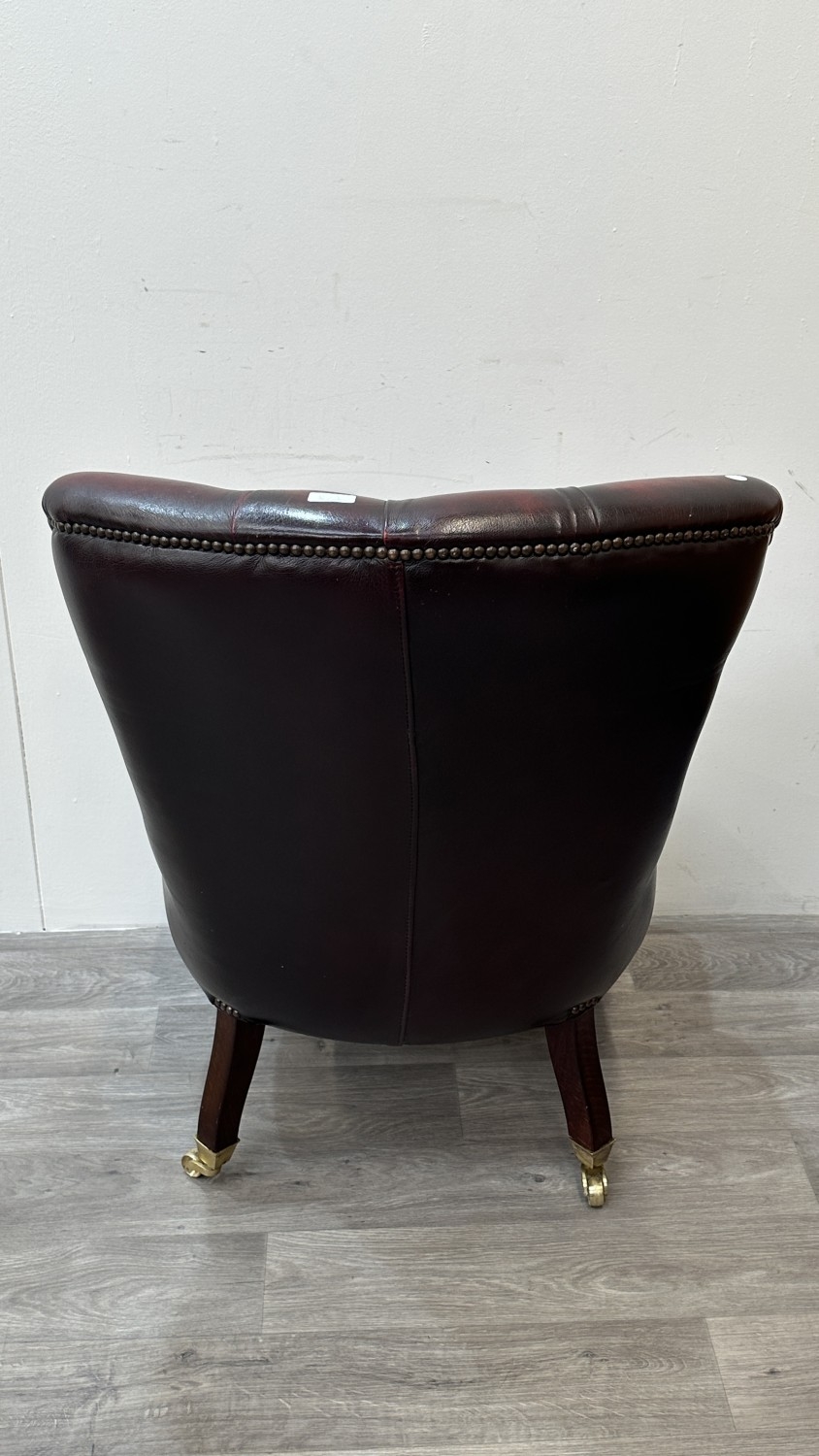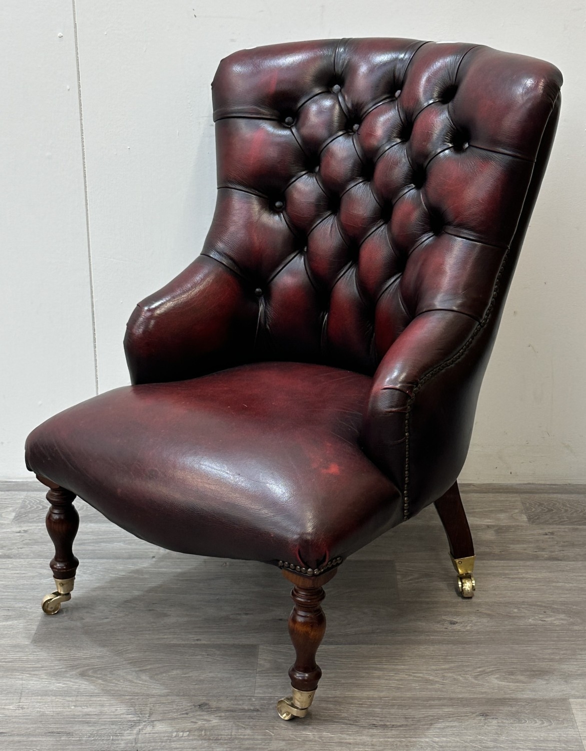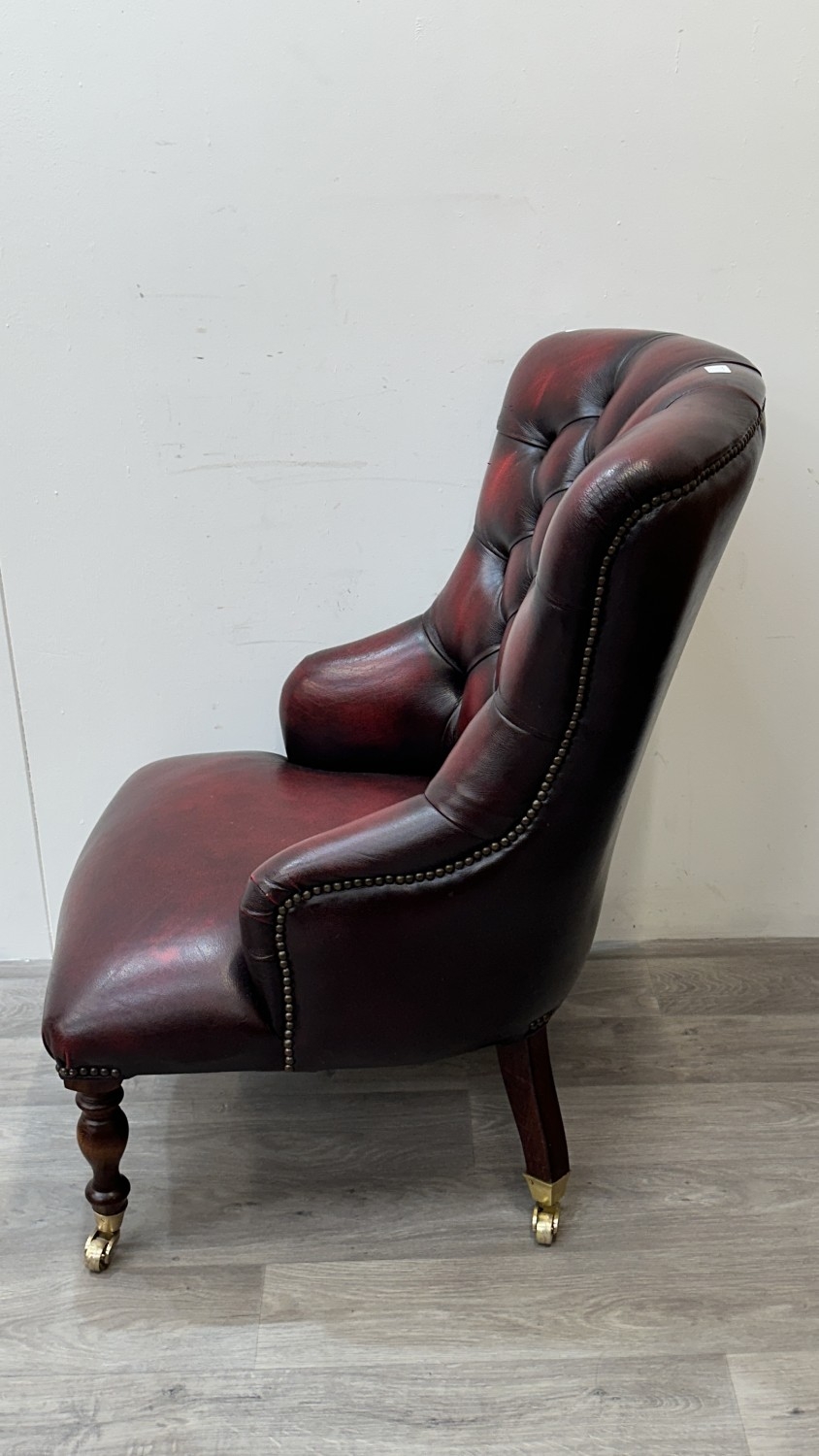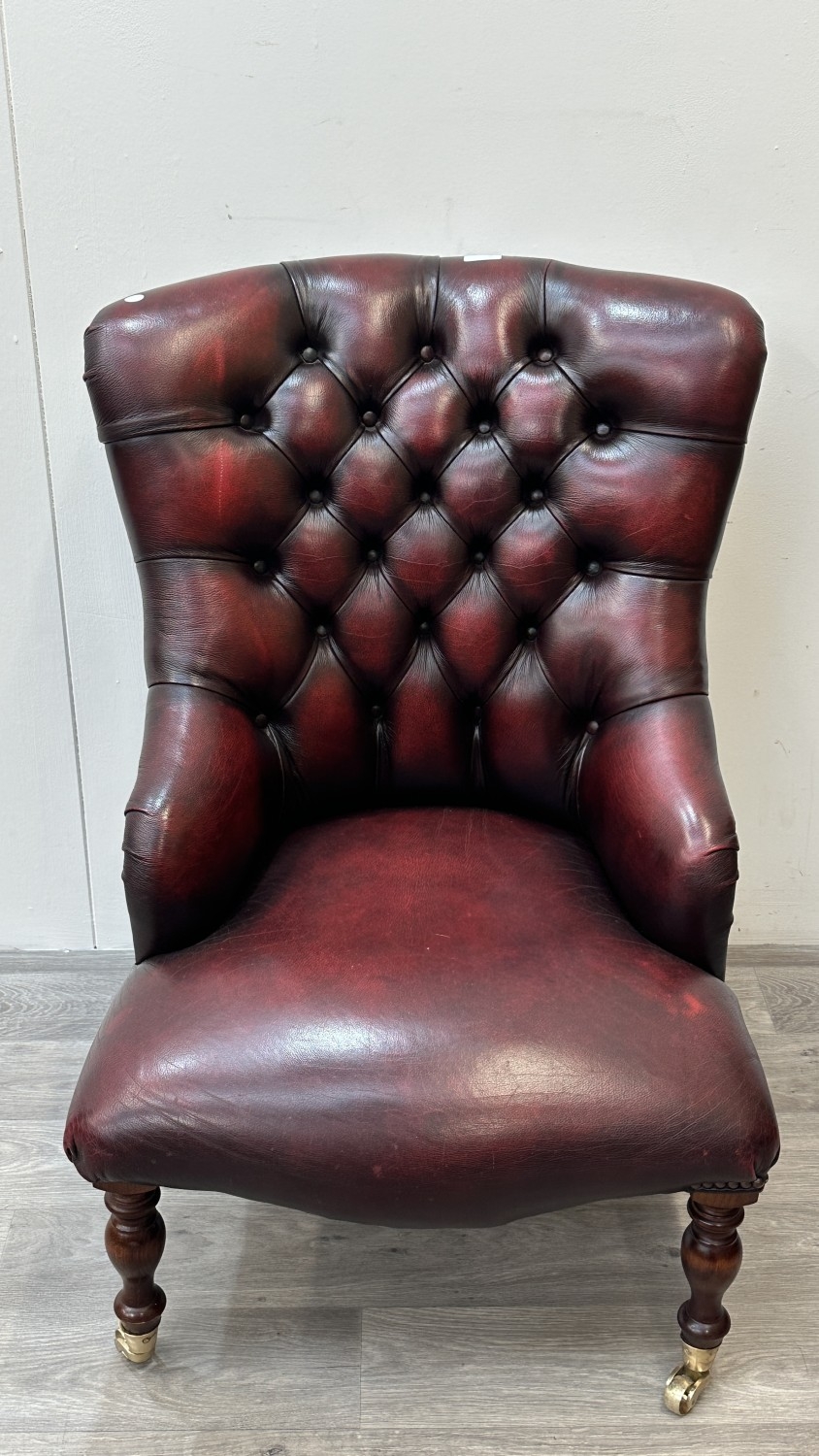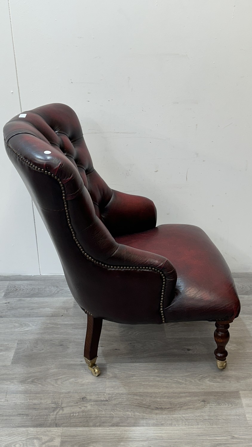 A 19th century style oxblood leather Chesterfield armchair on turned beech supports and brass castors - approx. 91cm x 62cm wide x 60cm deep