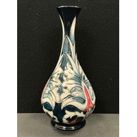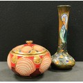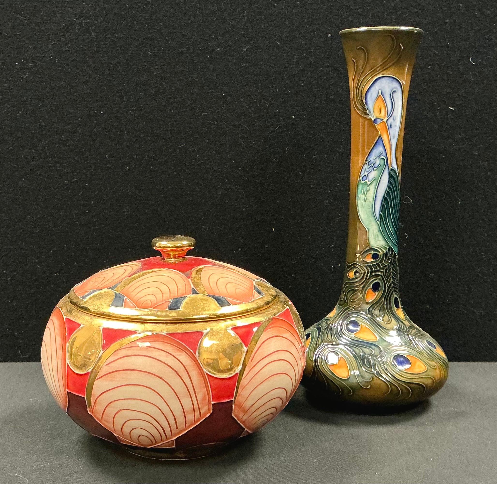 A Moorcroft ovoid jar and cover, Royal Betrothal pattern, designed by Vicky Lovatt, tube lined with geometric shapes, in polychrome and gilt, 10cm high, limited edition 84/100, impressed and painted marks, signed, c.2017; a Moorcroft bottle vase, Phoenix pattern, designed by Rachel Bishop, tube lined with fanciful bird, in polychrome, 20.5cm high, printed and painted marks, c.1994 (2)