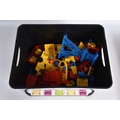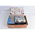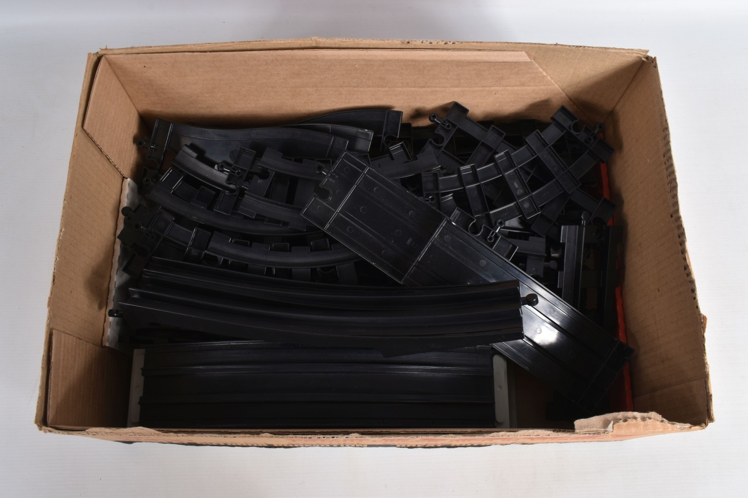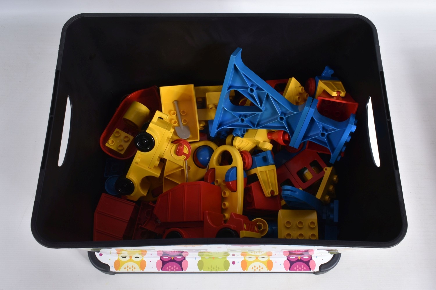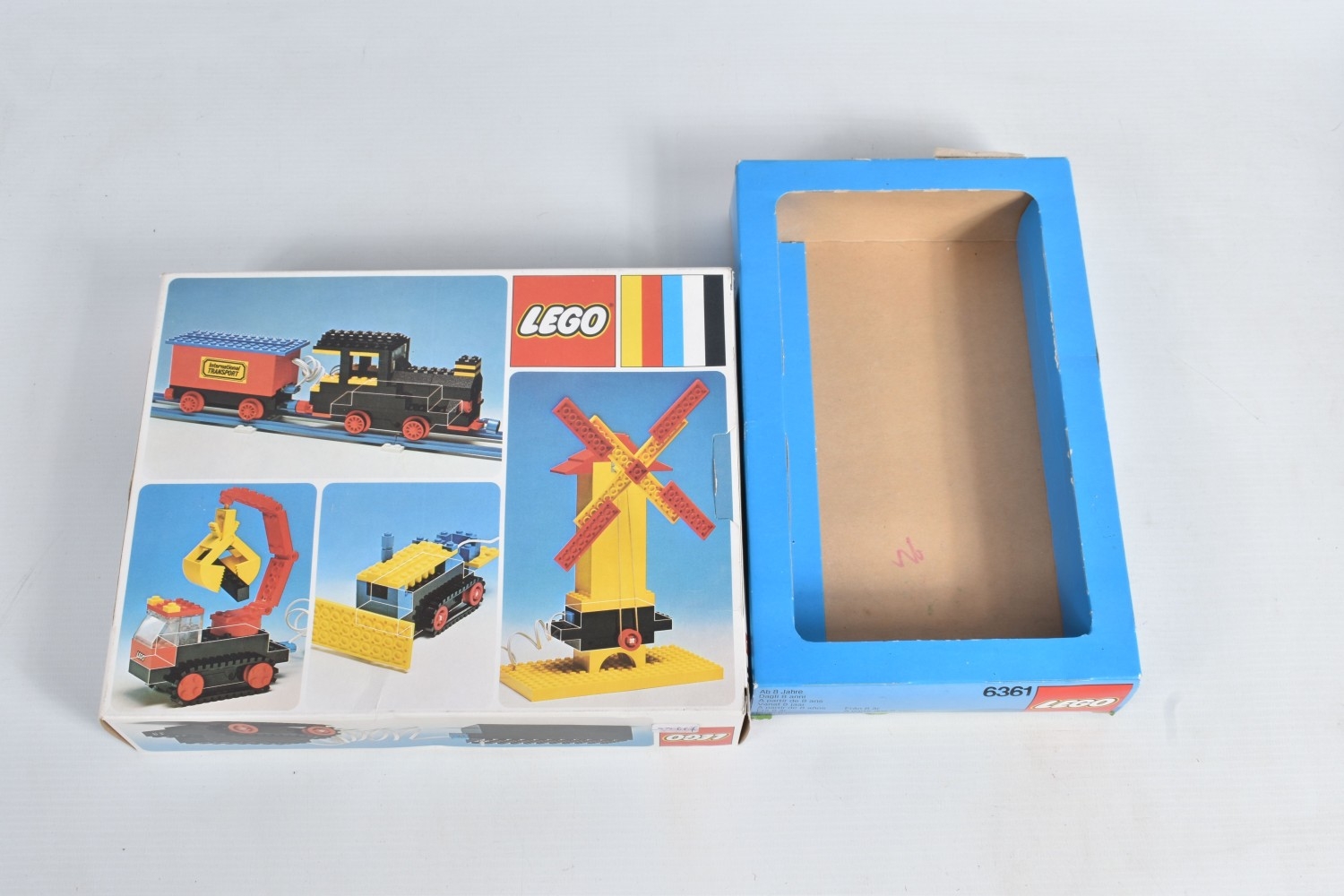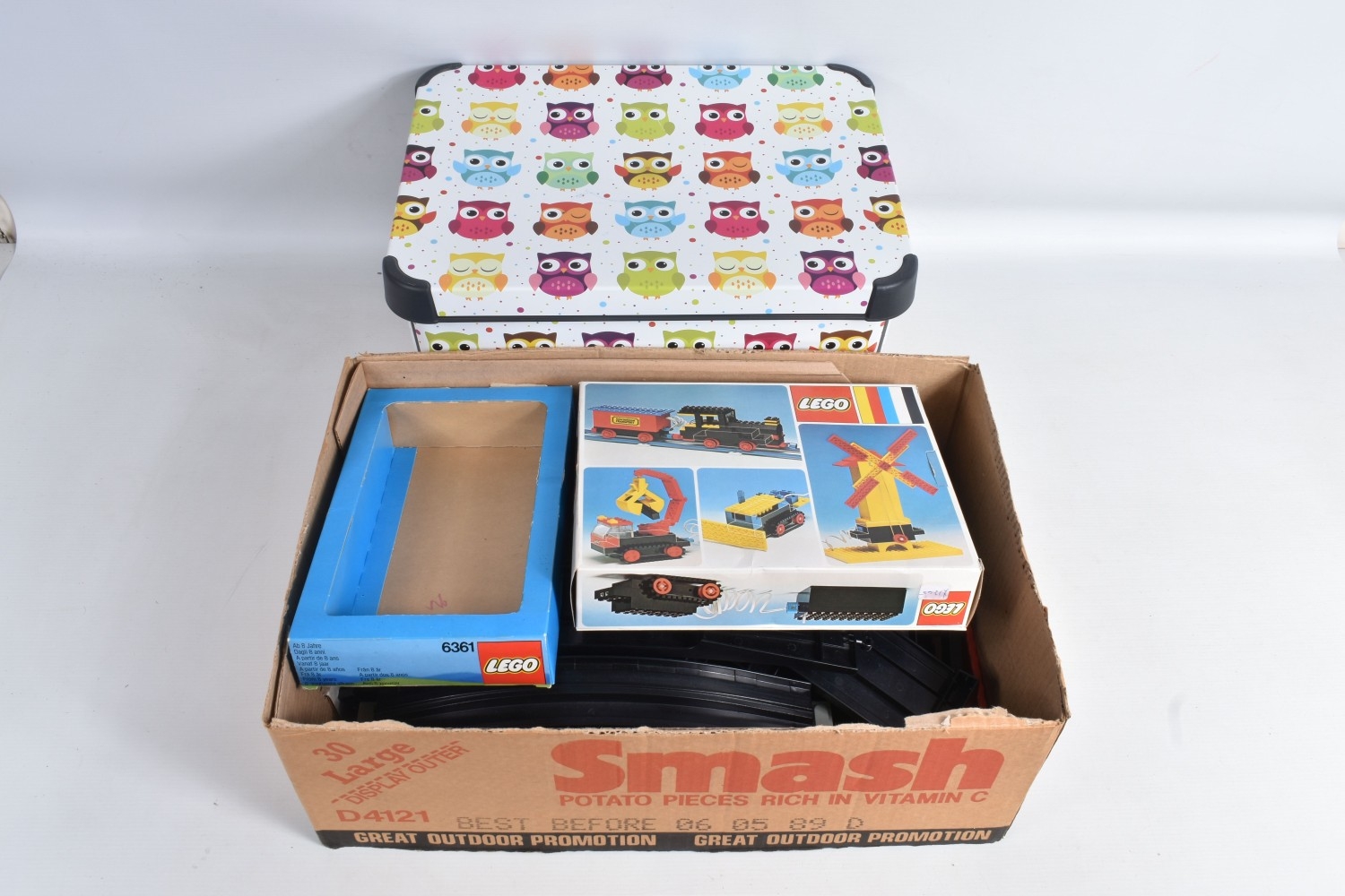 A QUANTITY OF UNBOXED ASSORTED LEGO DUPLO, includes railway locomotives & wagons, track and assorted road vehicles, all in playworn condition, together with a boxed 1970's Lego Electric Motor set, No.107 which appears complete and in good condition, box in good condition (2 boxes)