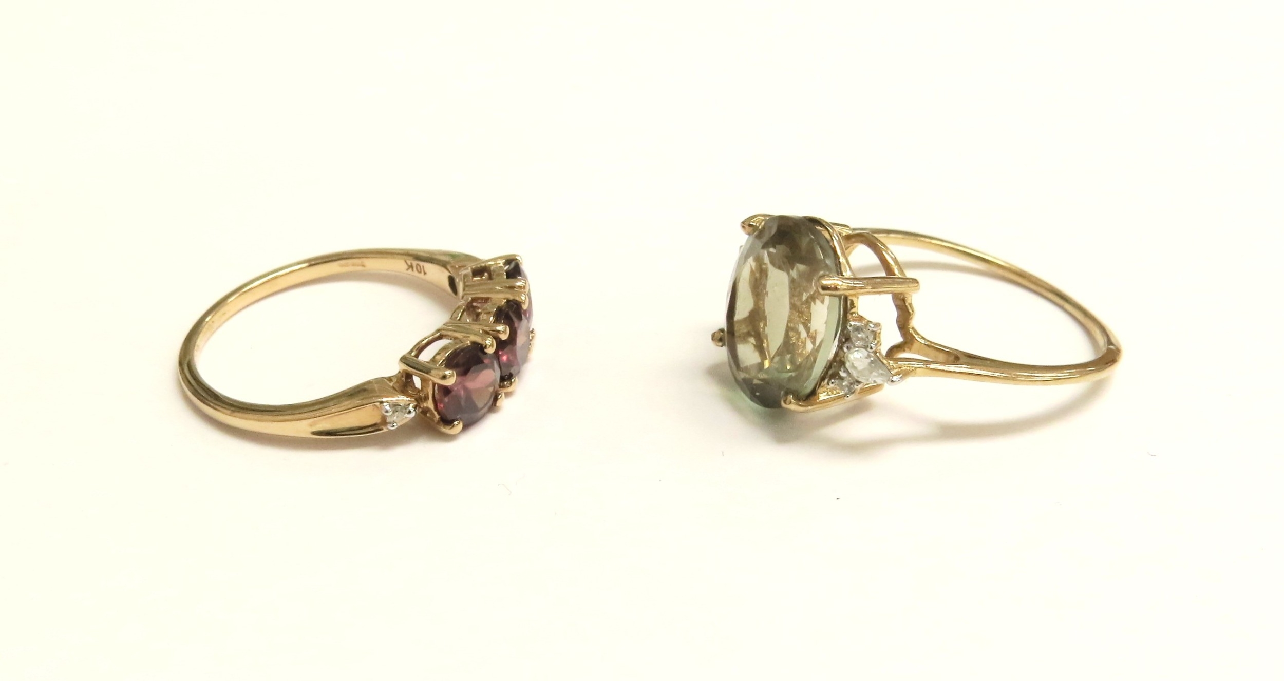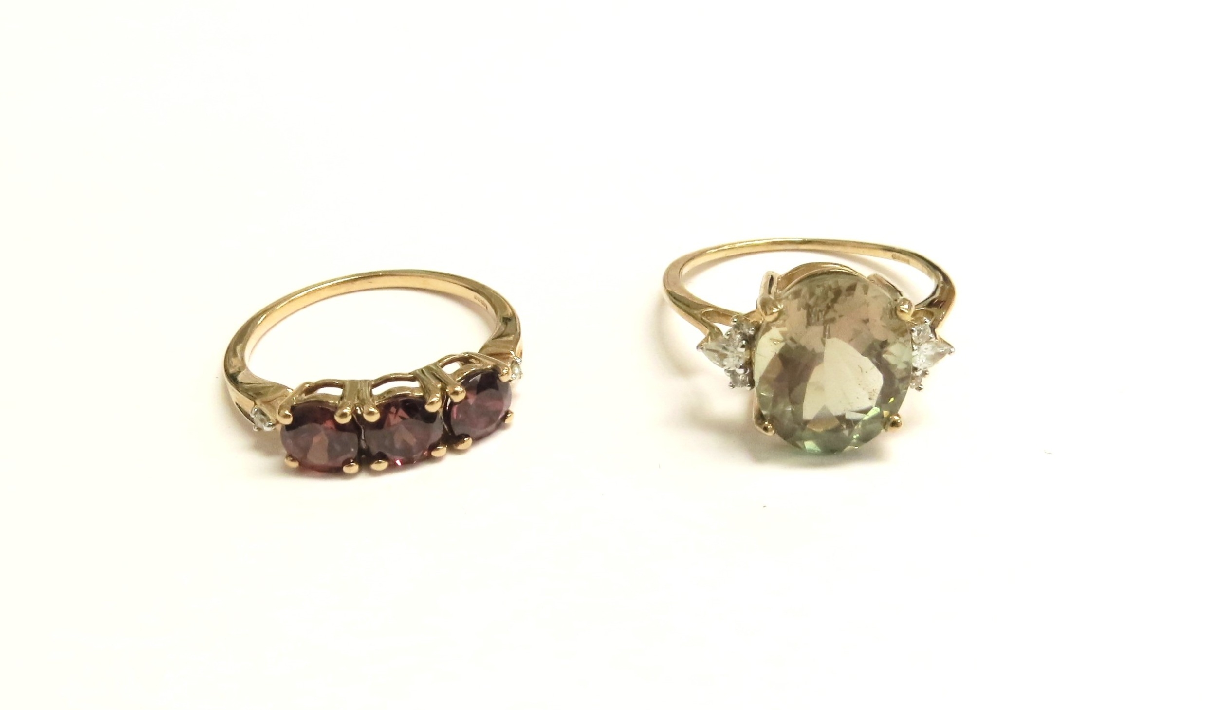 Two 9ct gold rings including Zanzibar zircon and diamond, size N/O and Oregan sunstone and white zircon, size P/Q, 5.1g