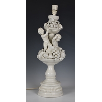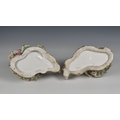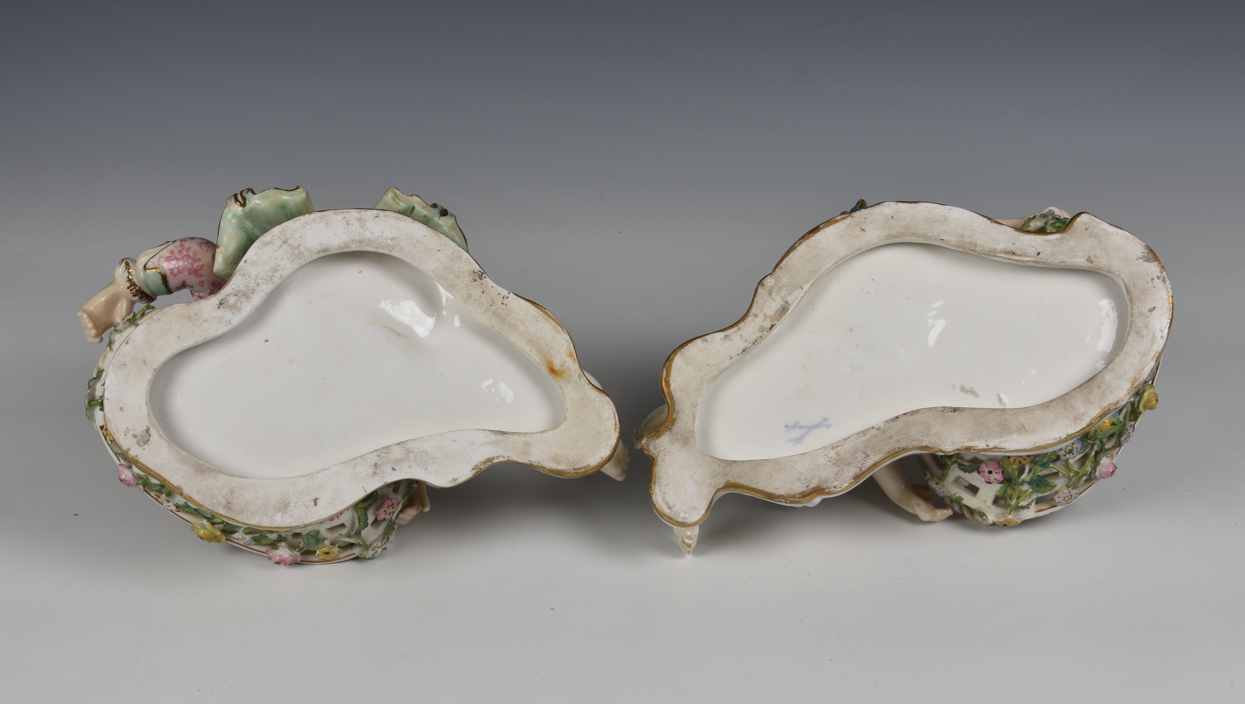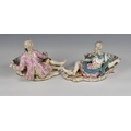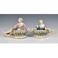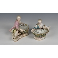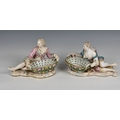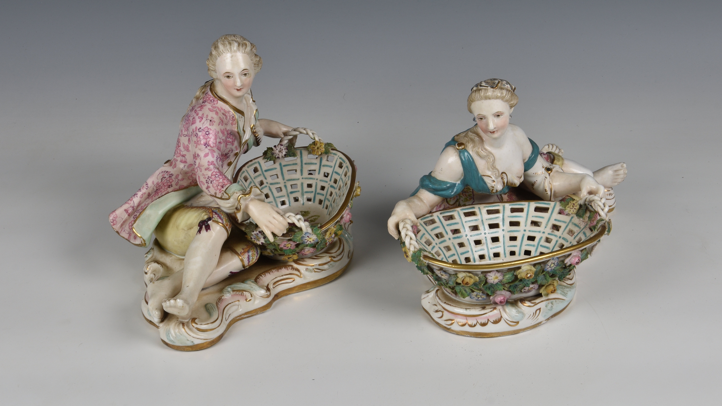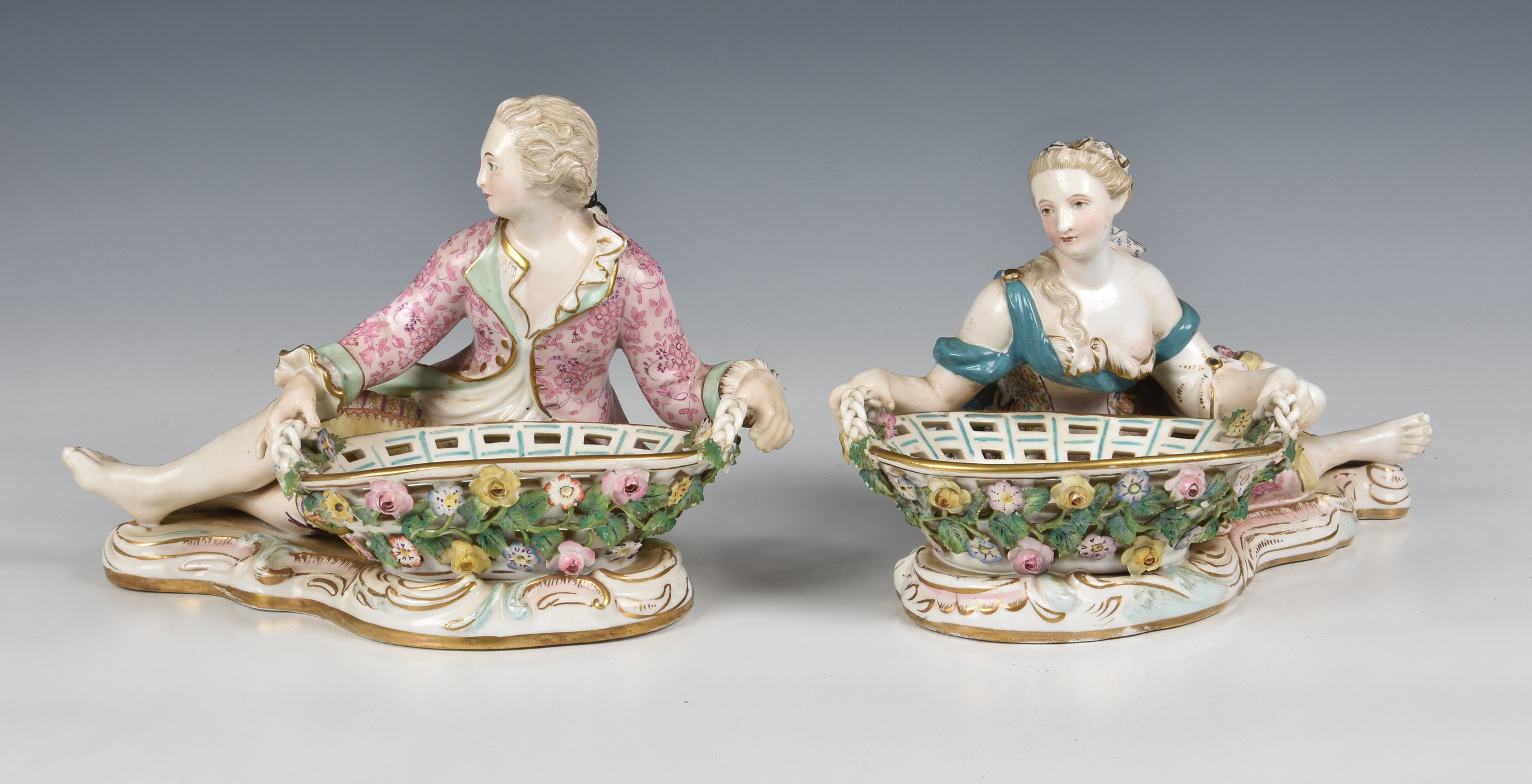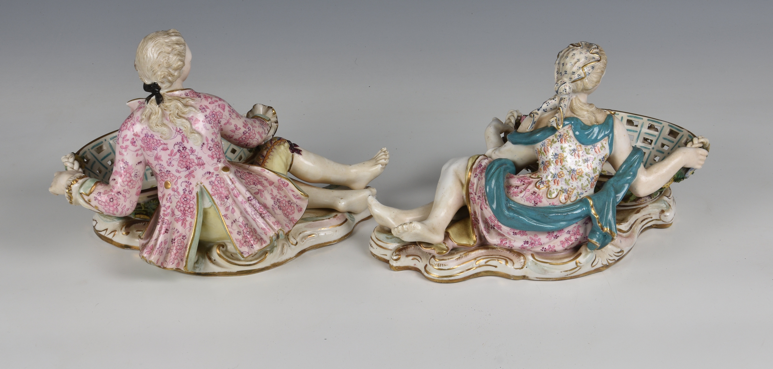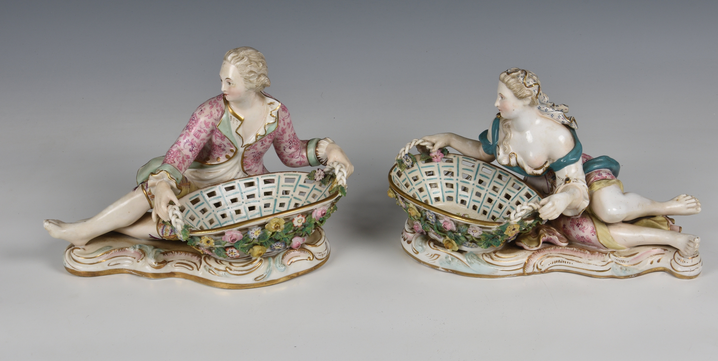 A pair of Meissen porcelain bon-bon baskets circa 1880 modelled as reclining male and female figures each with basket weave bowls, the man wearing a pink floral jacket and the woman wearing a matching pink dress with a blue sash, the woman marked beneath with under-glaze blue crossed swords, 7 1/4in. (18.4cm.) high.