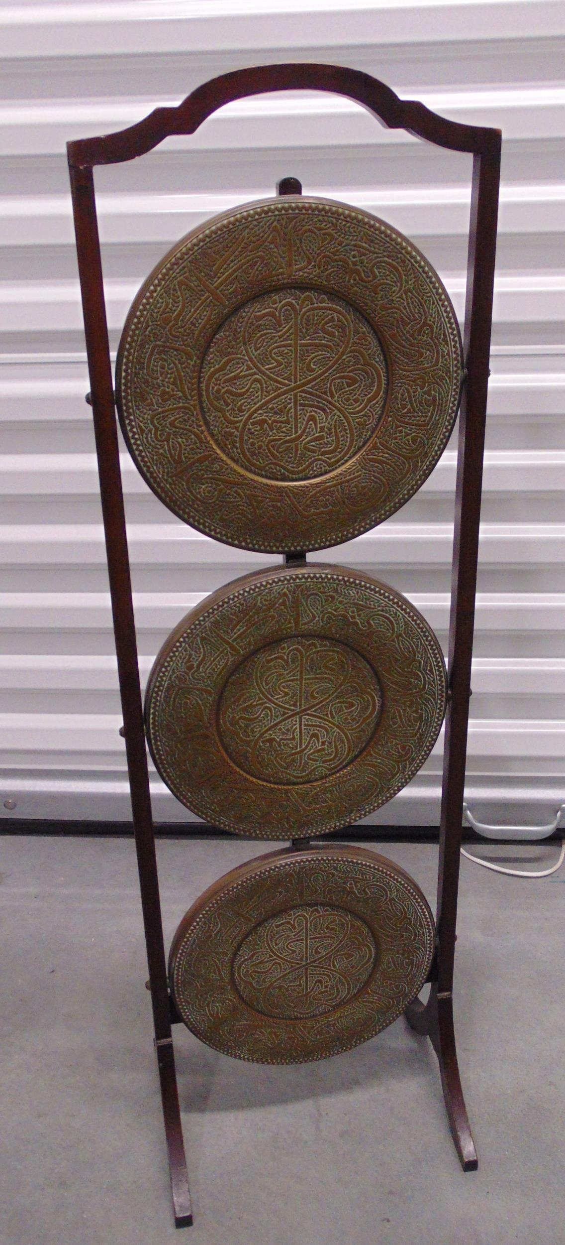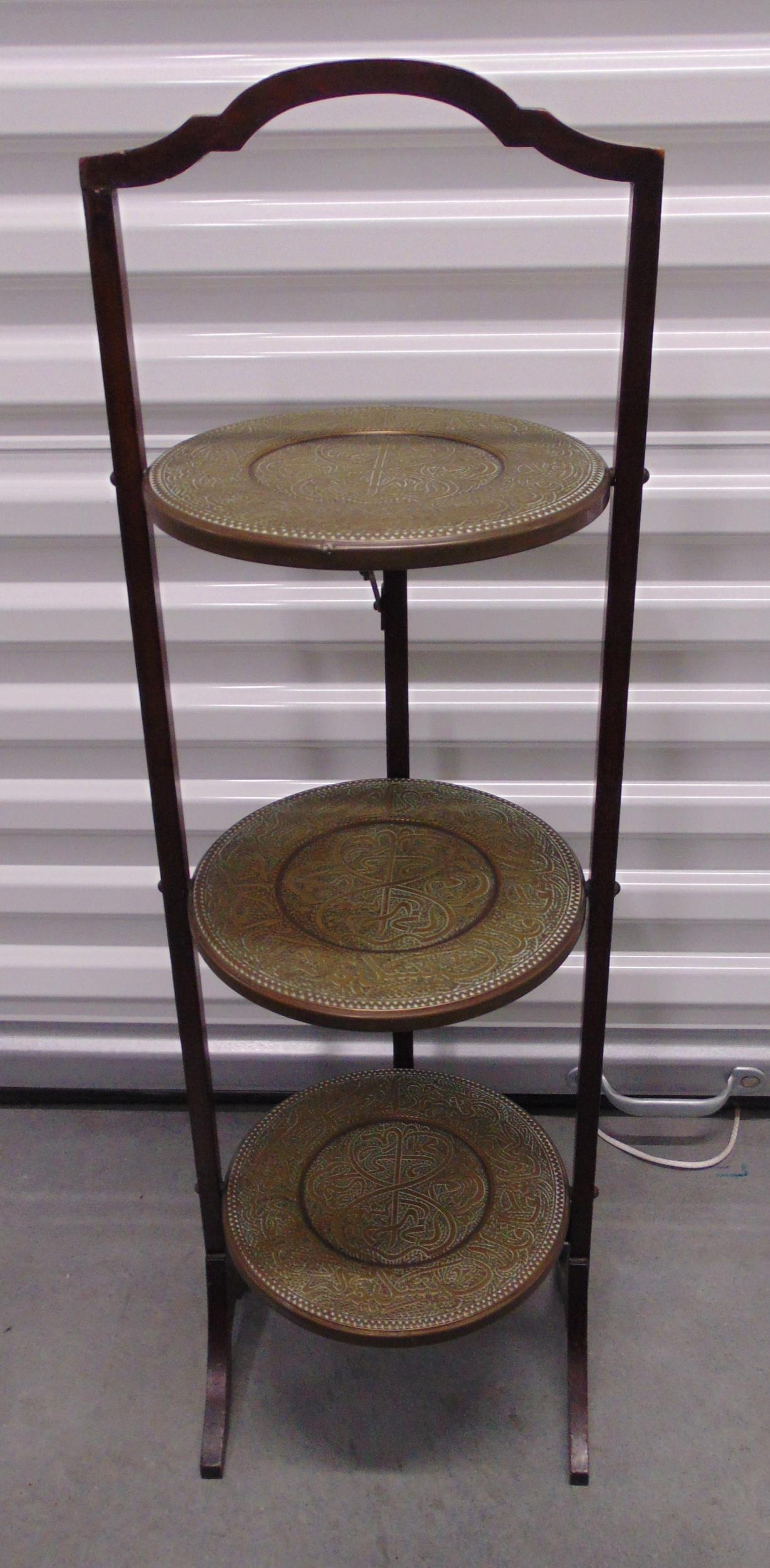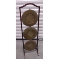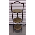 A three tier brass and mahogany plate stand of customary form, 87 x 27 x 25cm