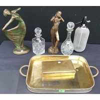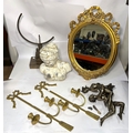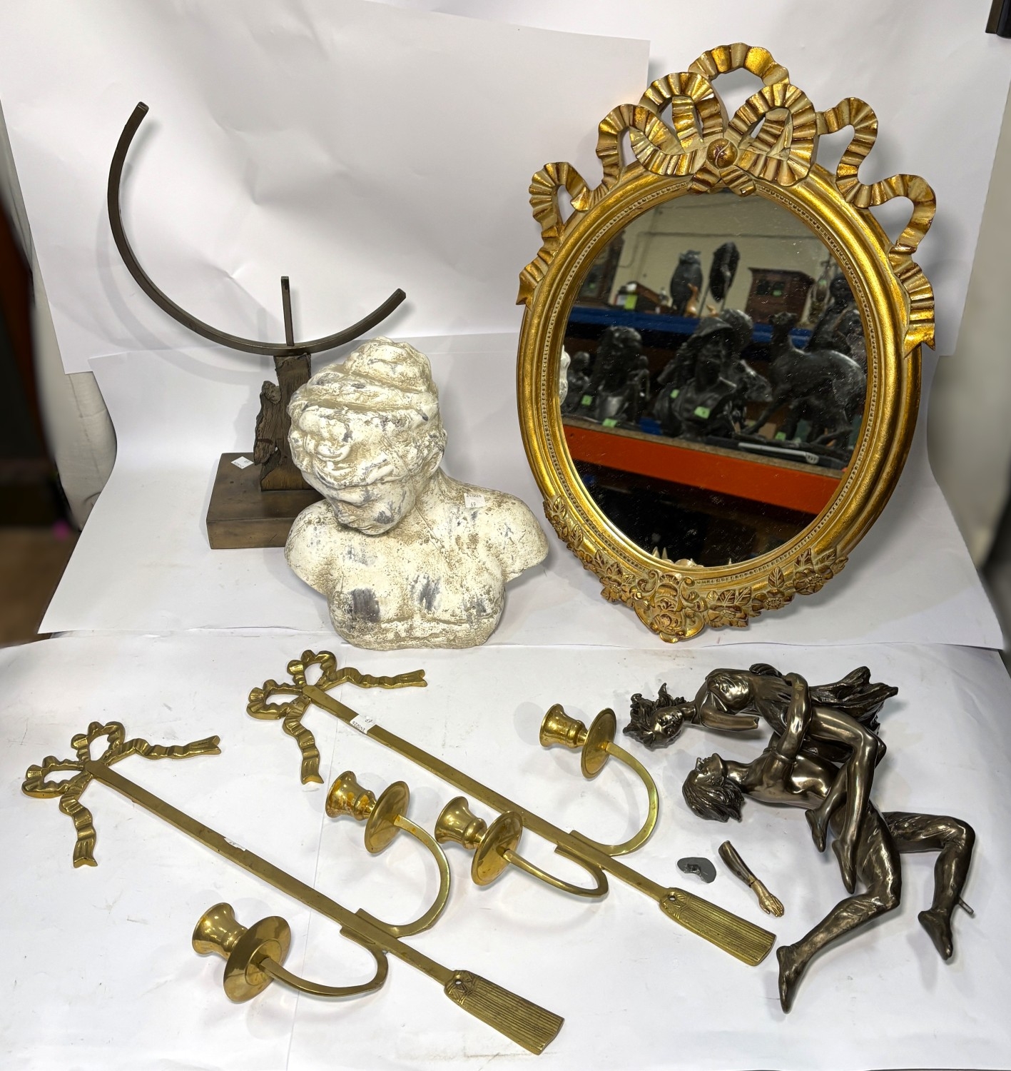 A gilt swag framed oval mirror and two pairs of brass swag wall sconces, plaster column and bust.