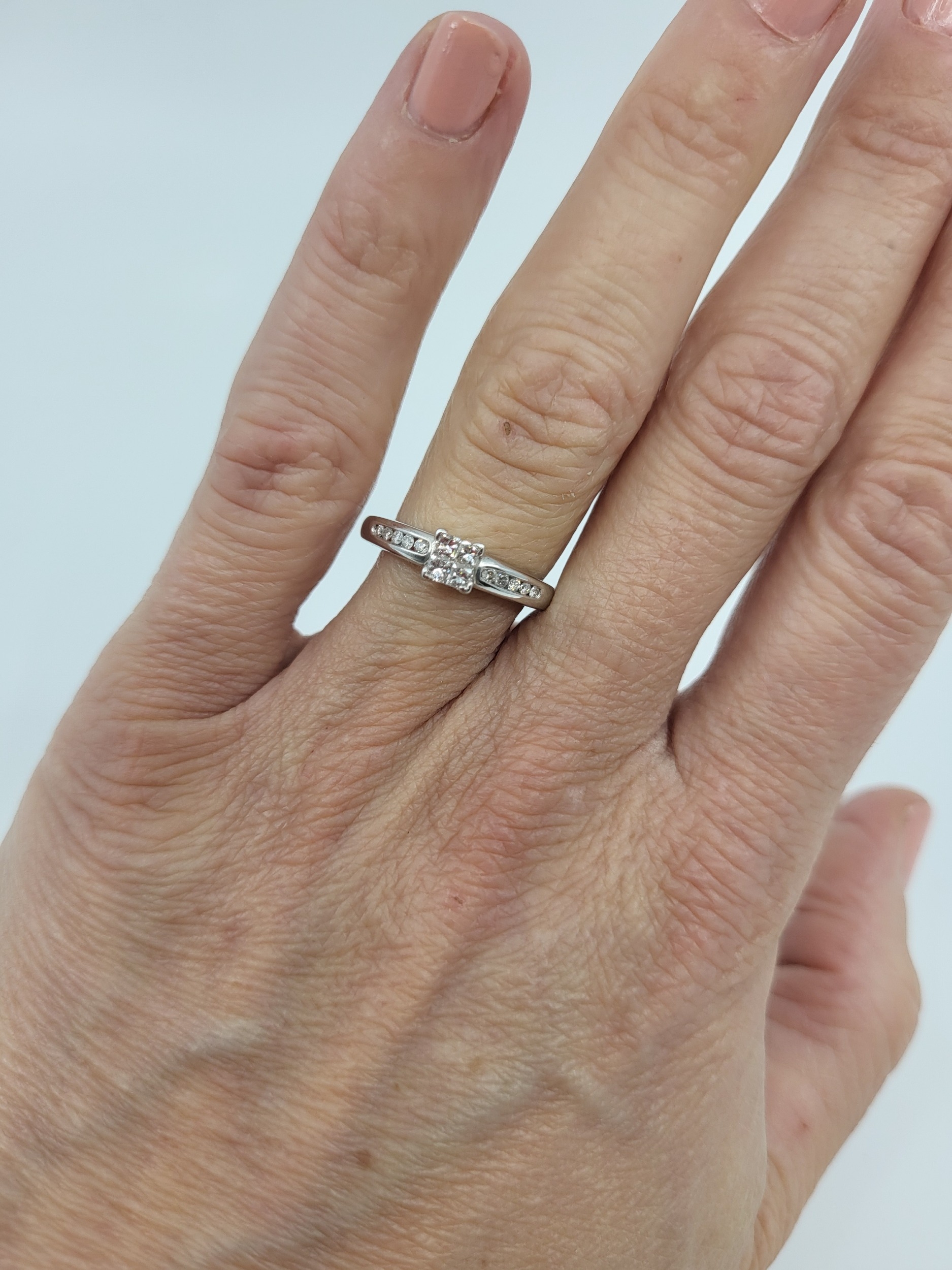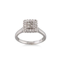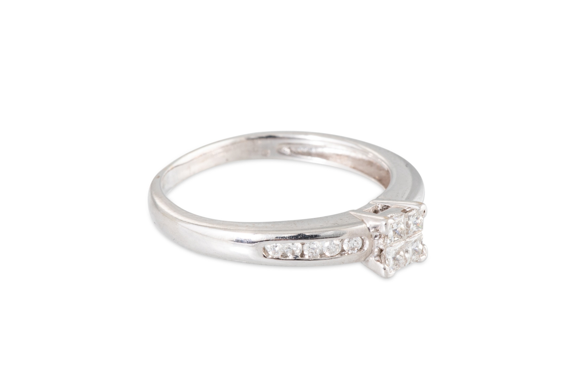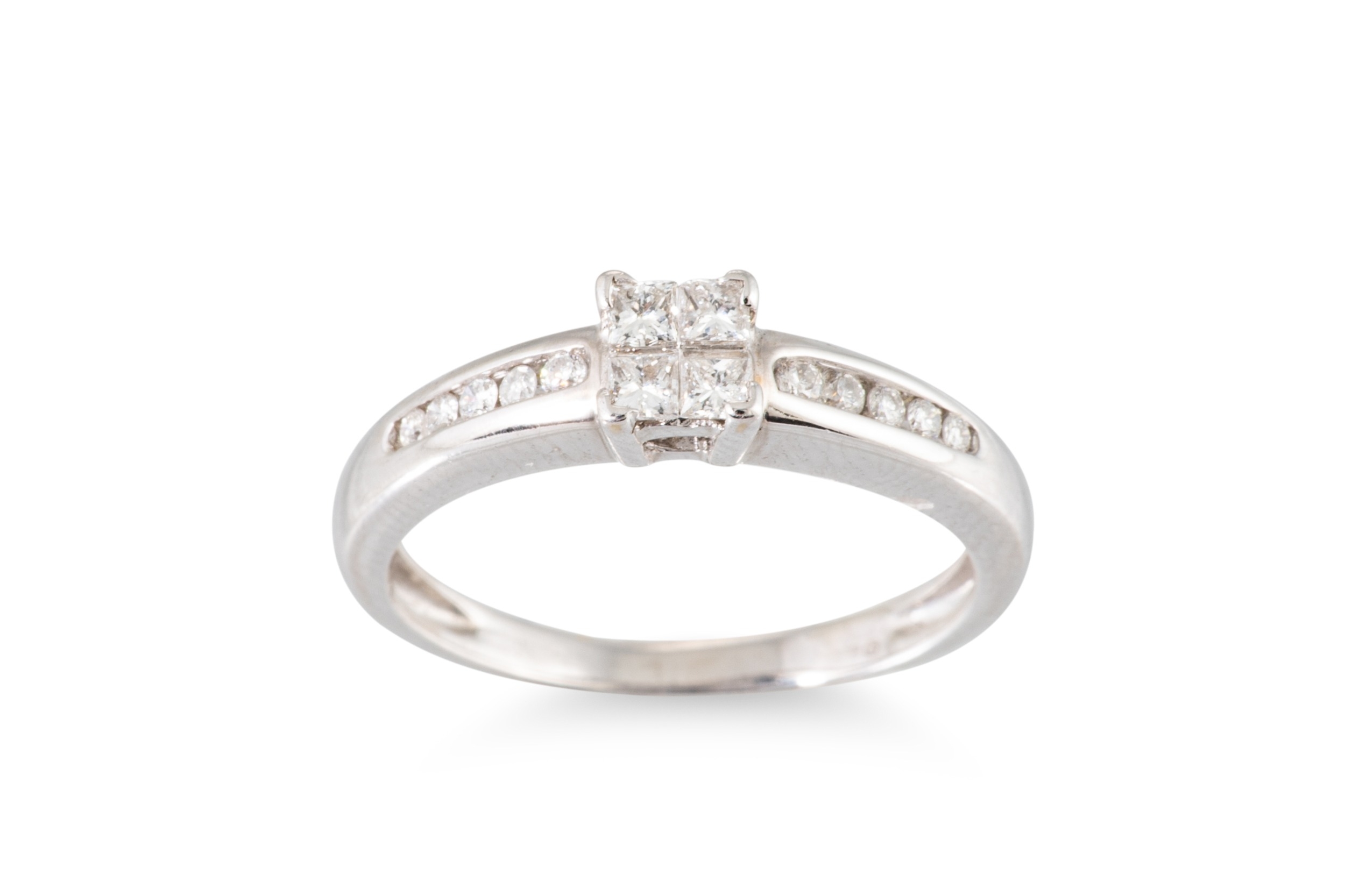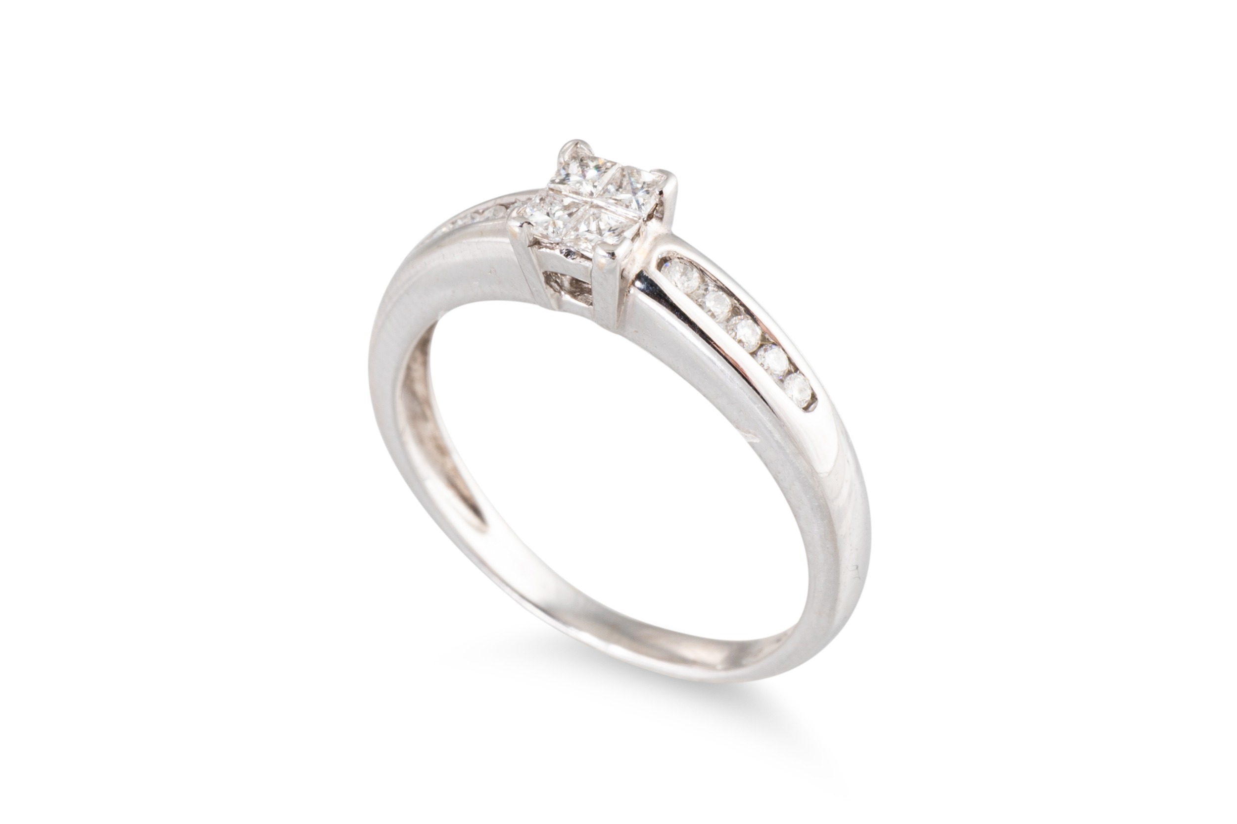 A DIAMOND SQUARE CLUSTER RING, four princess cut diamonds to round brilliant cut diamond shoulders, mounted in 18ct white gold, size M