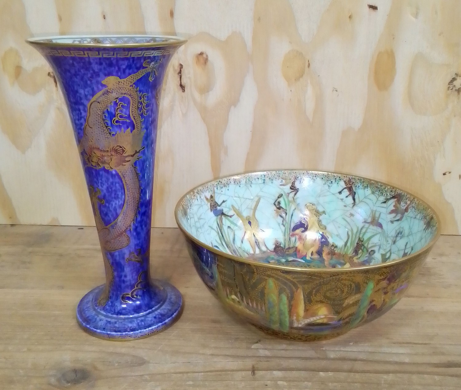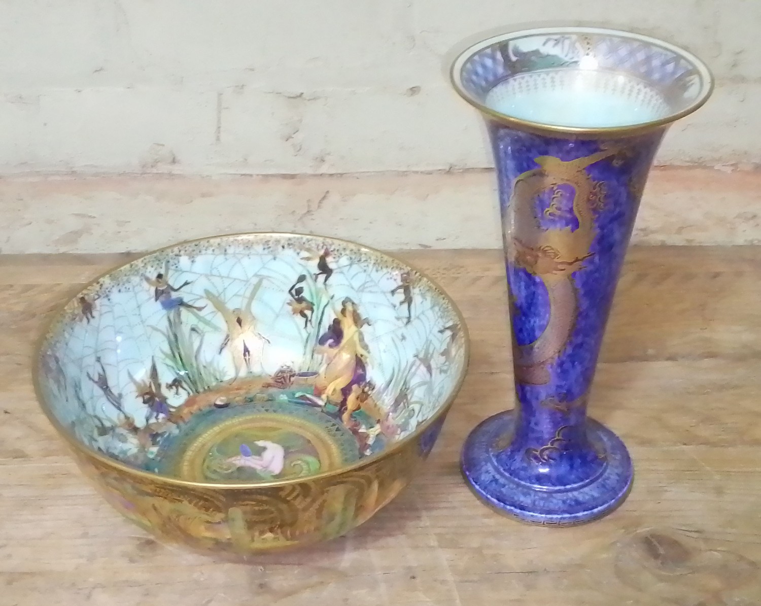 A Wedgwood Fairyland lustre bowl, diameter 23cm, and a Wedgwood lustre vase, height 25cm.