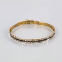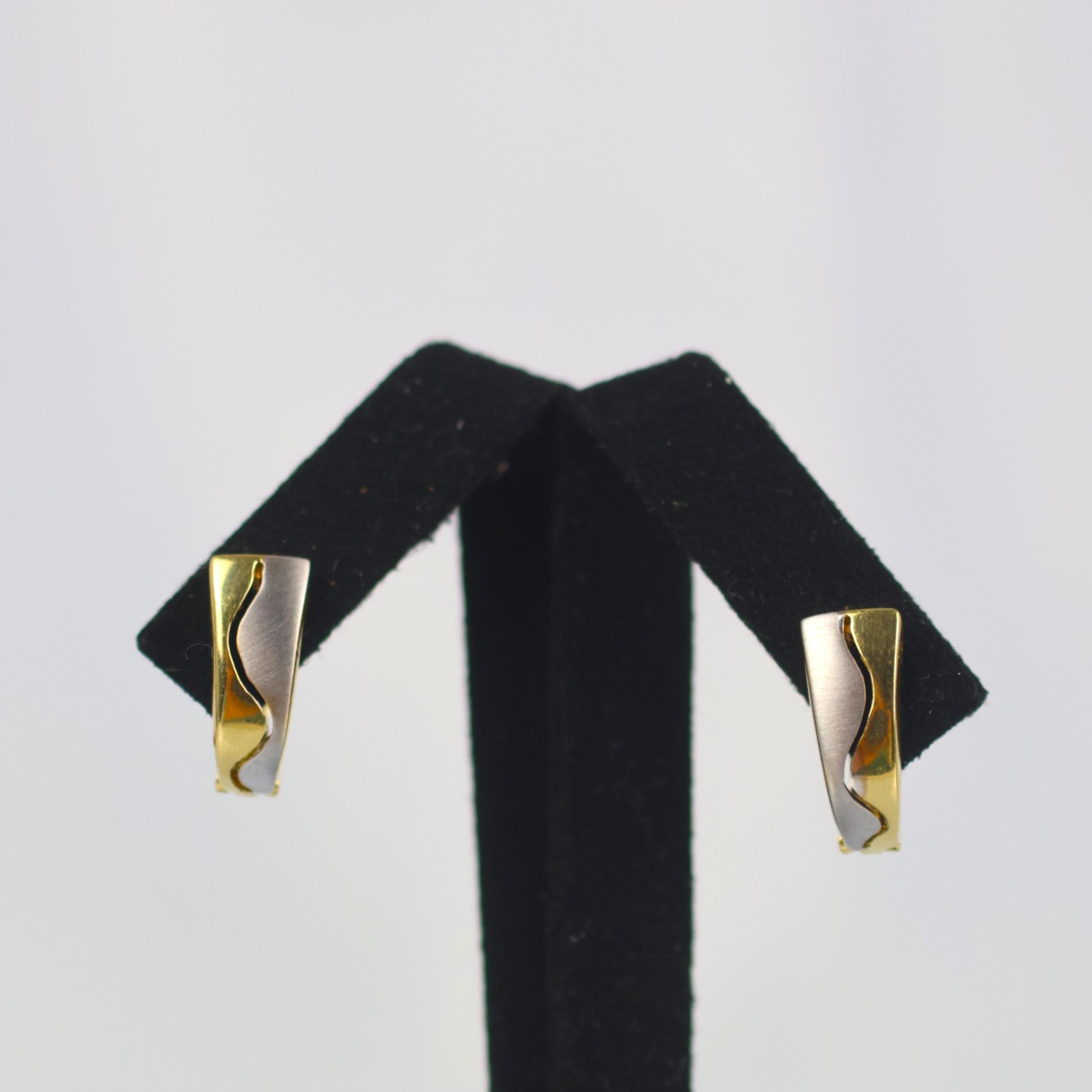 A pair of two tone 'huggie' style earrings, the organically shaped front with curved white and yellow metal detail, post fittings, marked for '585' 1.5cm long, 2.2gms (2)