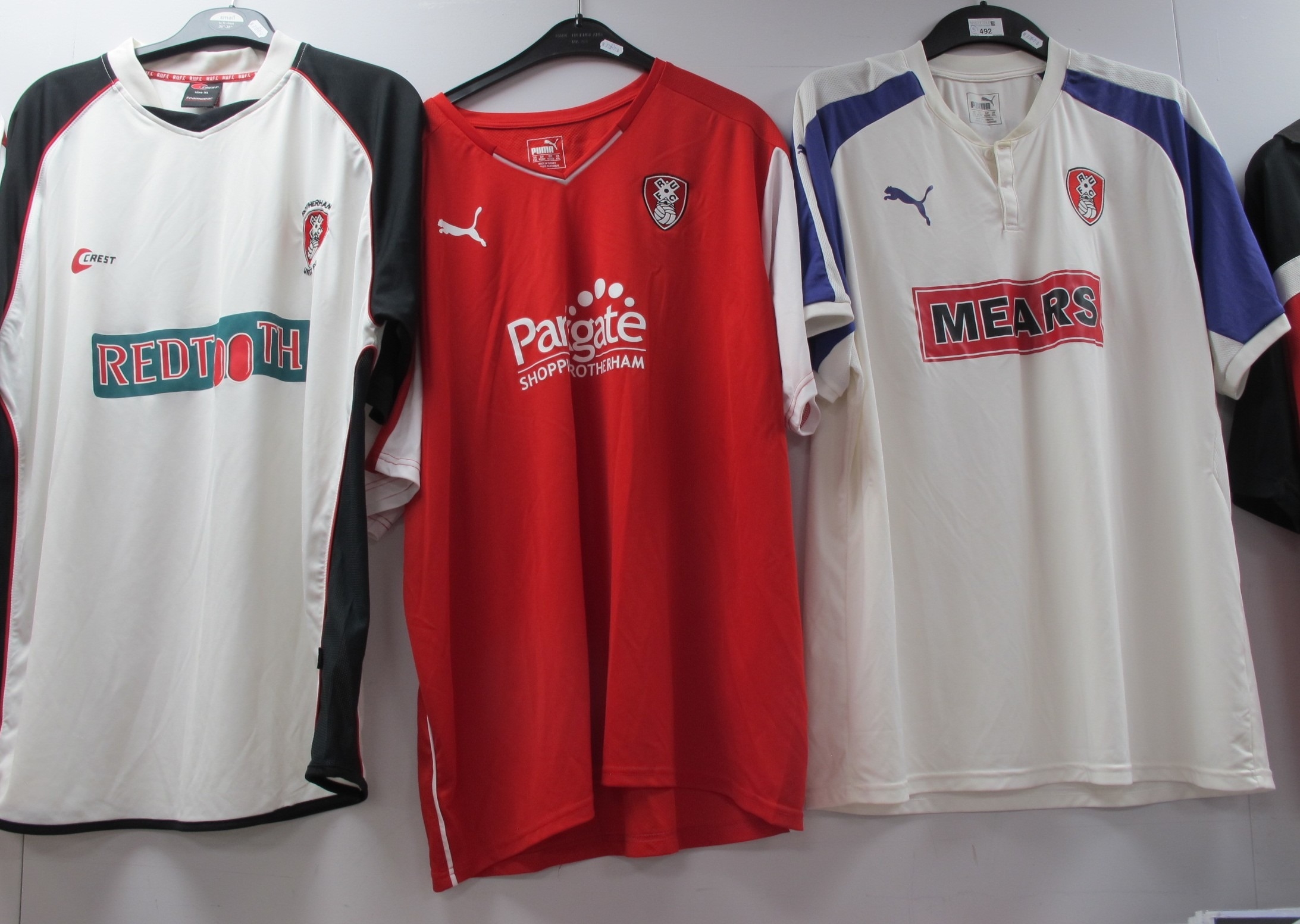 Rotherham United Crest White Away Shirt bearing 'Red Tooth' logo size XL, Puma white away shirt bearing 'Mears' logo and Puma home 'Parkgate' logo, both XXL (3).