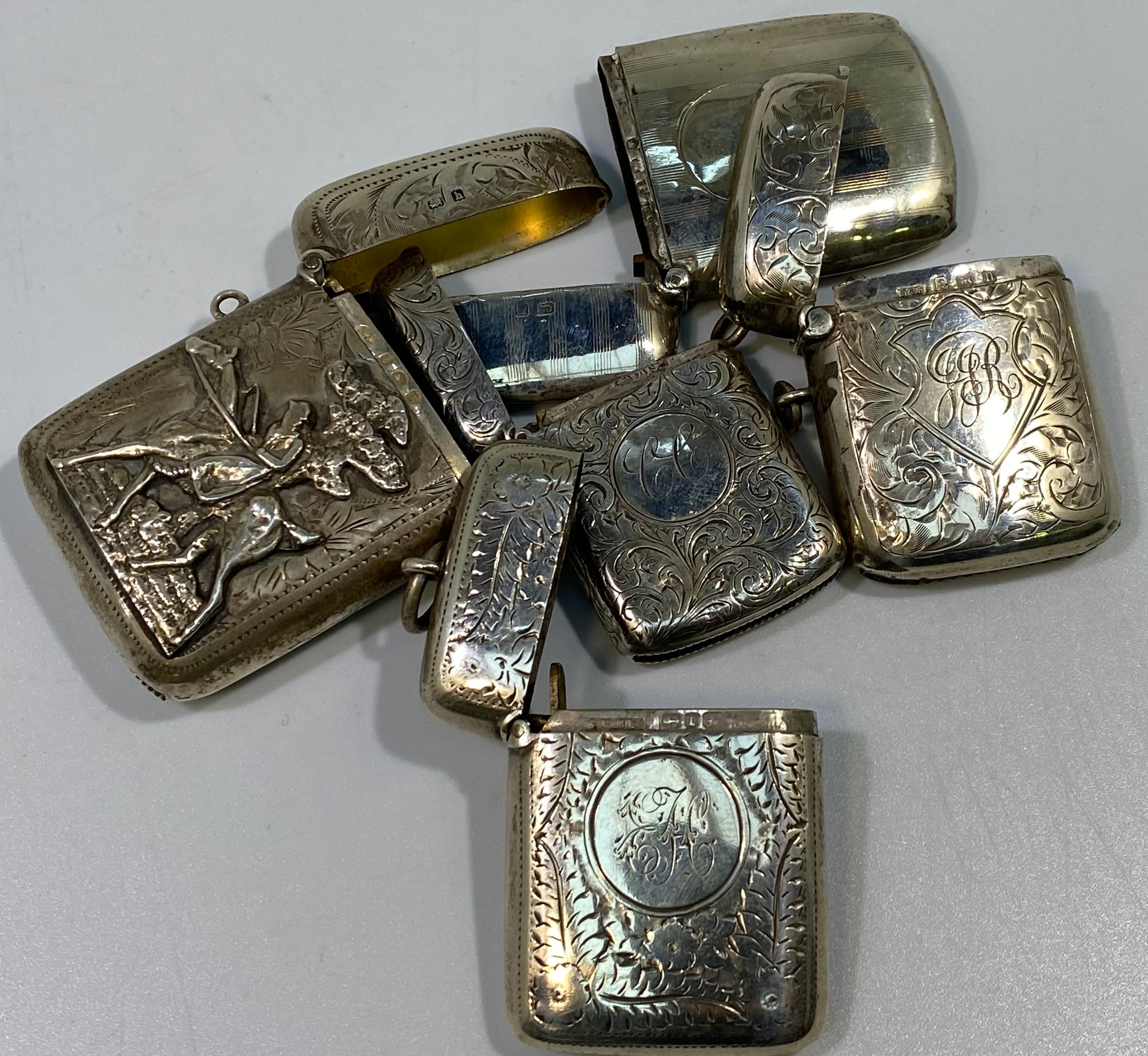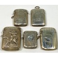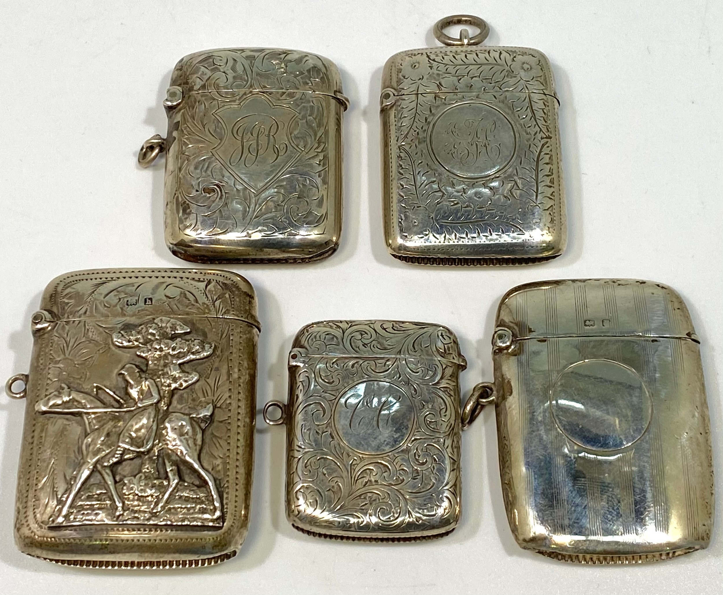 Five various silver vesta cases including an example with applied figure of a lady holding a crop on horseback and foliate engraving, Birmingham, 1907, G Loveridge & Co, 3.75 ozt
