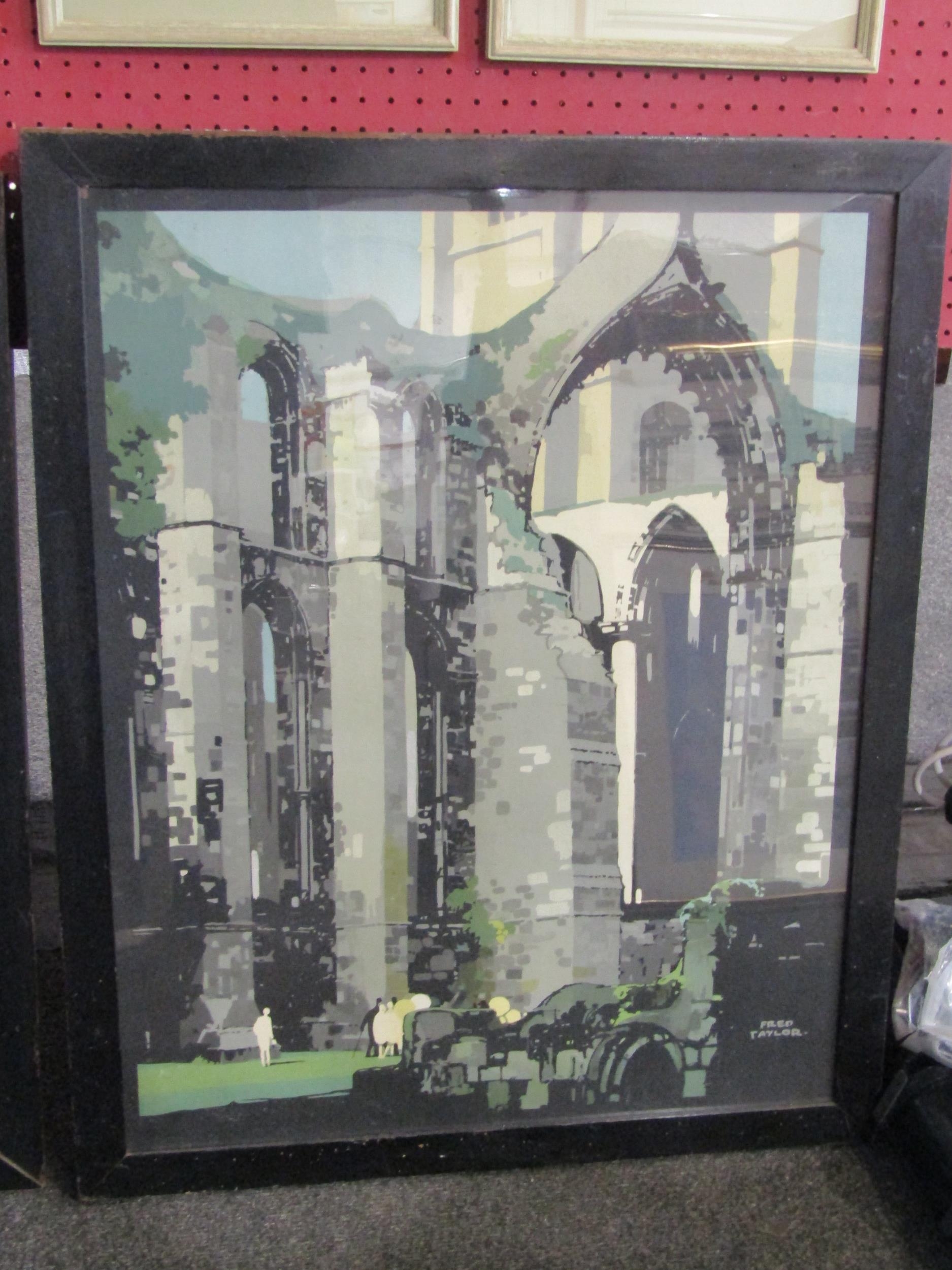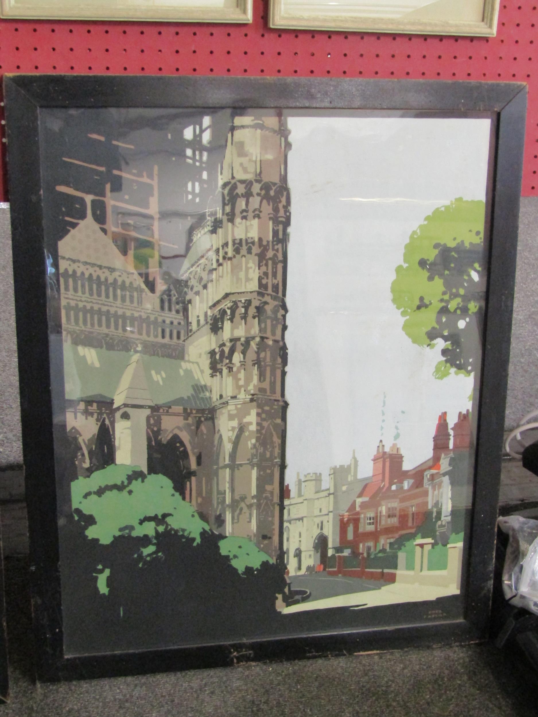 After Fred Taylor - two framed and glazed railway poster type prints, architectural studies. Image sizes 67cm x 53cm. From the estate of Antony Maitland, illustrator and artist, winner of the Kate Greenaway medal 1961