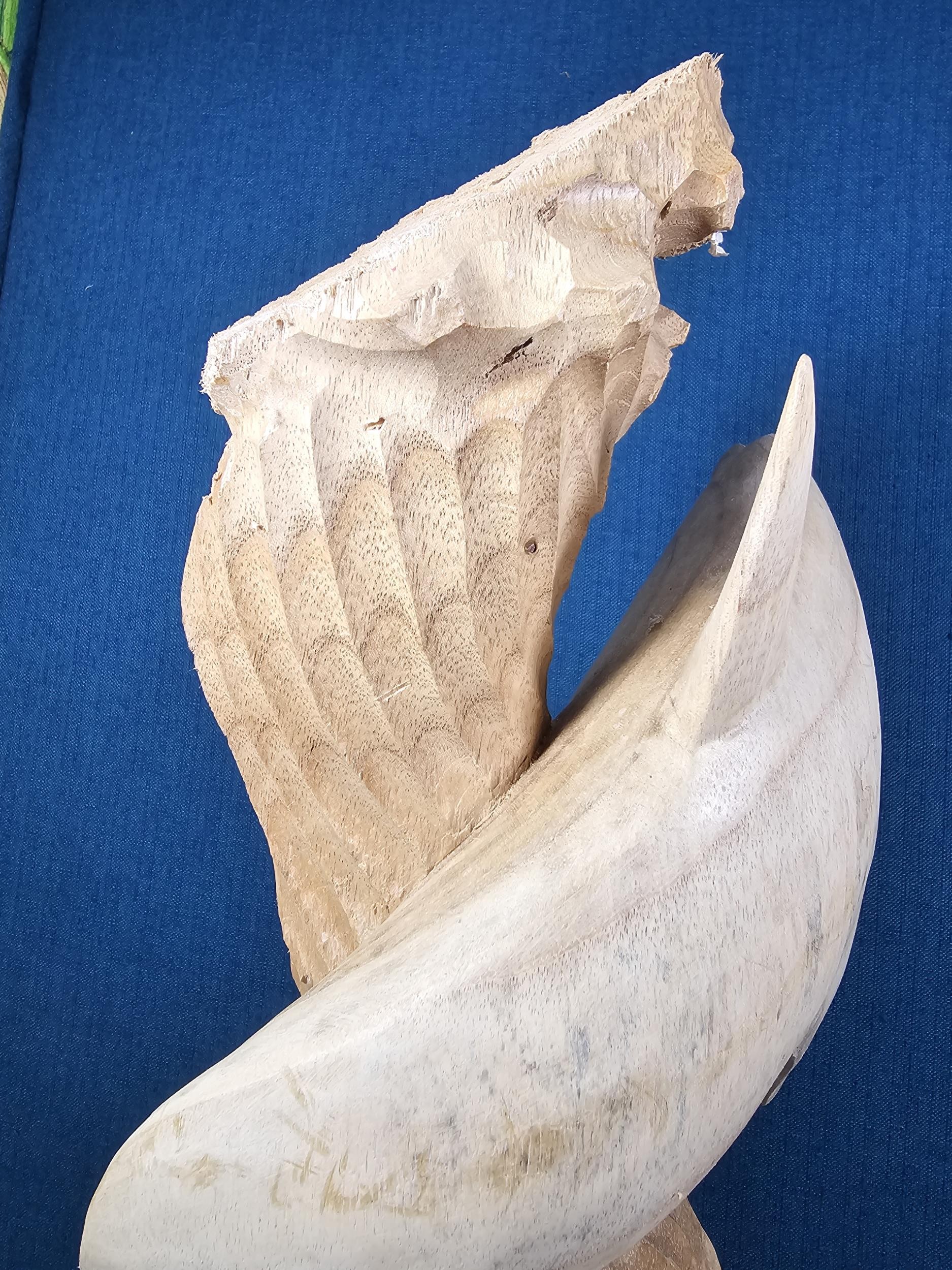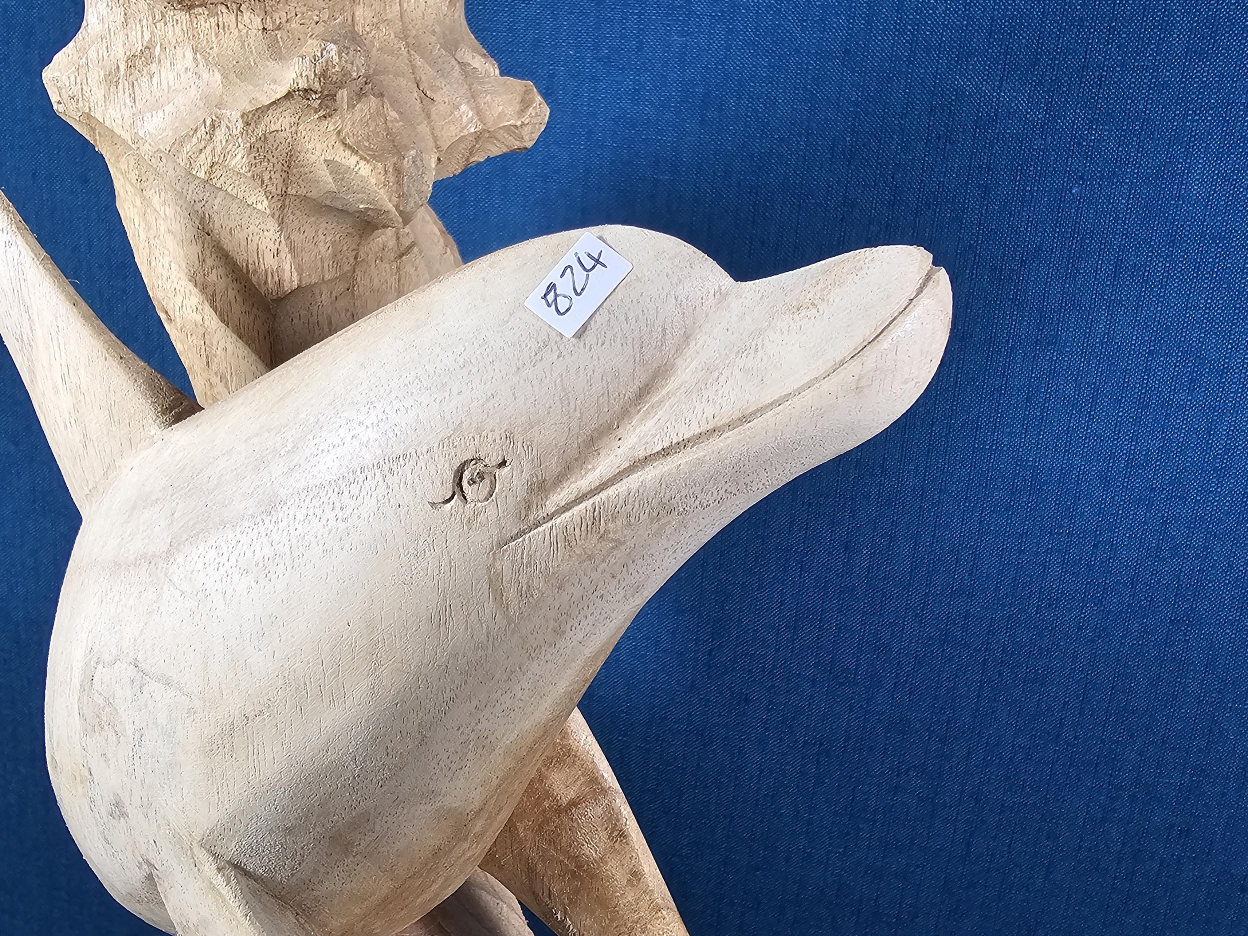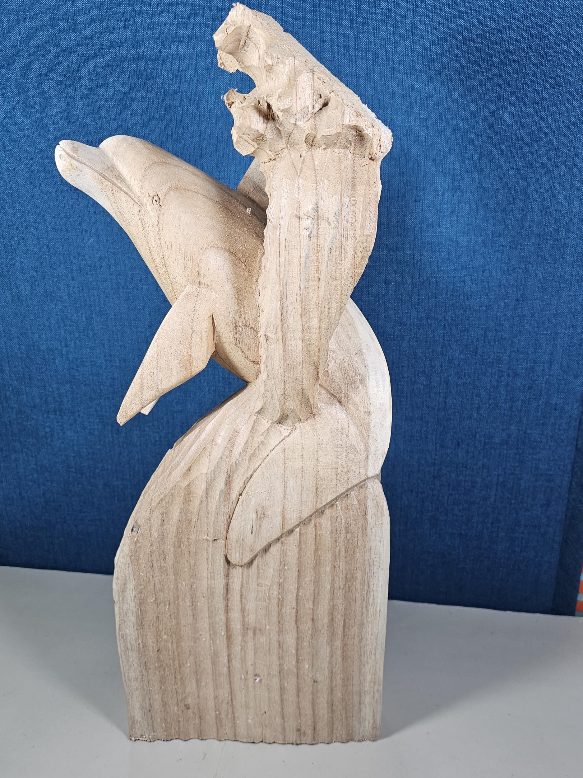 A large hand carved wooden sculpture of a leaping dolphin, well executed, with no visible damage. It has a height of 64cm, a width of 21cm and a deph of 13cm.