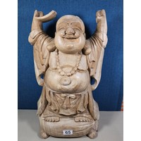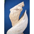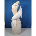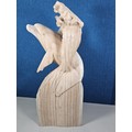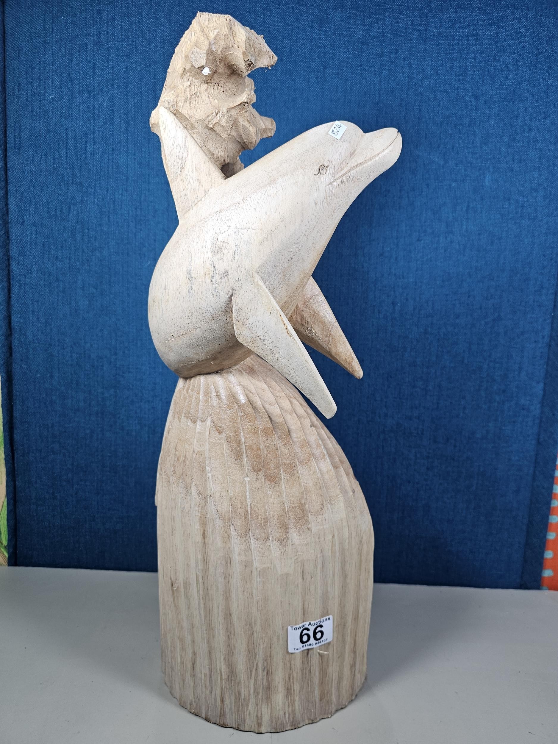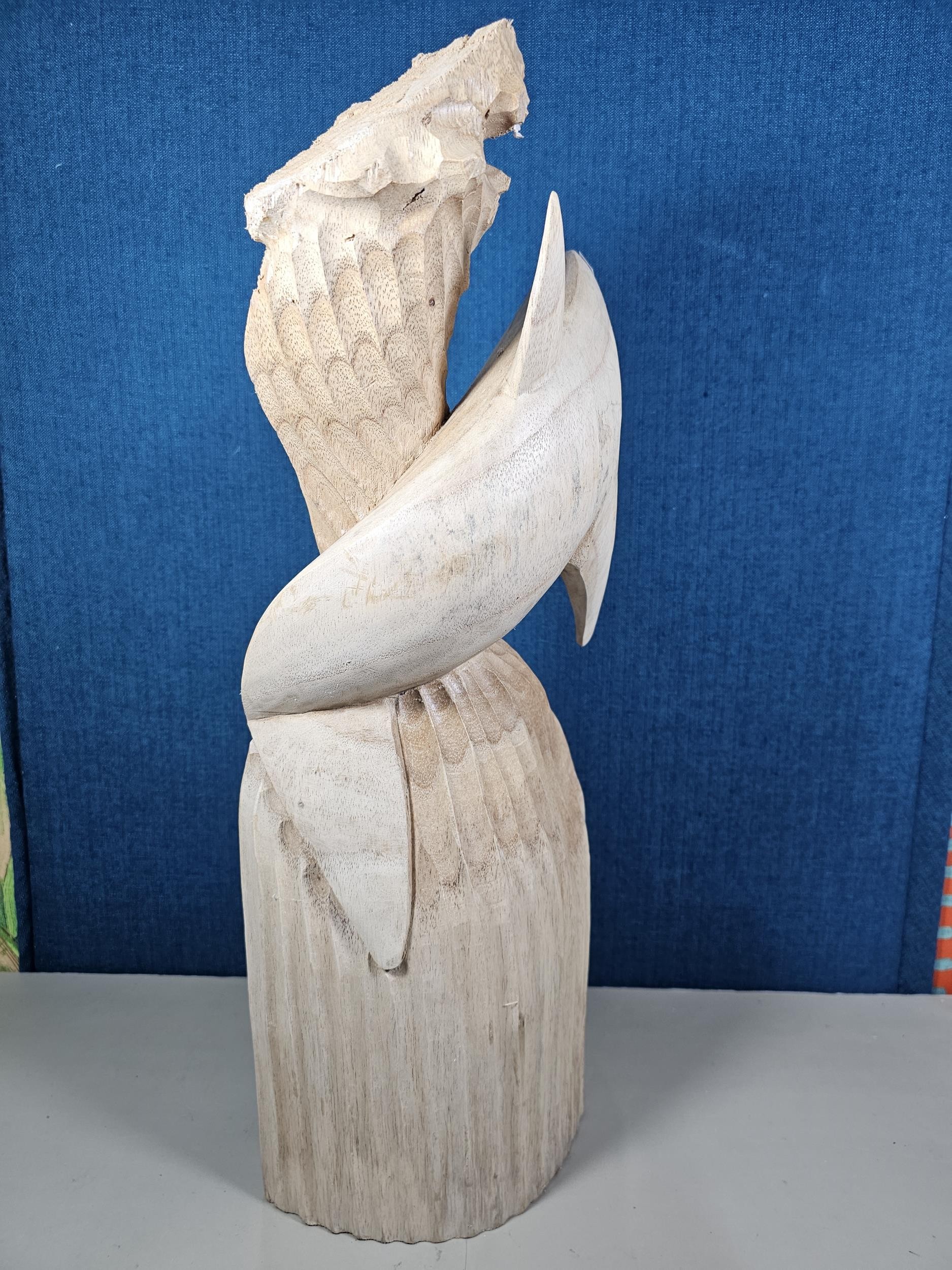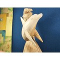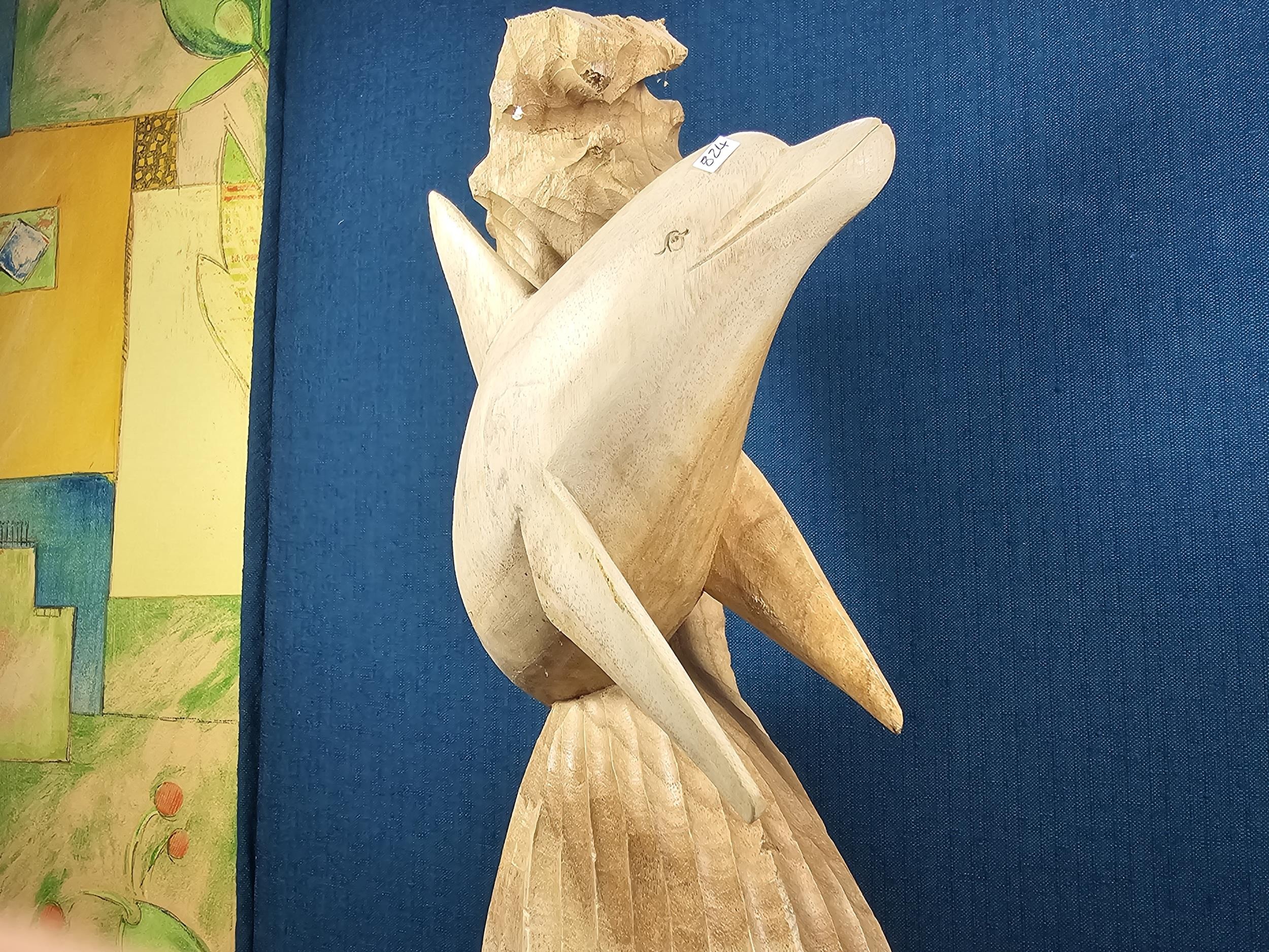 A large hand carved wooden sculpture of a leaping dolphin, well executed, with no visible damage. It has a height of 64cm, a width of 21cm and a deph of 13cm.