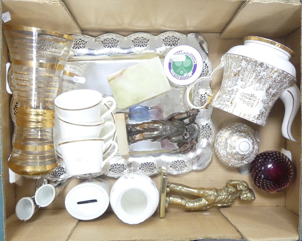 A mixed collection of items to include Coalport vase, Wedgwood Wimbledon trinket box, Royal Tuscan teacups and saucers, silver-plated commemorative tray and Royal Windsor 50th Anniversary teapot. Etc (1 Tray)