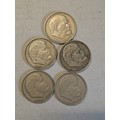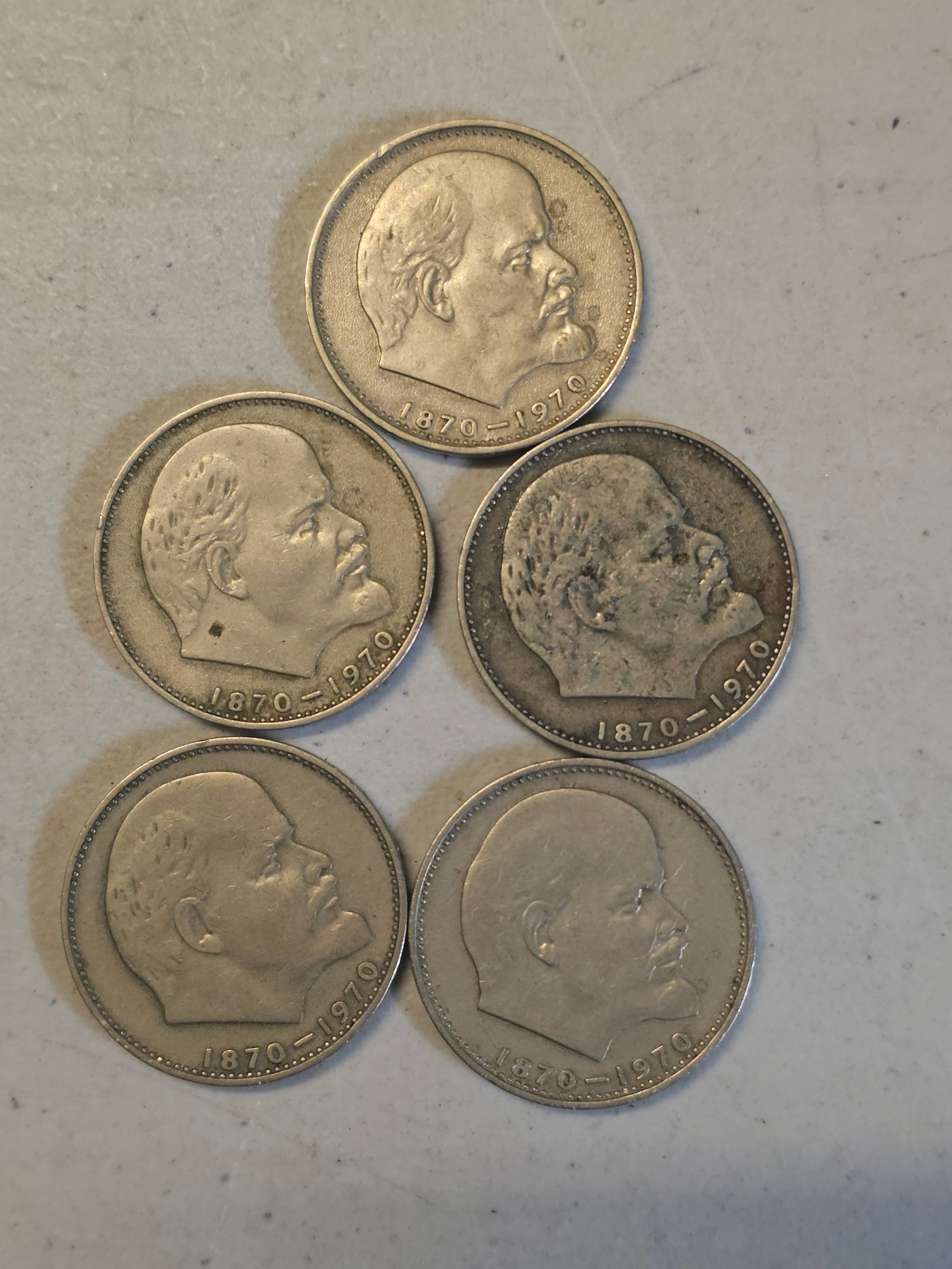 5 Vintage Soviet coins, 1 Rouble each with Lenin in front