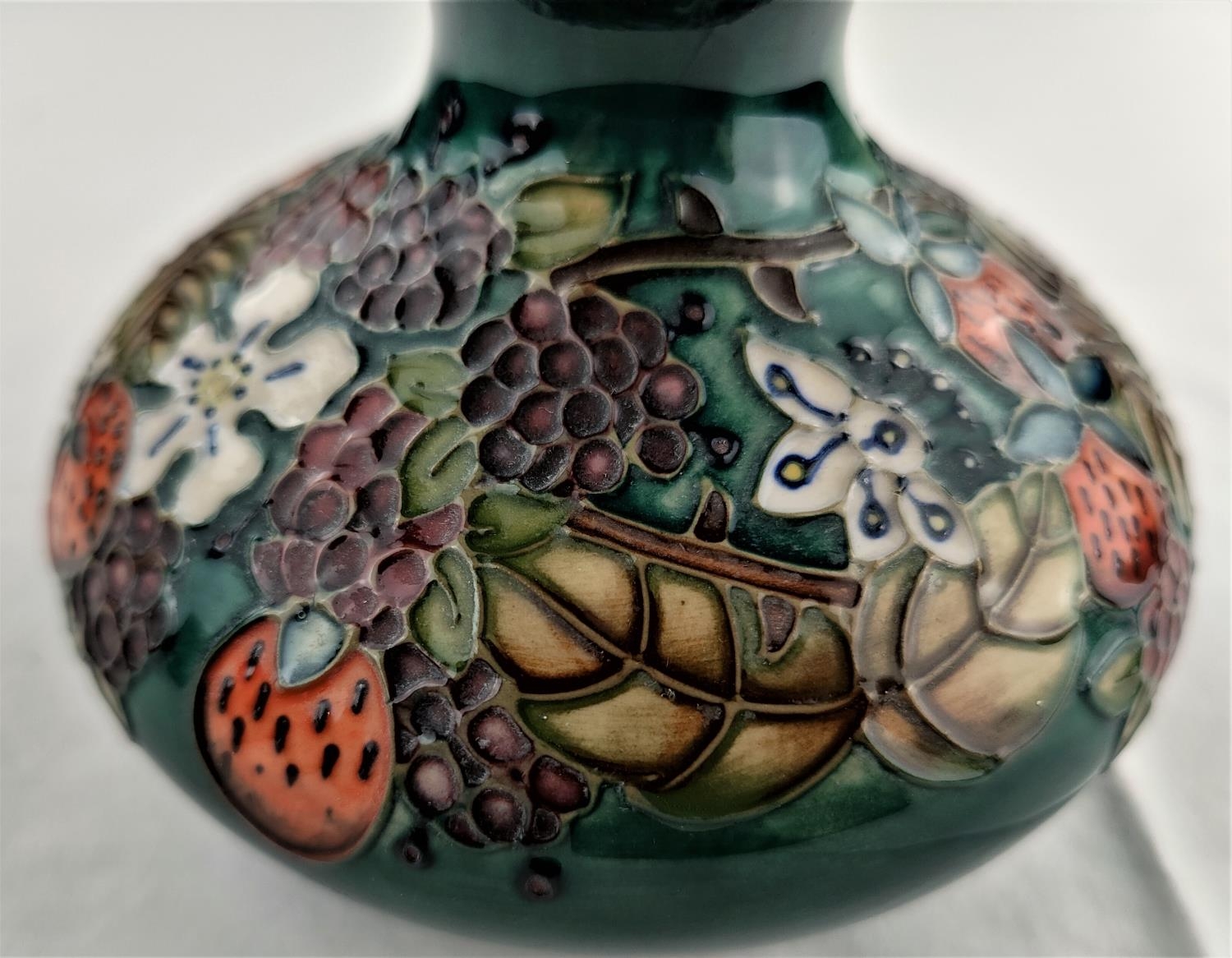 A Moorcroft Carousel vase in squat circular form decorated strawberries & grapes No 823 impressed & monogrammed diameter 13cm