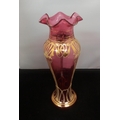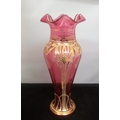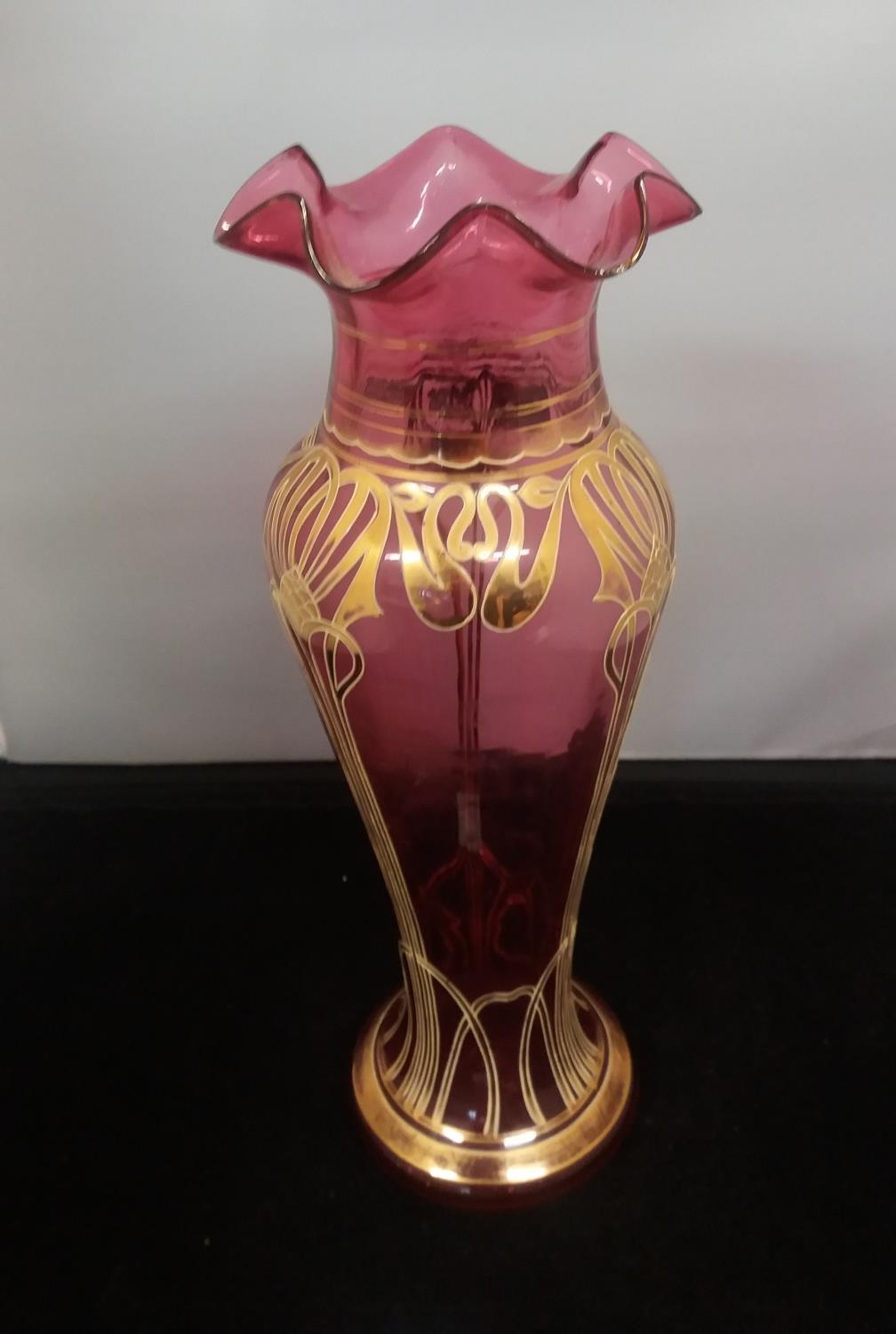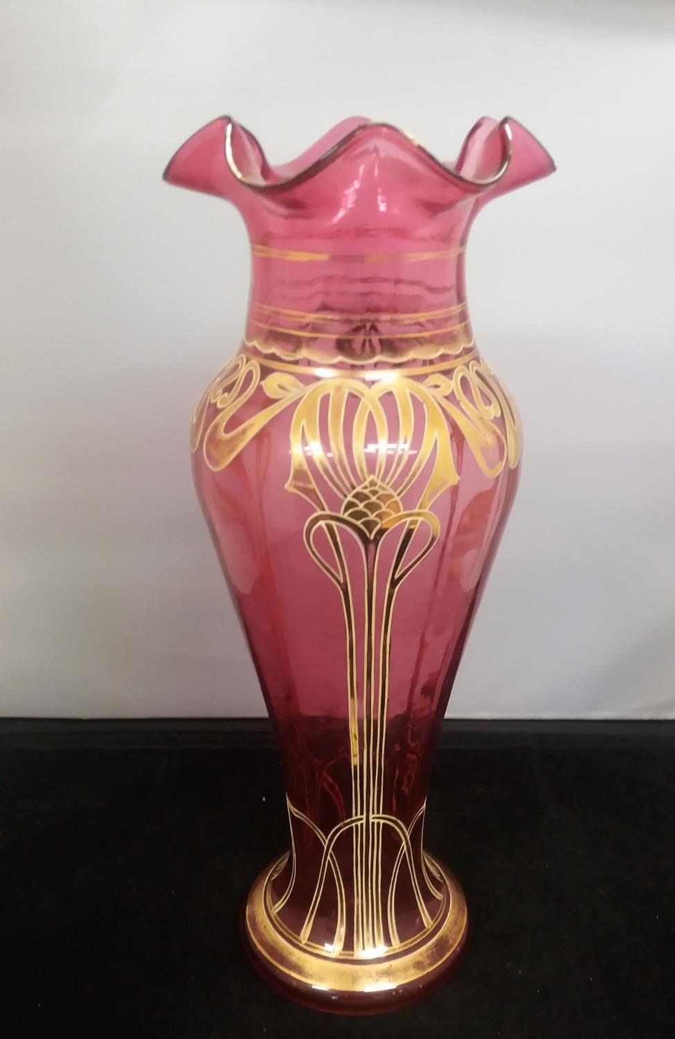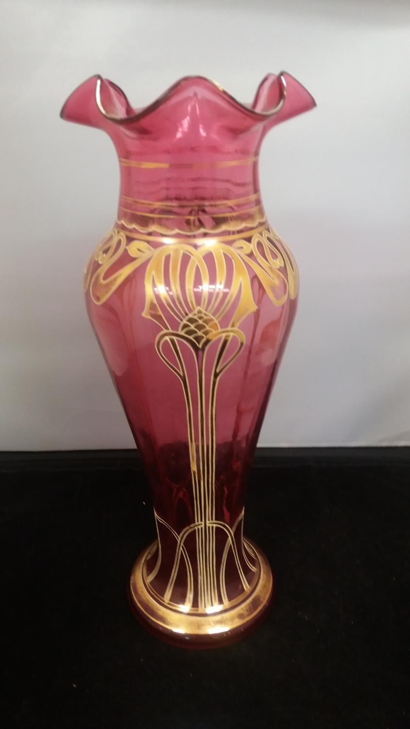 c1900 Bohemian Art Nouveau Cranberry Blown Glass Fluted 34cm Vase. Nibbles to Rim.