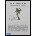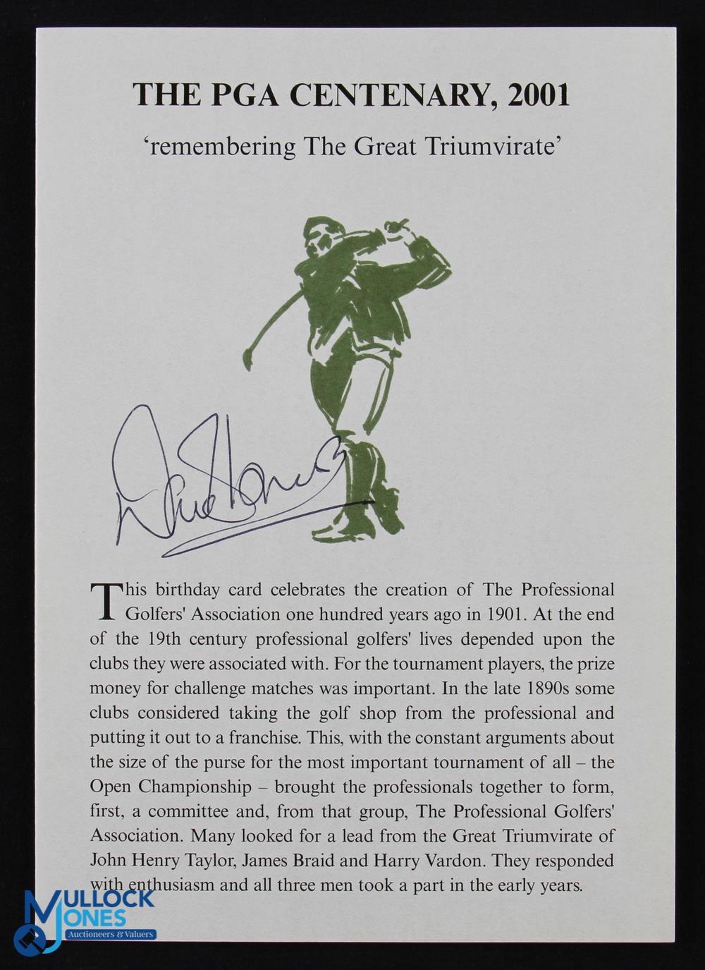 Harold Riley 2001 PGA Centenary Celebration Signed Folding Card - titled "Remembering The Great Triumvirate" featuring 3x individual coloured drawings of James Braid, J H Taylor and Harry Vardon and signed by Riley to the back cover together with the PGA Centenary Captain Dave Thomas - a good piece of history telling the story of when PGA was formed in 1901. Note: From The Estate of The Late Tommy Horton MBE, Former Ryder Cup Player and PGA Captain