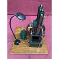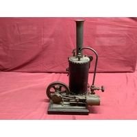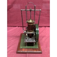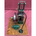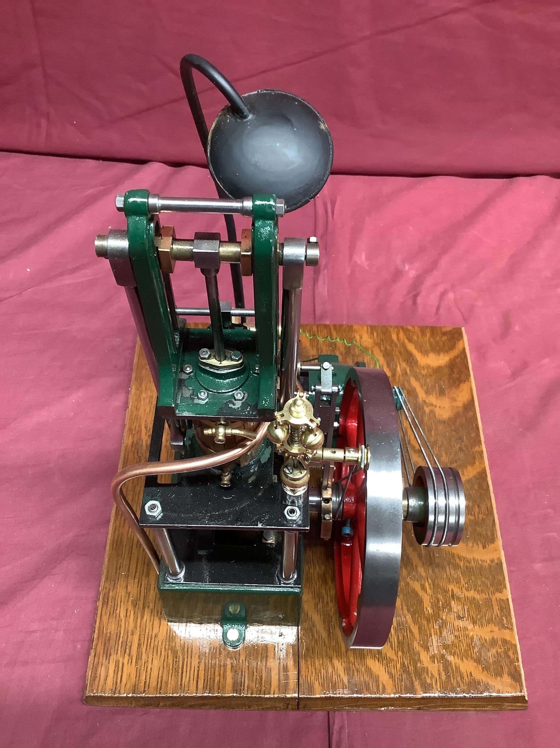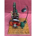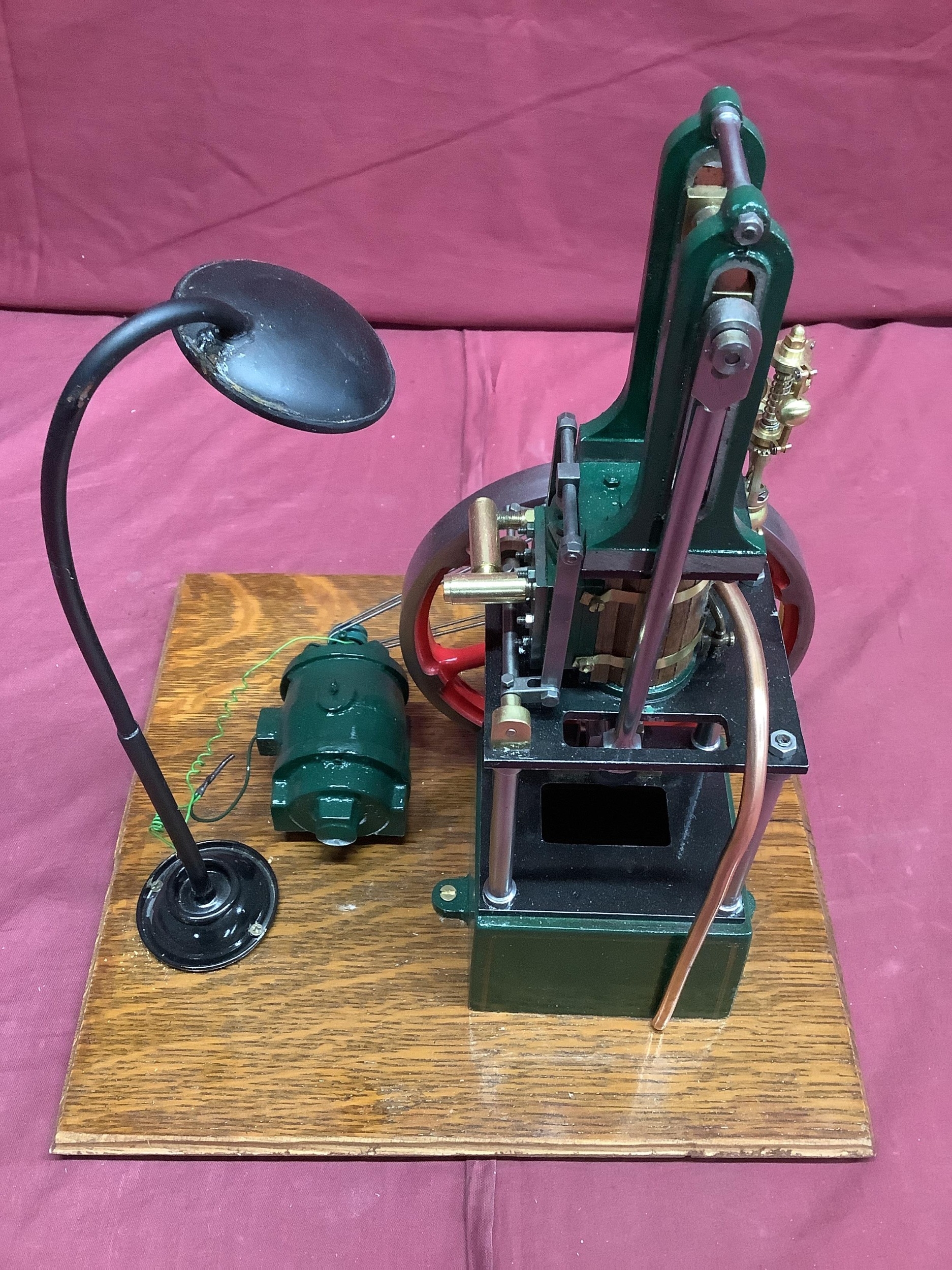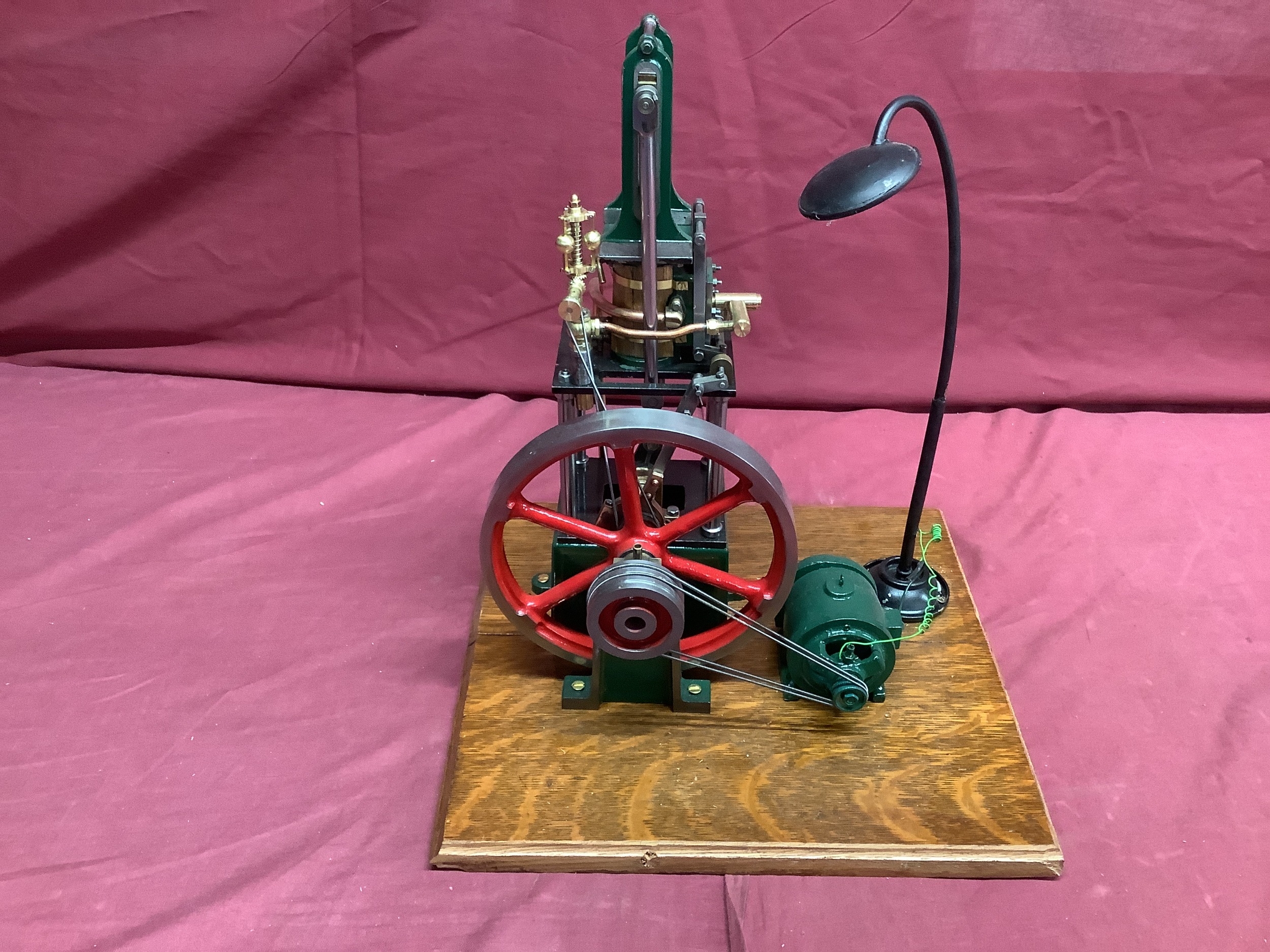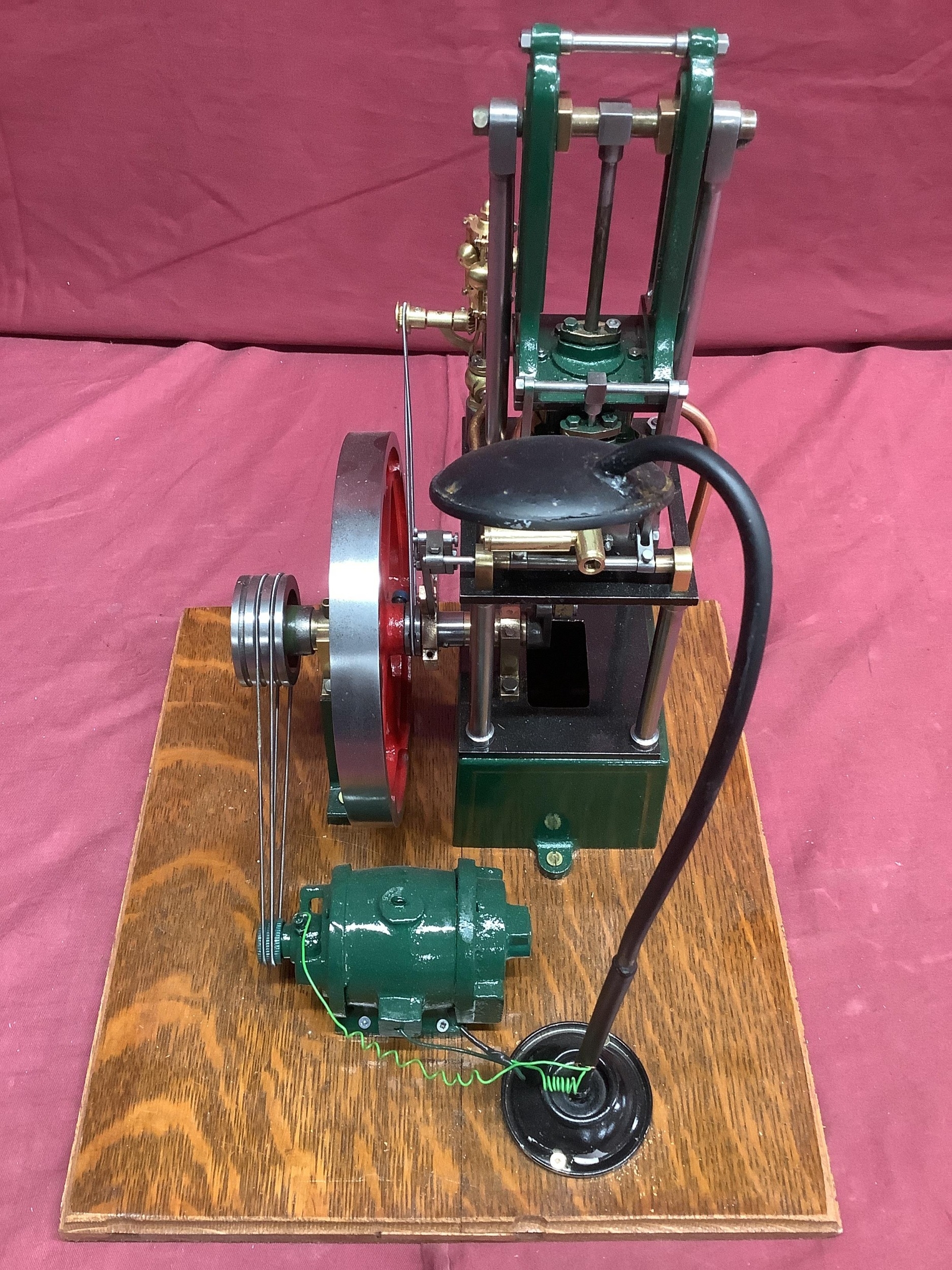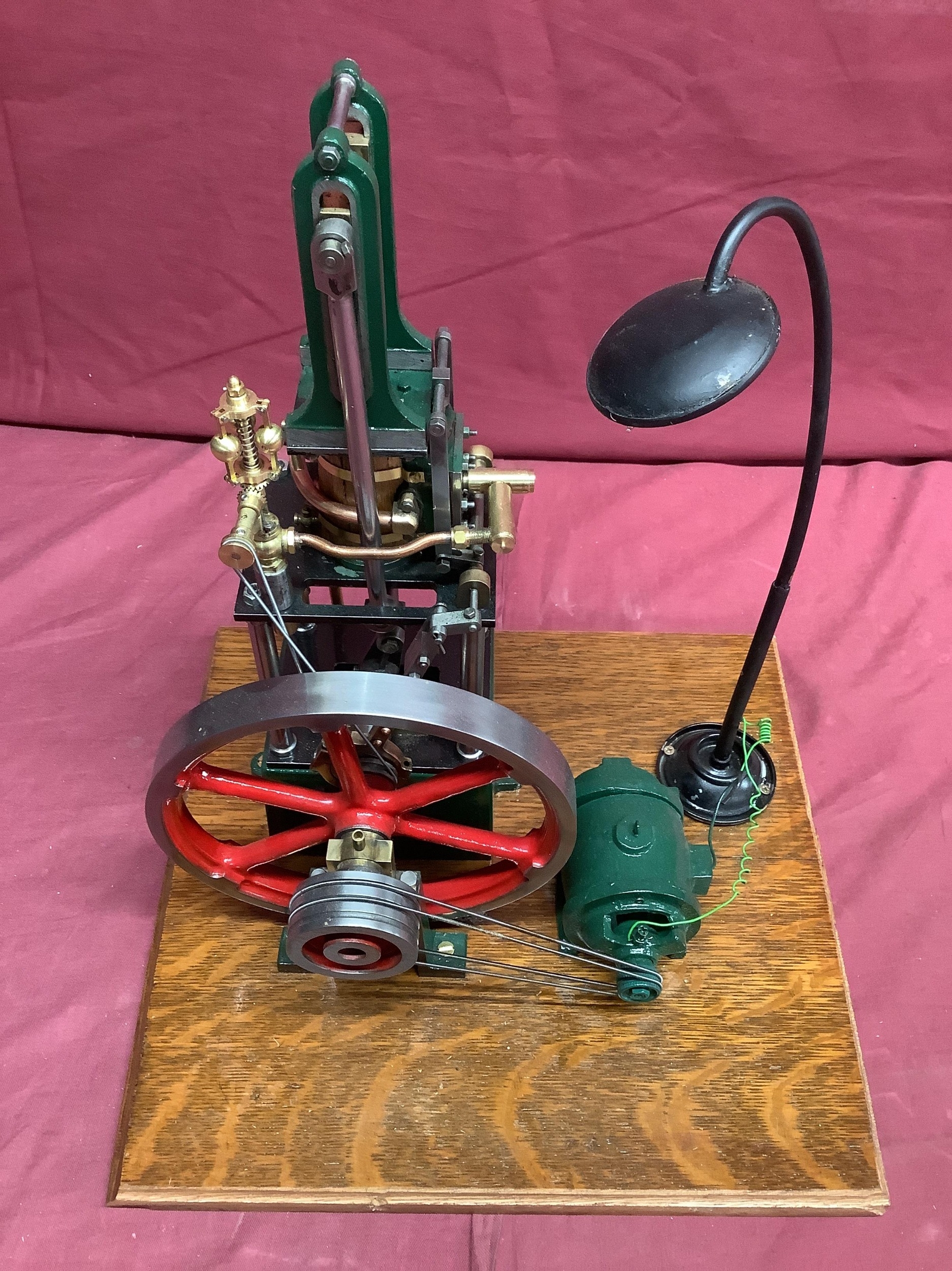 A Stuart Models James Coombes Live Steam Vertical Engine (Based On An Engine That Operated For a Century within a Bristol Colliery); single cladded cylinder with one inch (1") bore and two inch (2") stroke, flyball governor, six spoke seven inch (7") flywheel and a small generator operating a overhead yard lantern, model finished in dark green, red and bright metal, dimensions, seven by seven inch, fourteen inch high, all mounted to a 12 x 13 inch varnished wood base, very good condition.