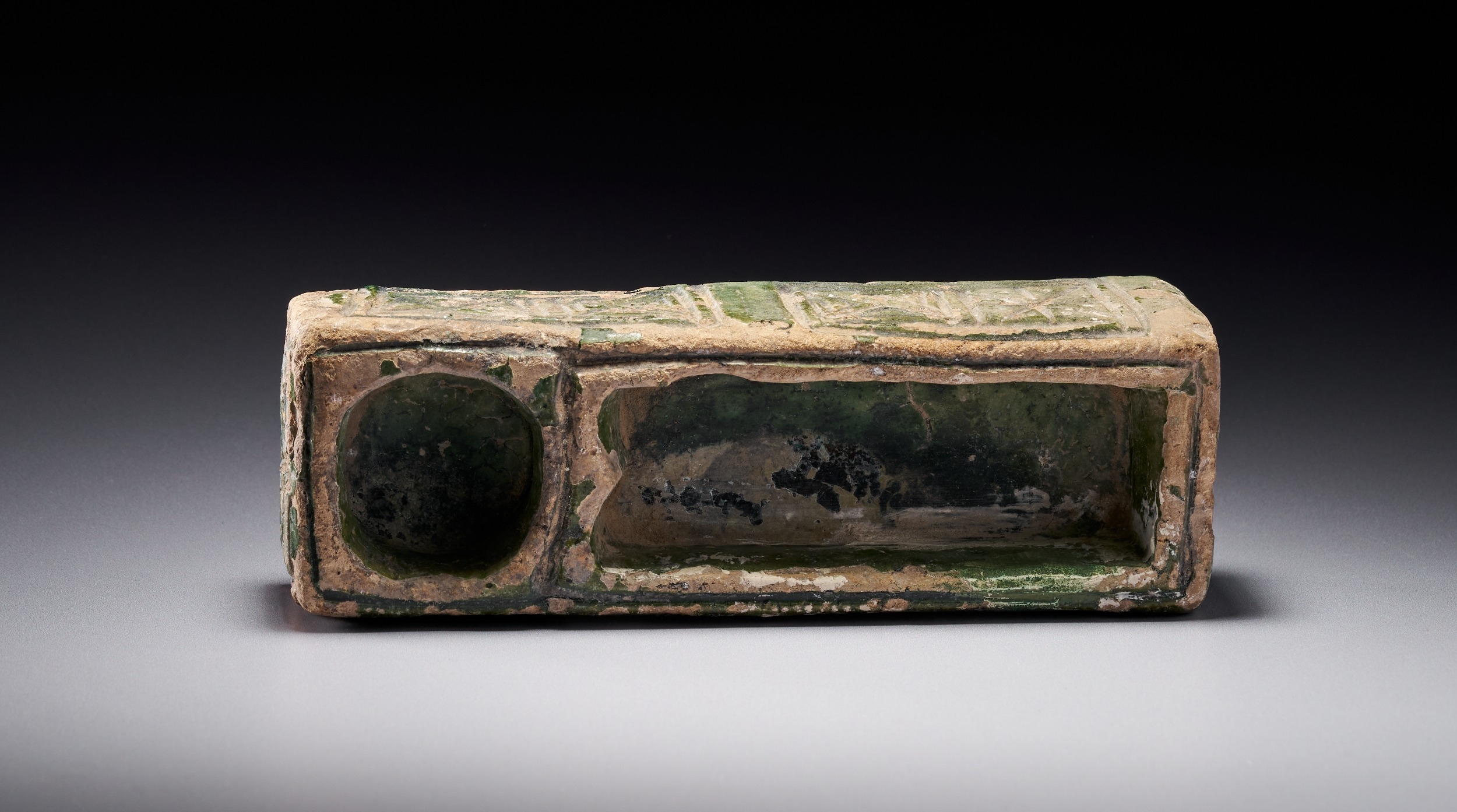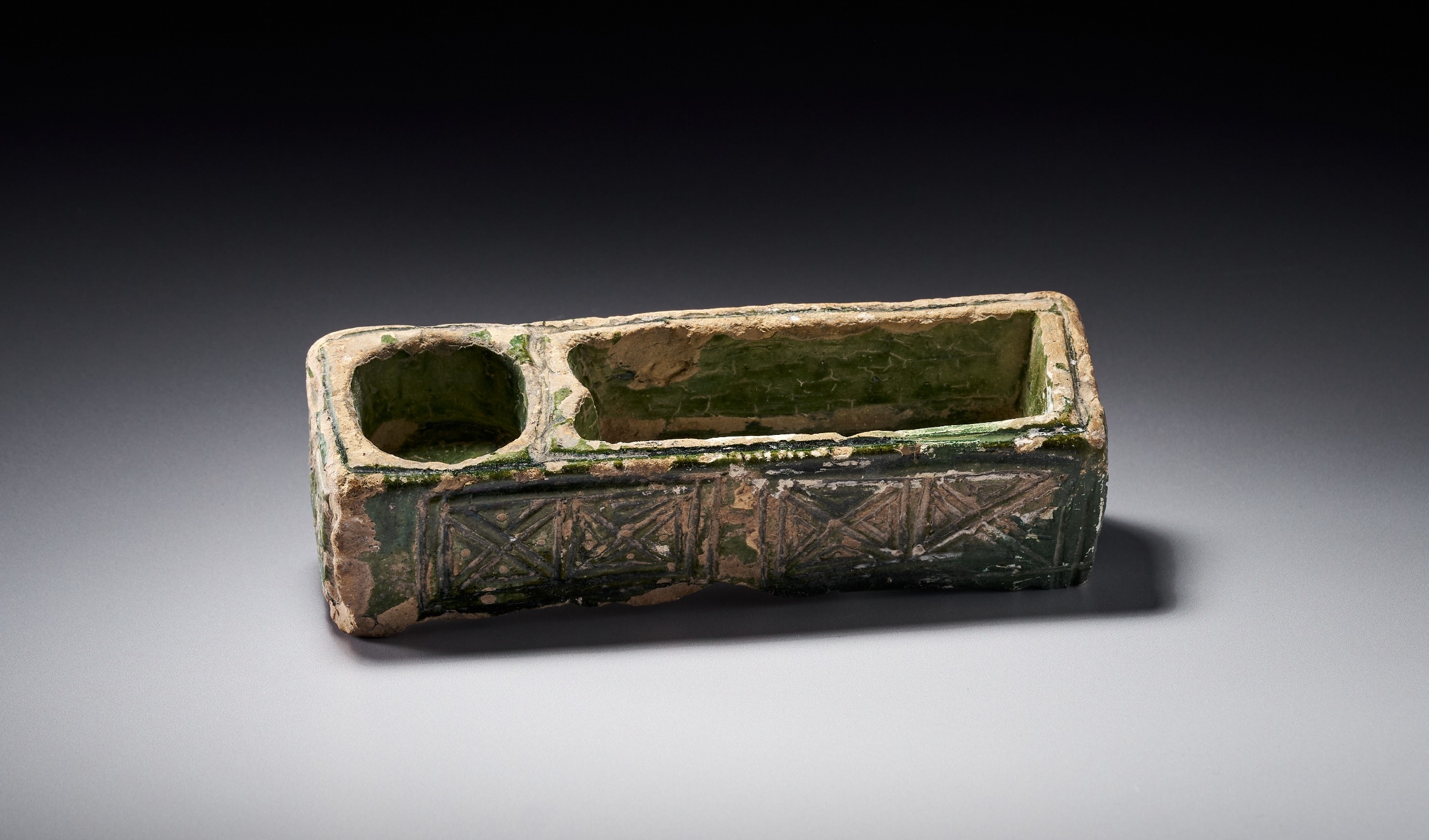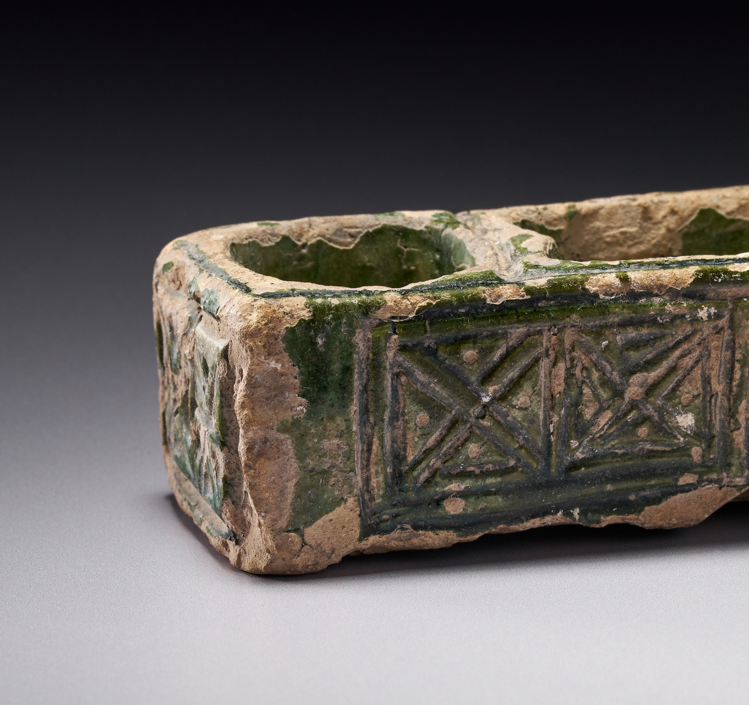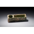 A RARE AND UNIQUE GREEN-GLAZED UMAYYAD MOLDED CERAMIC WRITING TOOL , MESOPOTAMIA, 7TH-8TH CENTURY