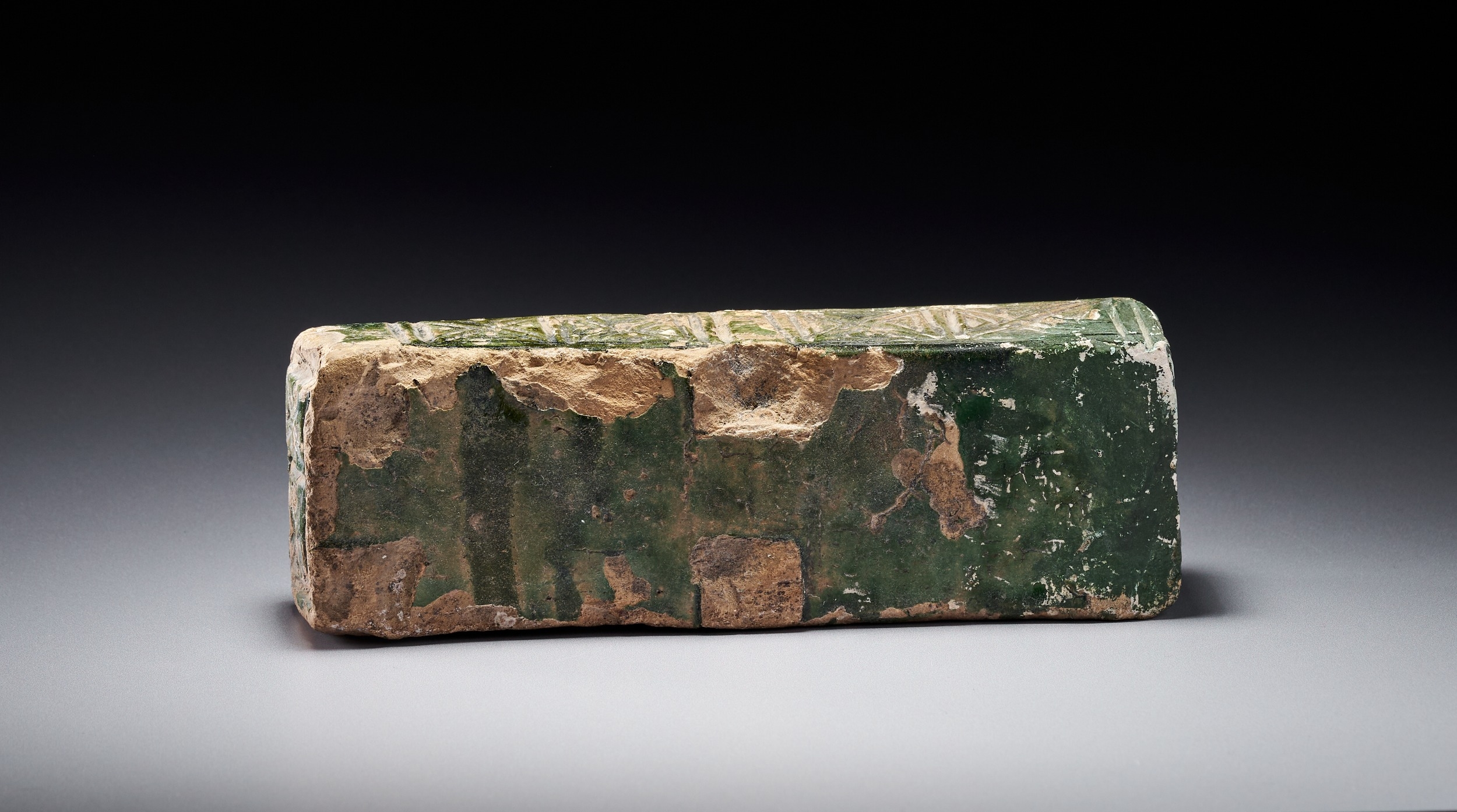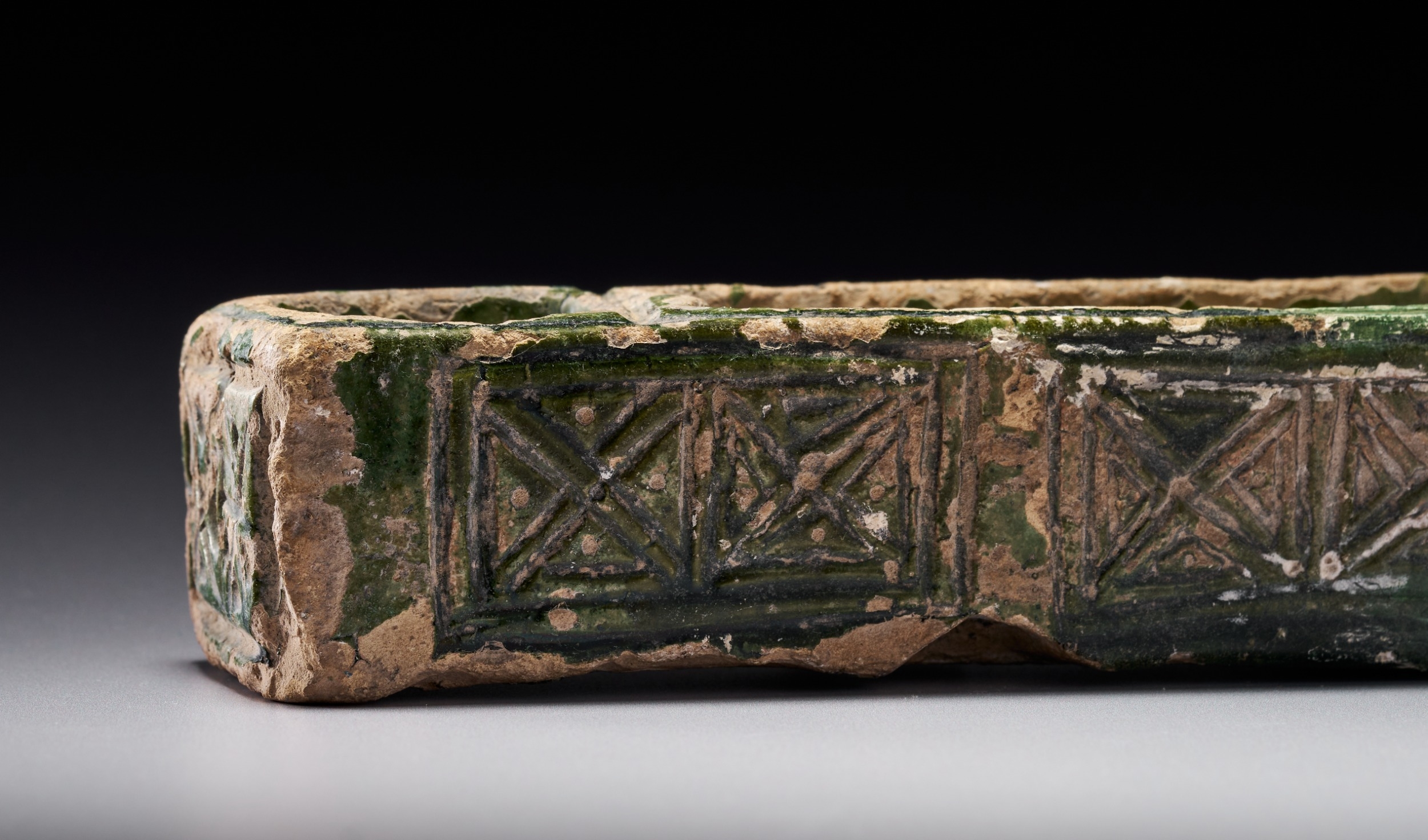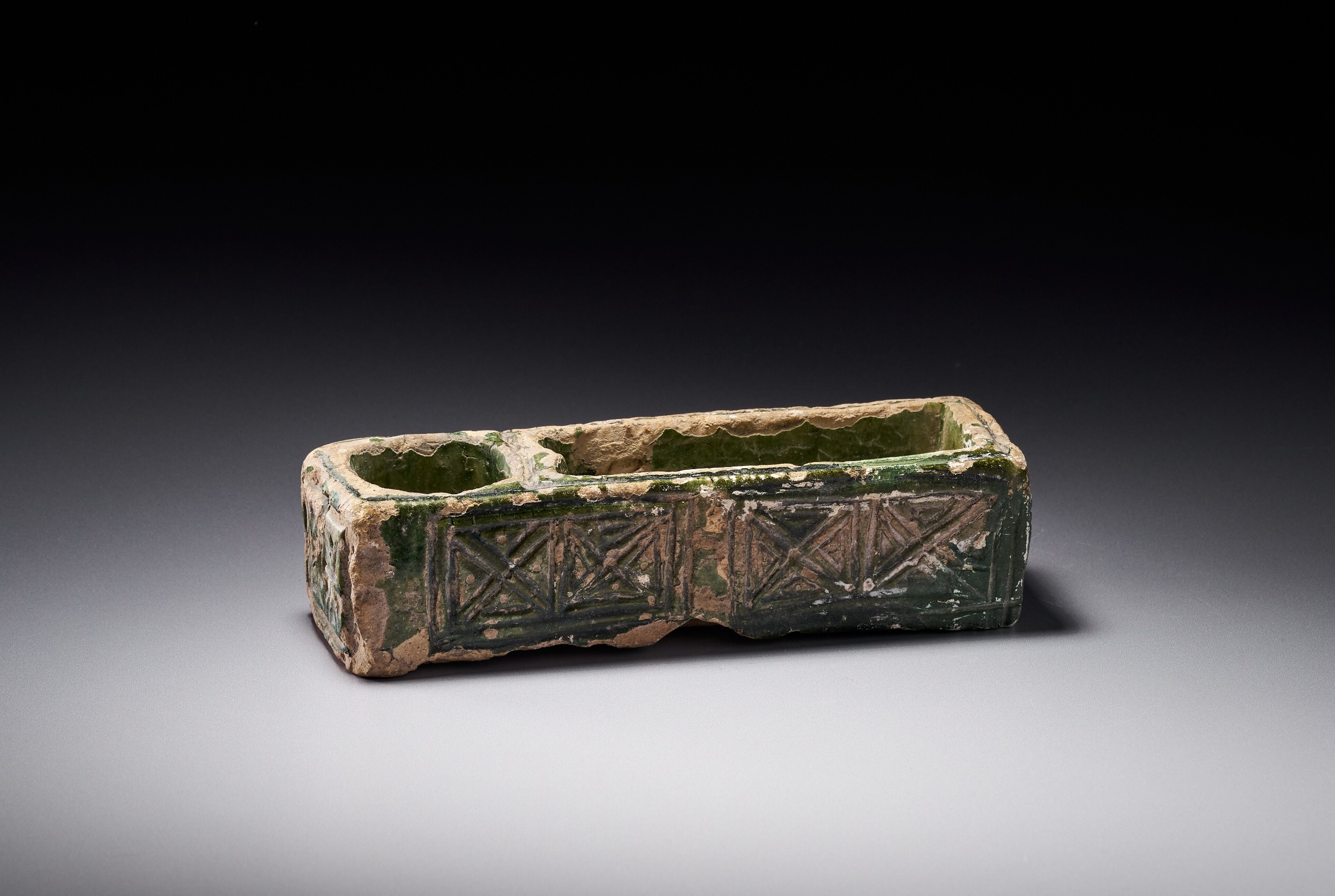 A RARE AND UNIQUE GREEN-GLAZED UMAYYAD MOLDED CERAMIC WRITING TOOL , MESOPOTAMIA, 7TH-8TH CENTURY