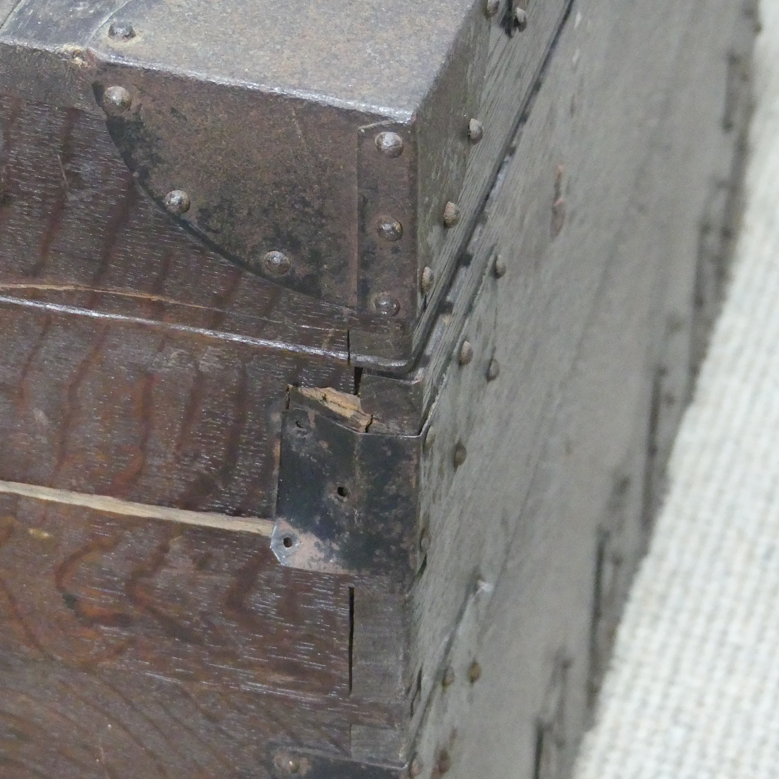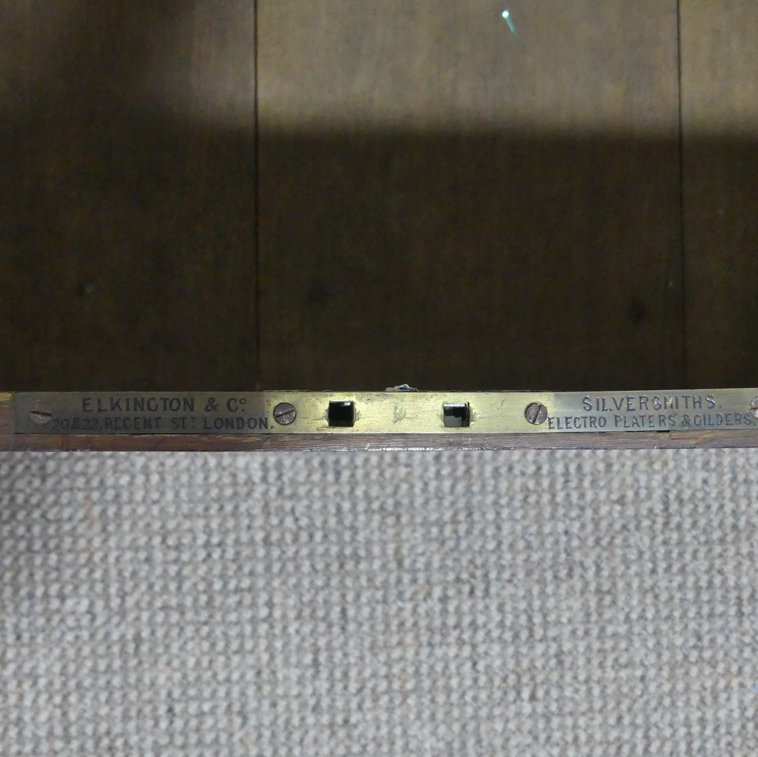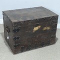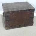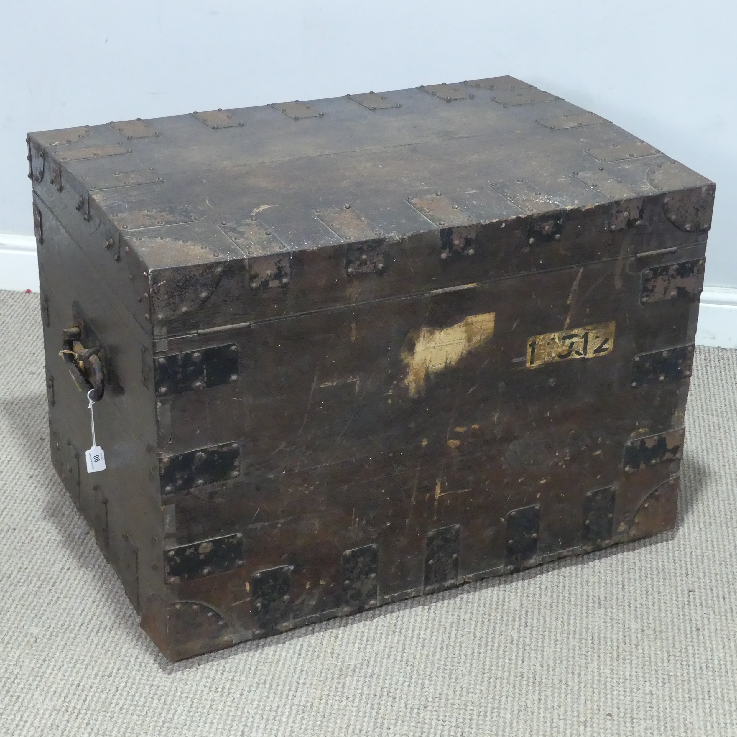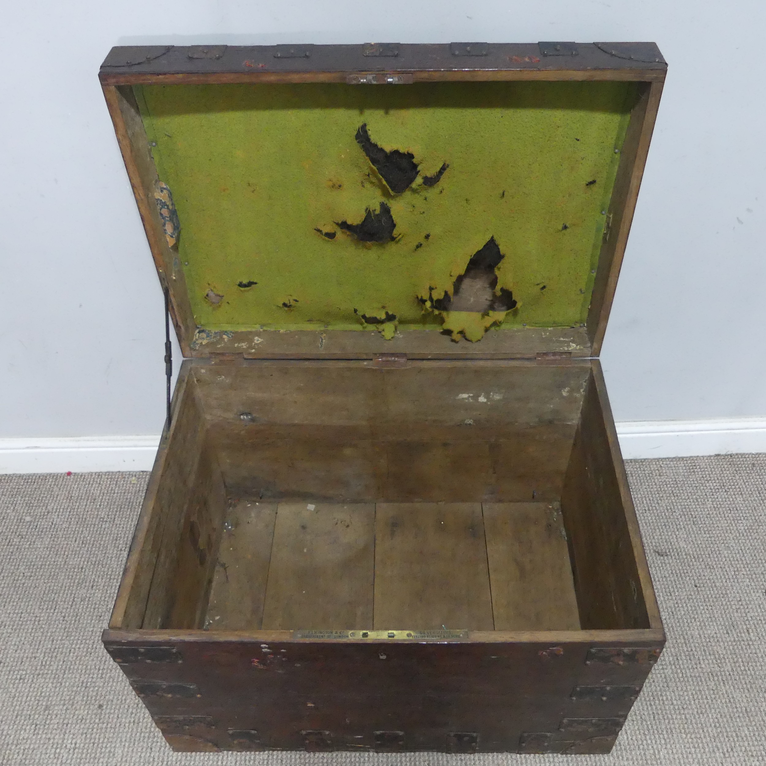 A late 19th/early 20th century brass bound oak silver Chest, by Elkington & Co, with brass swing handles, W 75 cm x H 55 cm x D 54 cm.