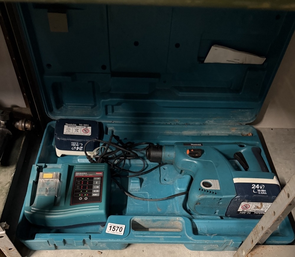 A working 24 volt Makita BHR200 hammer, drill & 2 batteries with charger & case