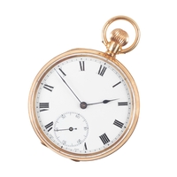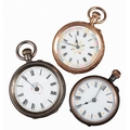 with keyless wind movement, white enamel dial, black Roman numerals, dark blue steel hands, with floral engraved decoration to the case, c. 24.65 grams gross weight, case diameter approx. 28mm; together with two silver case fob watches (3)