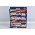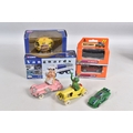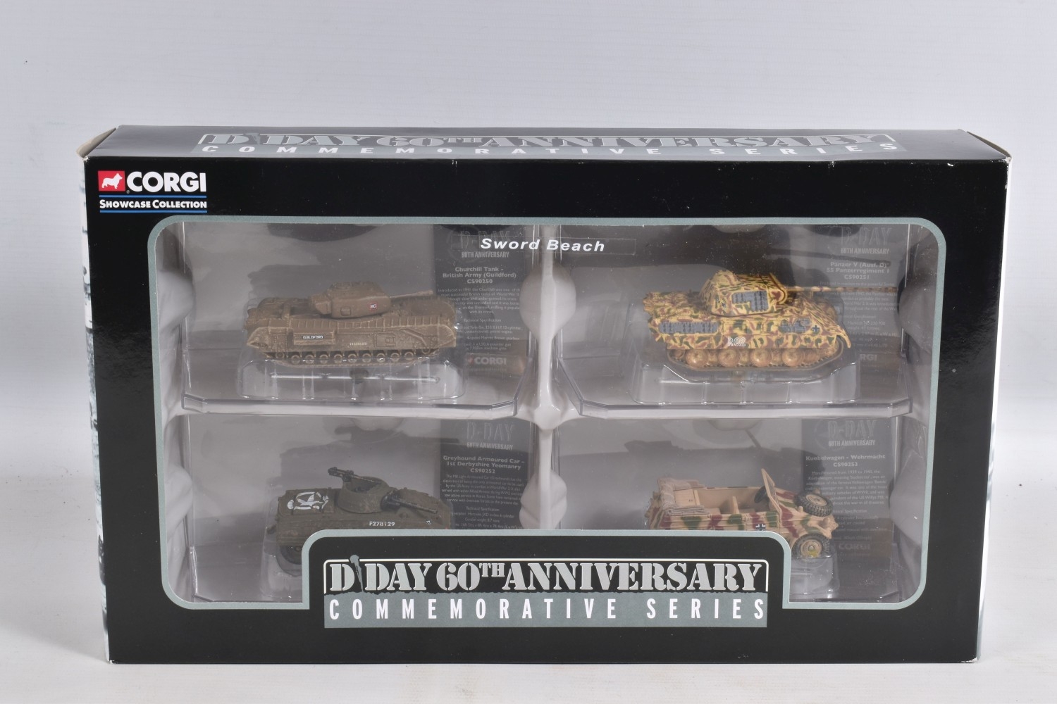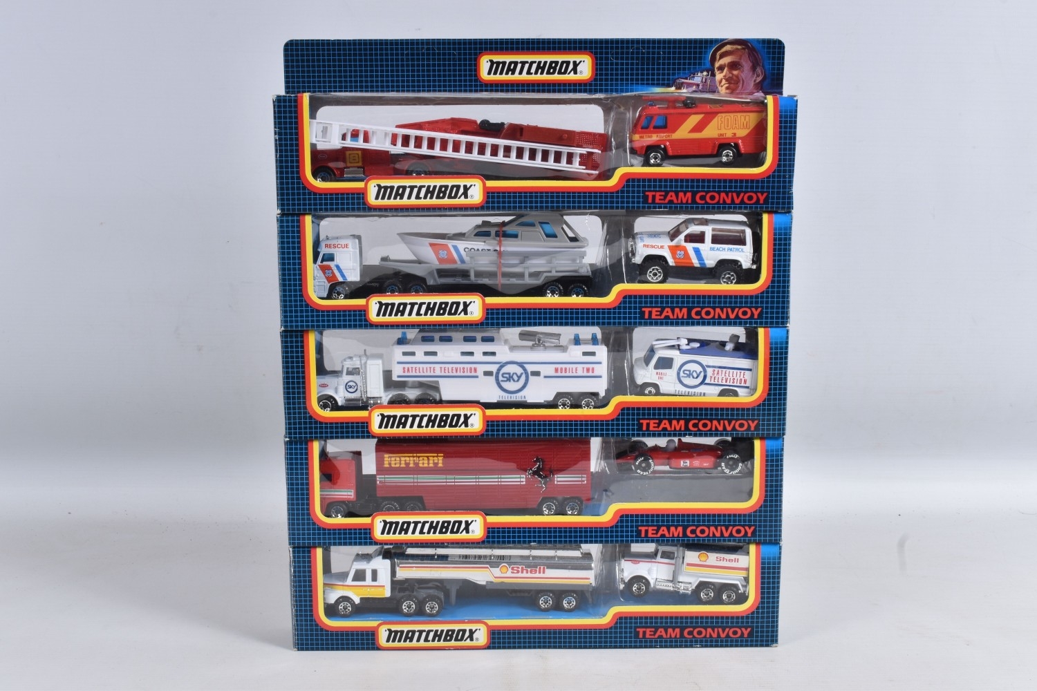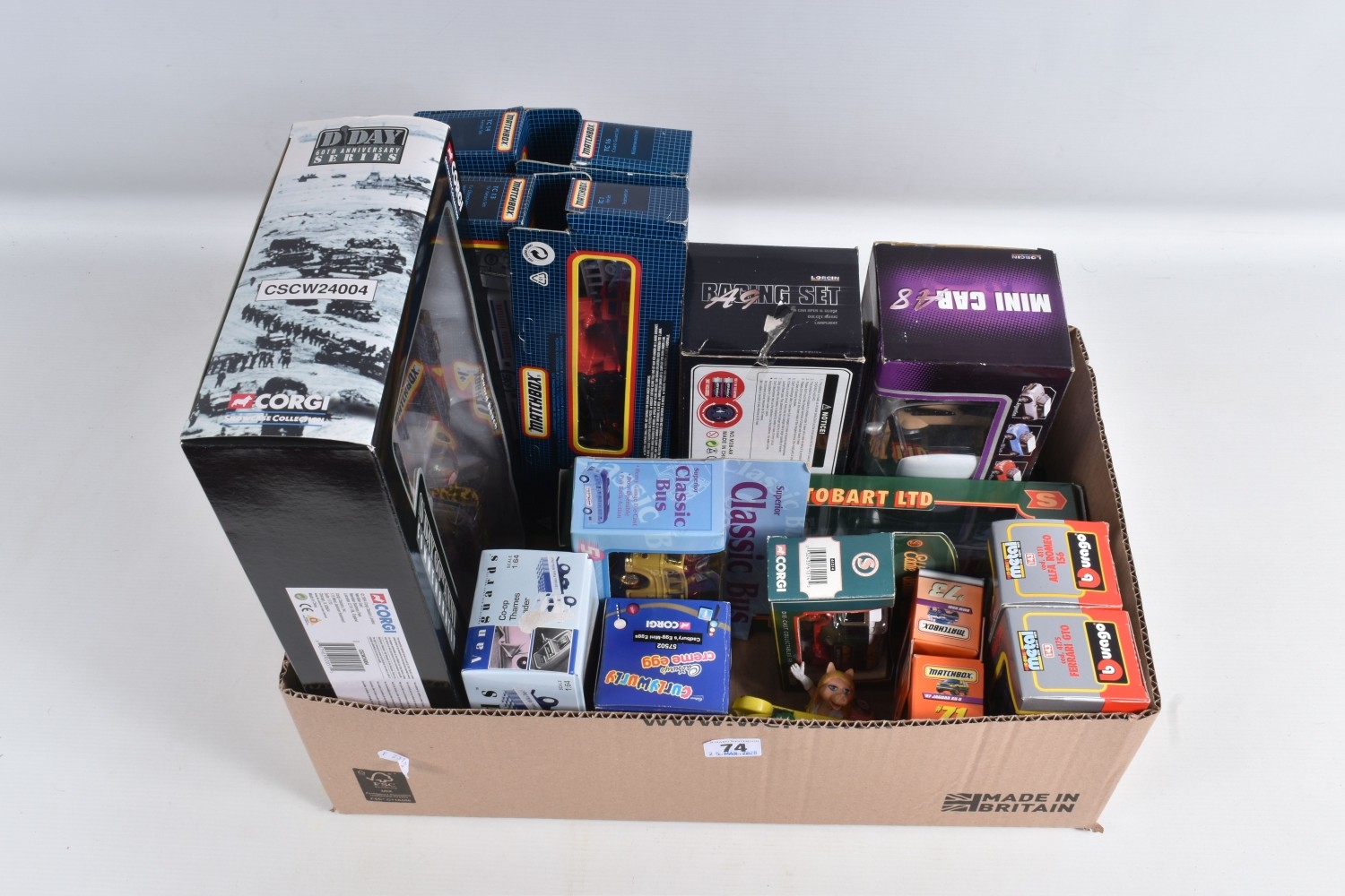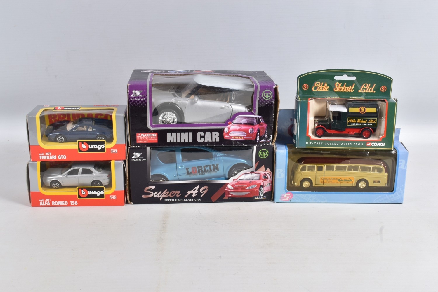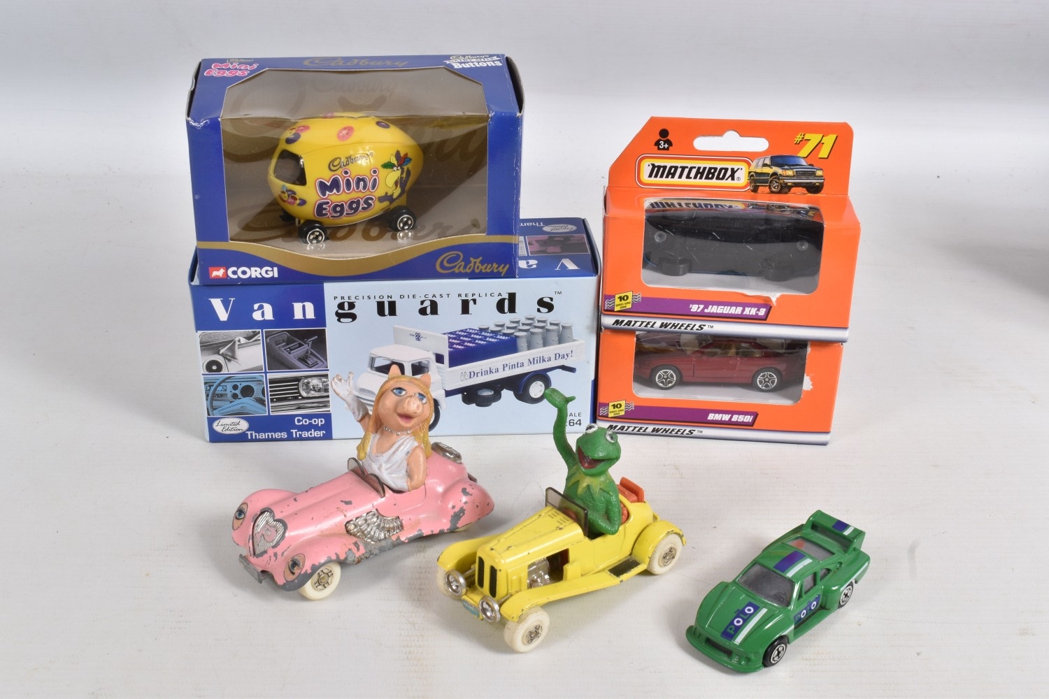 A SELECTION OF BOXED DIECAST MODELS, models by Corgi, Matchbox, Lorcin, Lledo Vanguards, Bburago, to include a Lorcin AG Racing Set Speed High-Class Car no. M38-A9 and a Lorcin Mini Car no. M38-A8, five Matchbox Team Convoy sets no. TC16, TC14, TC2, TC1 and TC13, a Corgi D Day 60th Anniversary Commemorative Series 'Sword Beach' no. CSCW24004, a Limited Edition Lledo Vanguards Co-op Thames Trader, two Corgi Eddie Stobart models, a Scania Curtainside Trailer no. 59503 and an Express Haulage no. 61214, two Bburago models, a Ferrari GTO no. 4175 and an Alfa Romeo 156 no. 4111, two Matchbox Mattel Wheels, a BMW 850i no. 73 and a '97 Jaguar XK-8 no. 71, also included is a Corgi Cadbury's Mini Eggs no. 57502, a Superior Bus no. SS5856W, and three loose Corgi models, a 1979 The Muppets Miss Piggy car, a 1979 The Muppet Show Kermit the Frog car and a Porsche 935 Polo Green car, the boxed models appear in good condition, the loose models showing some paint loss and playworn, the outer cardboard boxes show signs of wear on corners and edges, the plastic windows have slight creasing, contents have not been checked for completeness
