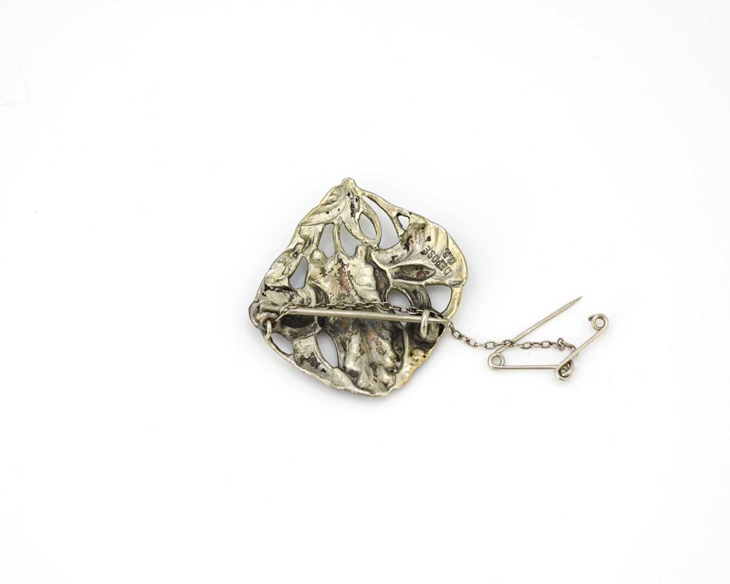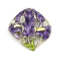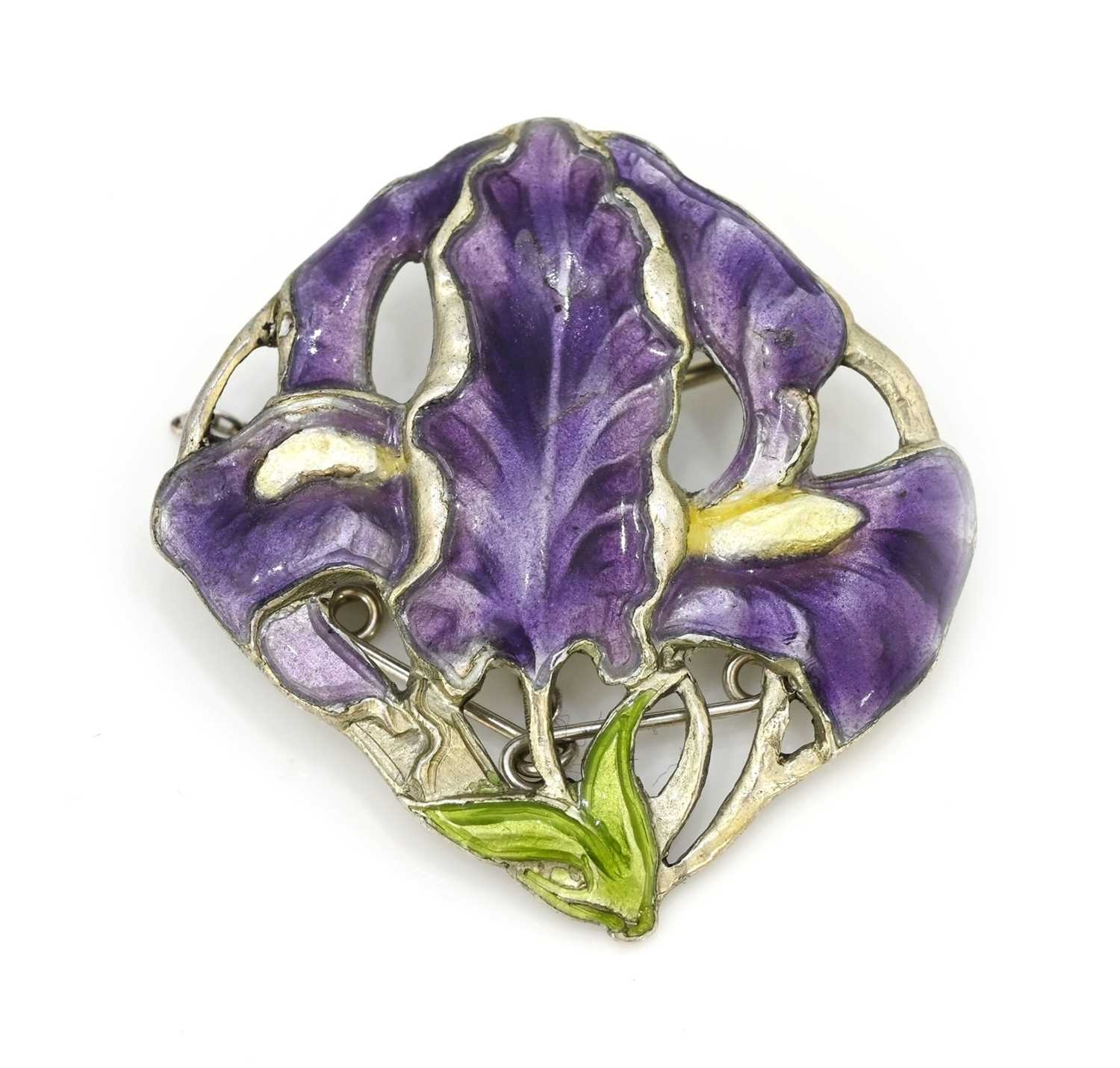An Art Nouveau silver and enamelled brooch, cast and reticulated in the form of an iris, with polychrome enamel, stamped marks Depose DR, 3cm