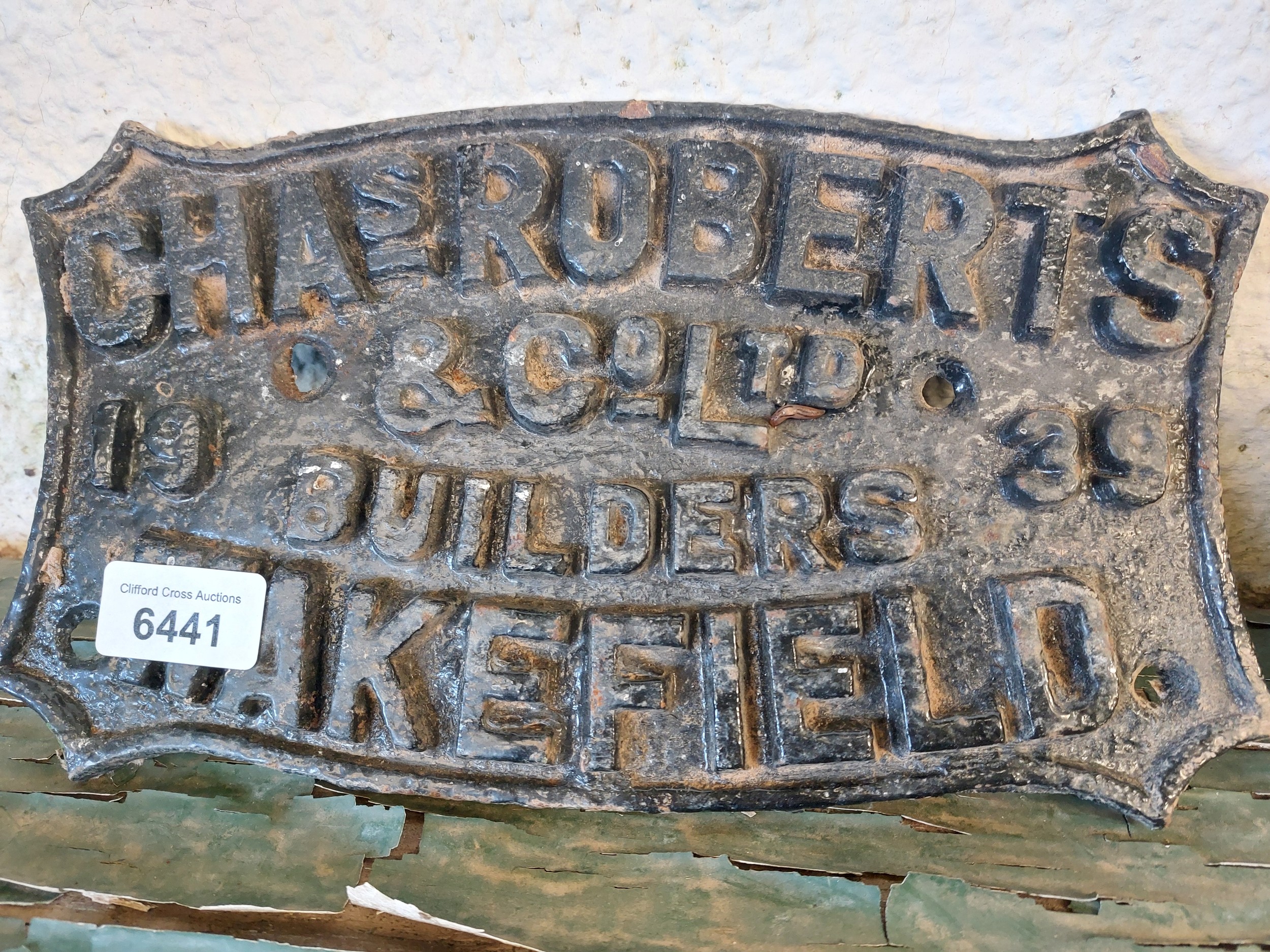 A cast iron plaque of CHAS. Roberts & Co Builders of Wakefield 1939.