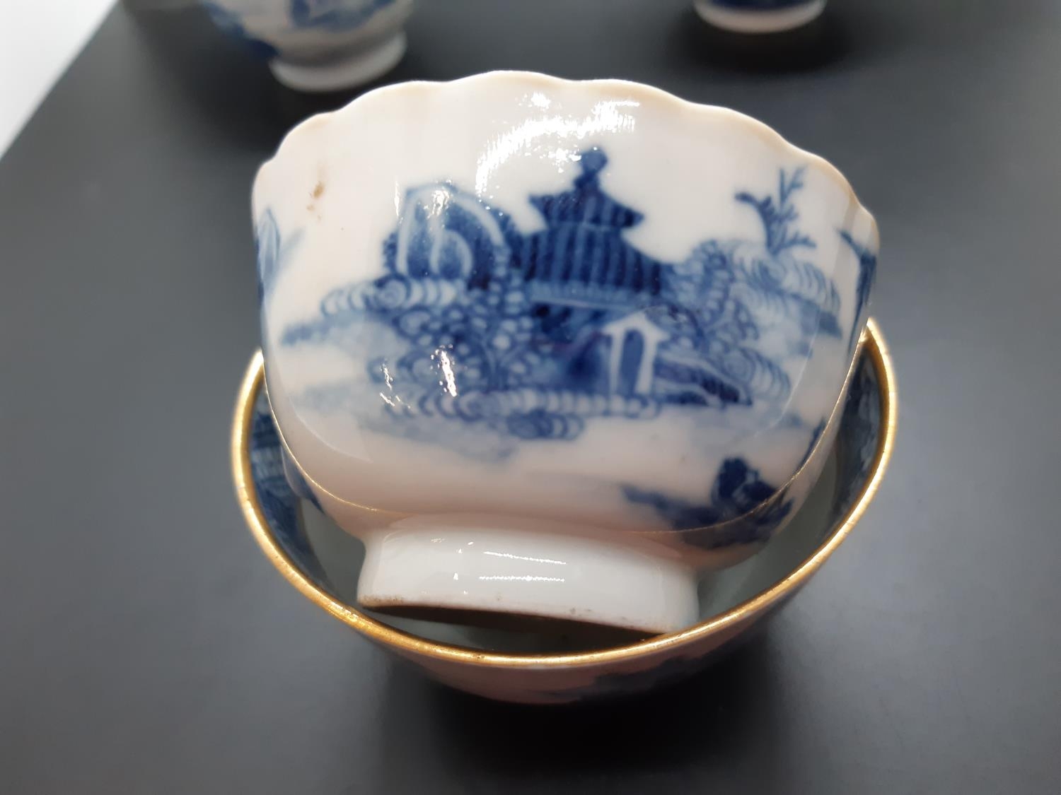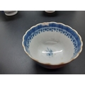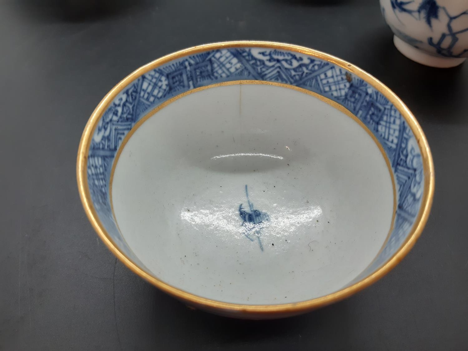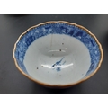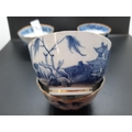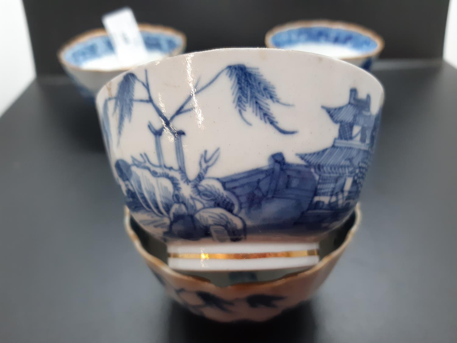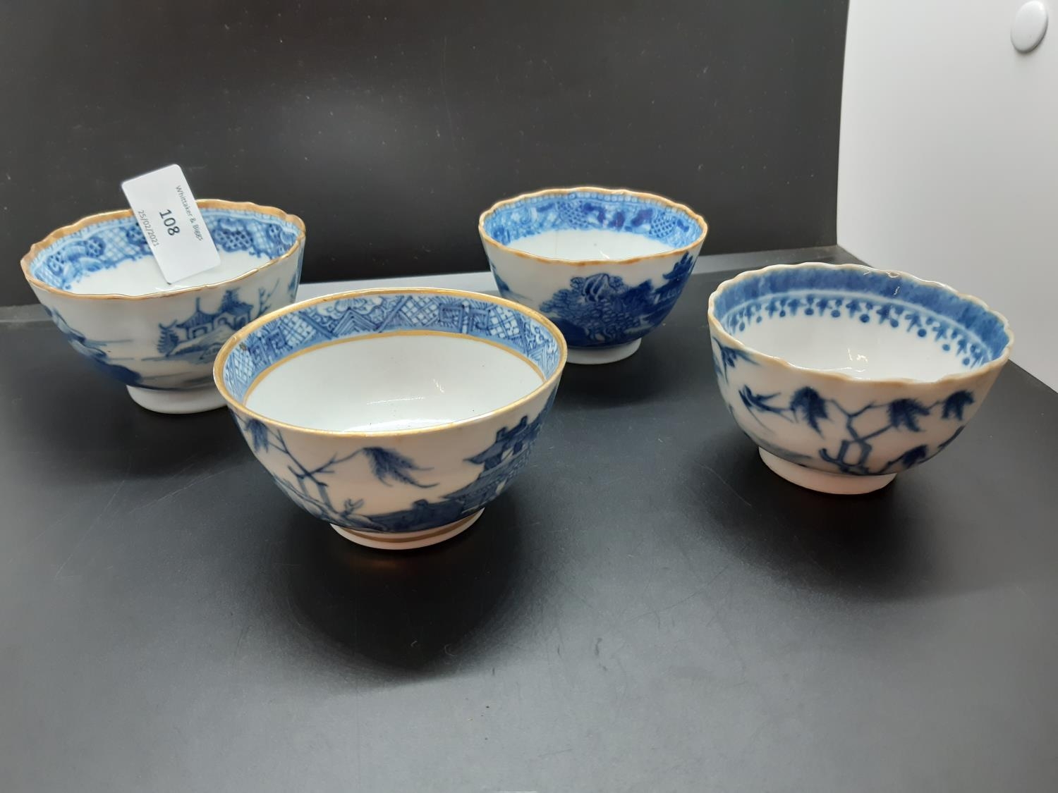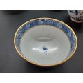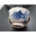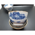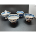 Four 19th century blue and white tea bowls, three having gilded rims