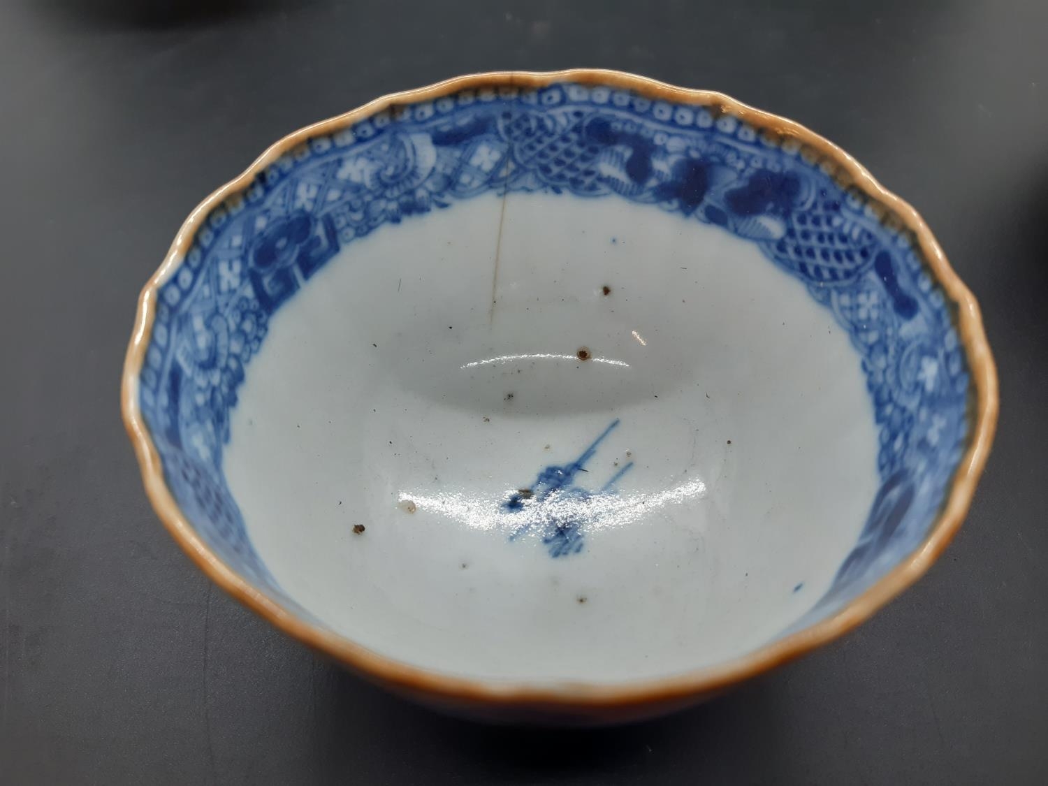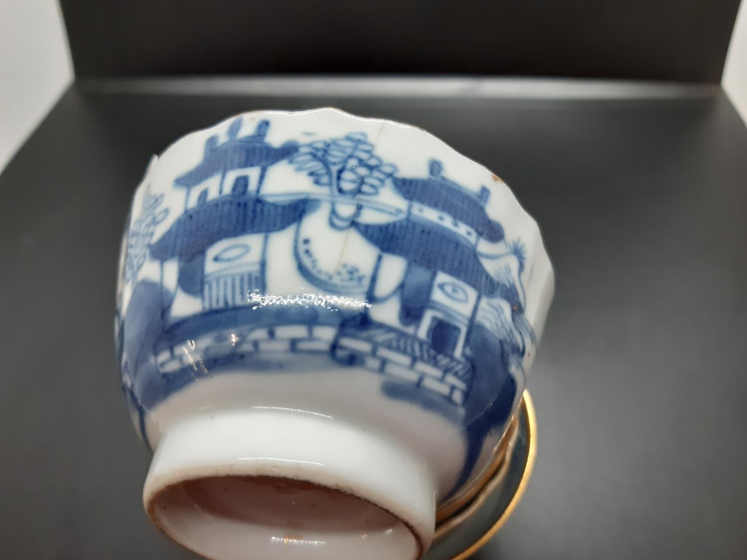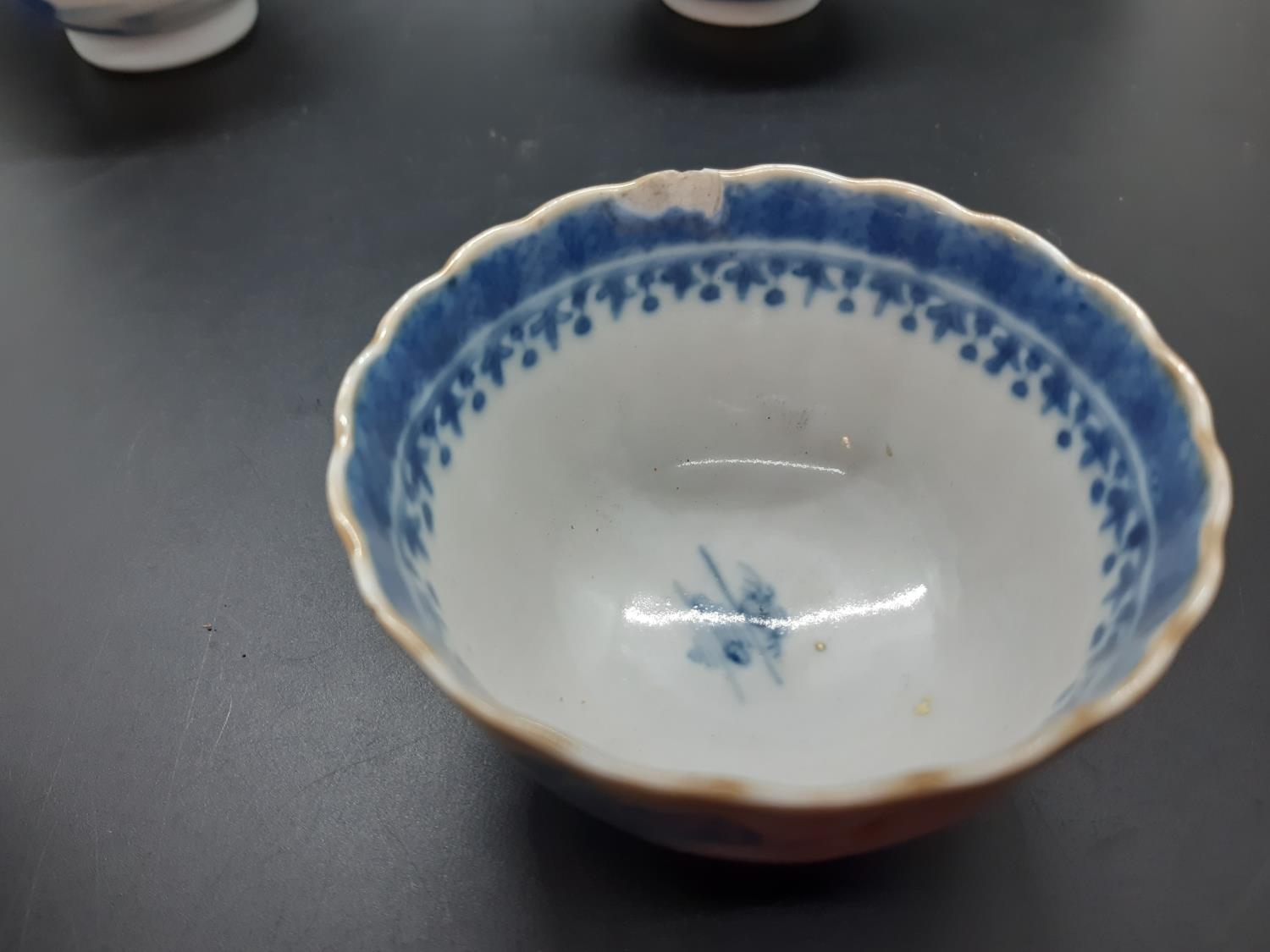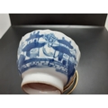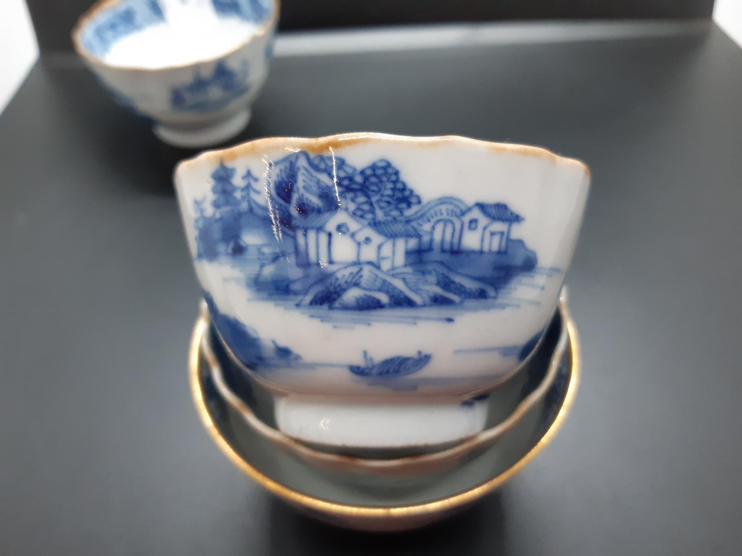 Four 19th century blue and white tea bowls, three having gilded rims